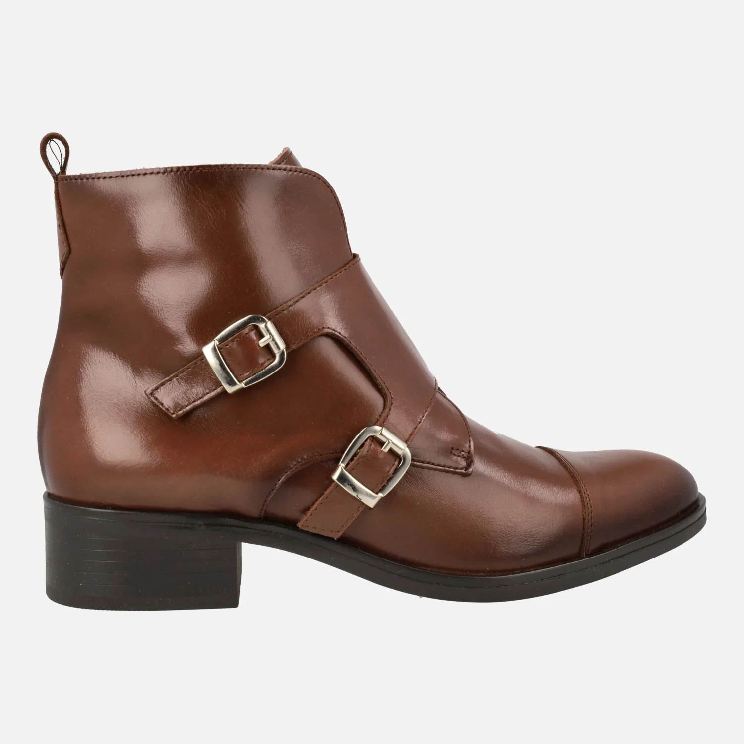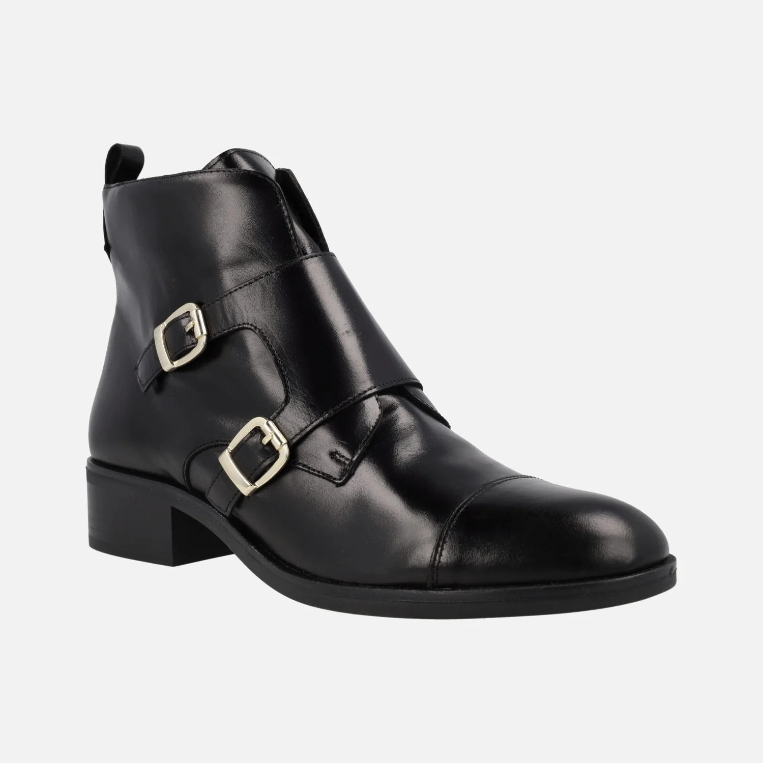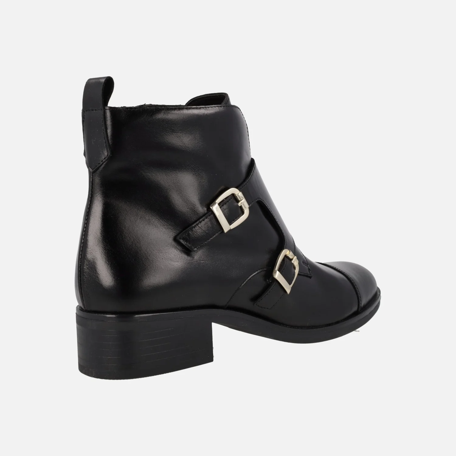Botines de piel para mujer de la marca española Funchal lady modelo 36006. Botines de piel, disponibles en negro y marrón, con detalle de hebillas en el lado exterior y cierre de cremallera en el lado interior. Detalle de tirador trasero para facilitar el calce. Forro textil, planta de piel. Caña de 12 cms de altura. Tacones de 3,5 cms de altura. Made in Spain.