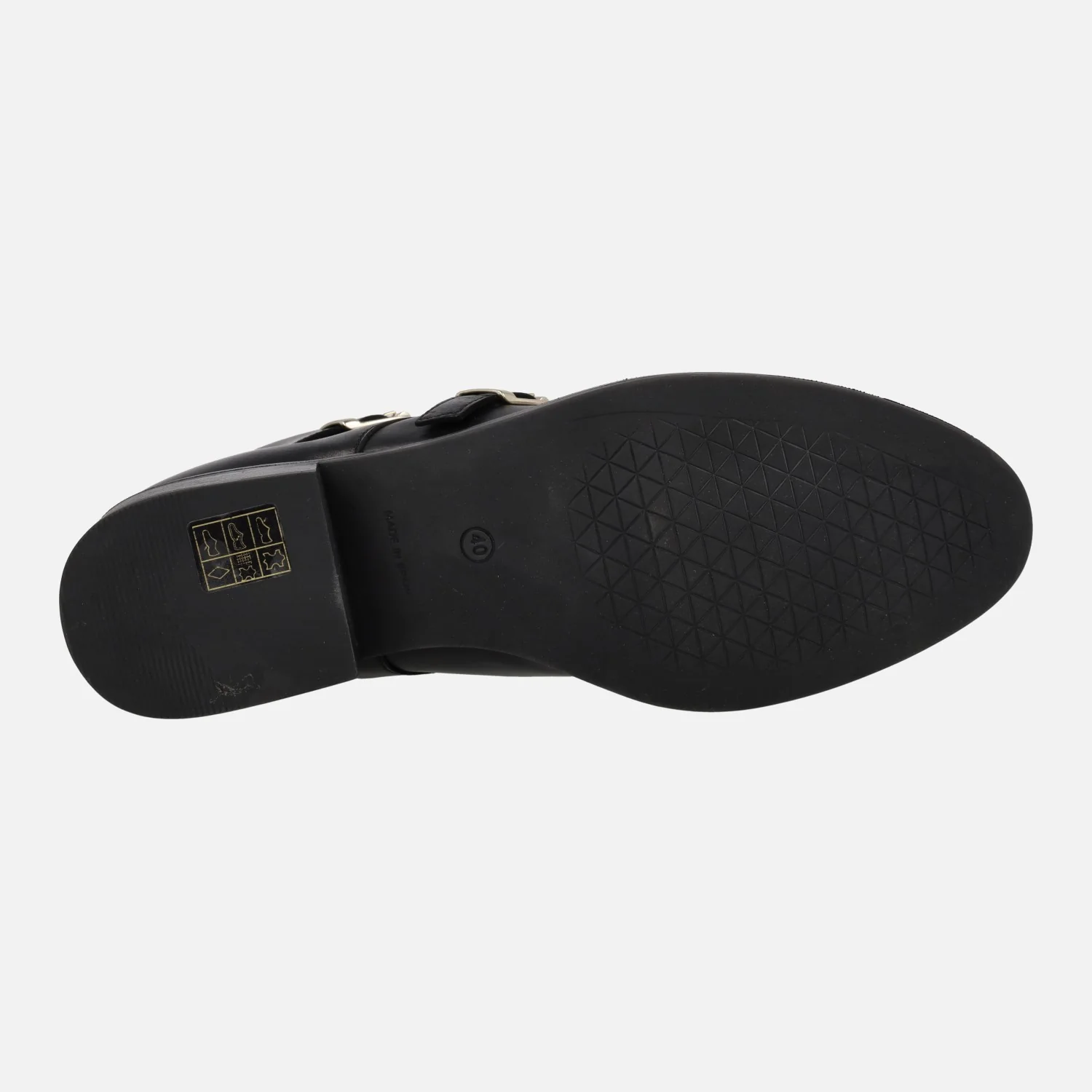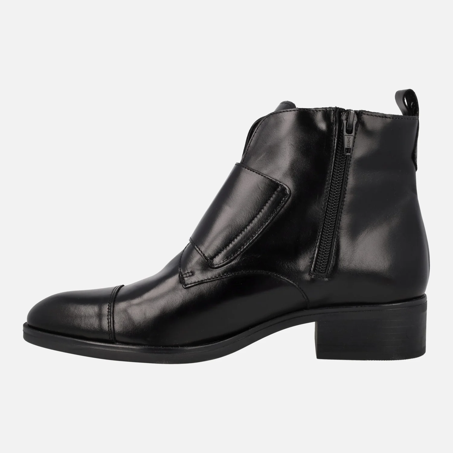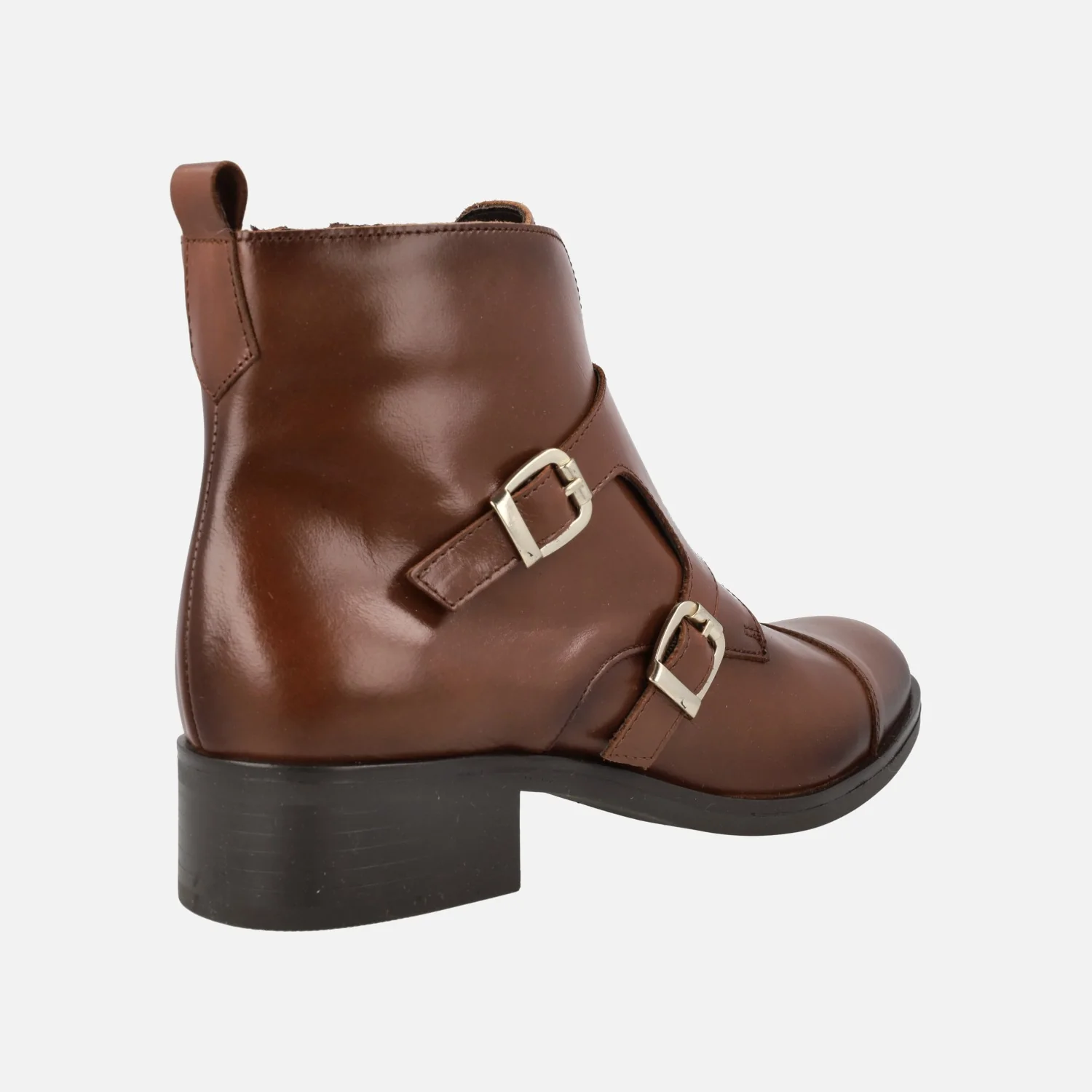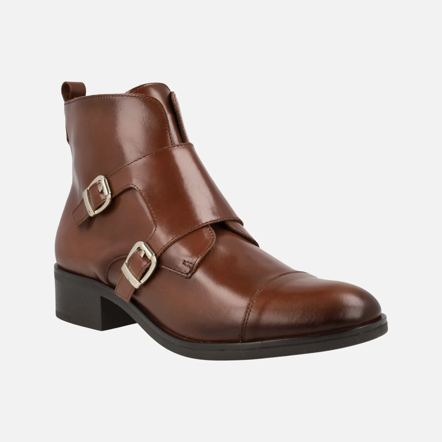Botines de piel para mujer de la marca española Funchal lady modelo 36006. Botines de piel, disponibles en negro y marrón, con detalle de hebillas en el lado exterior y cierre de cremallera en el lado interior. Detalle de tirador trasero para facilitar el calce. Forro textil, planta de piel. Caña de 12 cms de altura. Tacones de 3,5 cms de altura. Made in Spain.