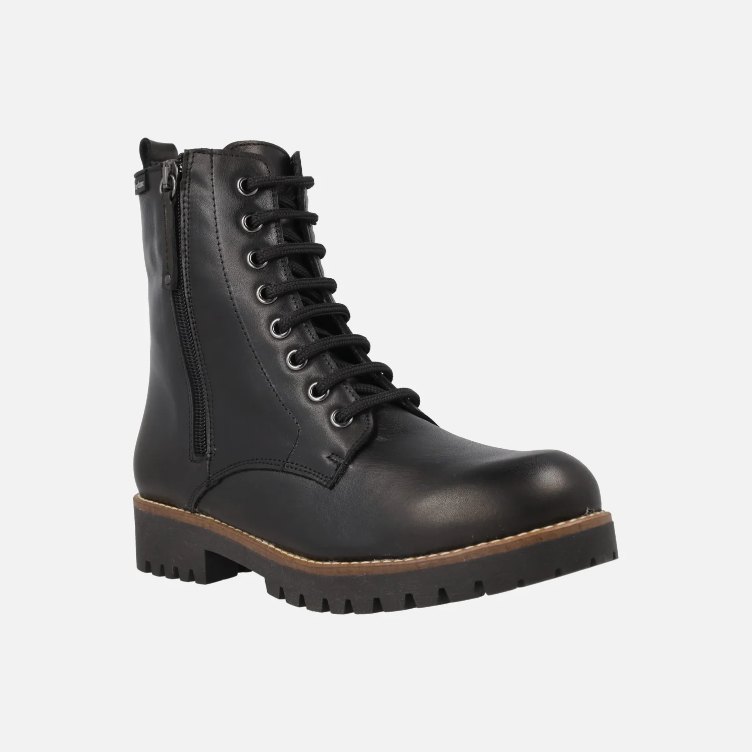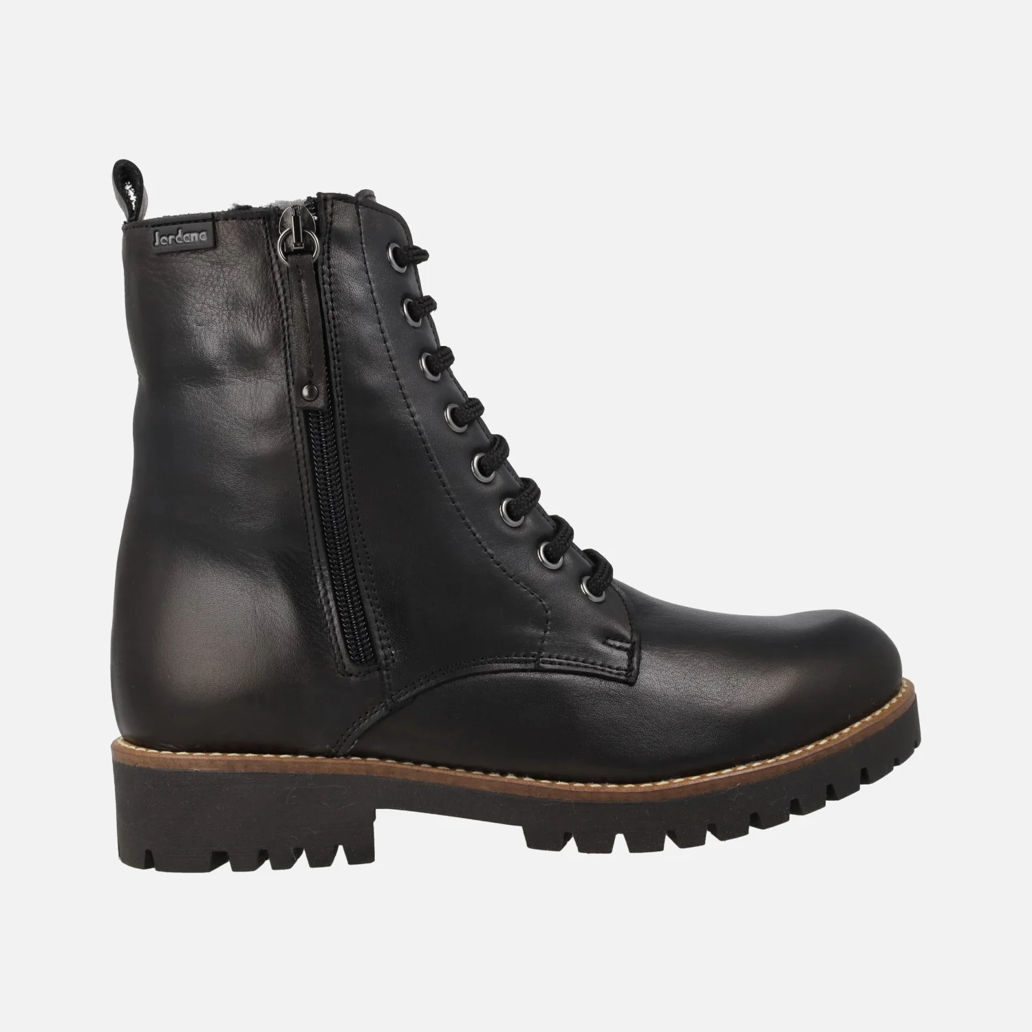 Botines para mujer de la marca Jordana, modelo 4323, disponibles en negro y en cuero. Botines de piel con cierre de cordones frontales además de cremallera en el lateral exterior. Interior en combinado de piel y otros materiales. Plantillas forradas de piel. Piso de goma estilo track. Caña de 15,5 cm de altura. Piso de 3,5 cm de altura trasera (2 cm parte delantera).