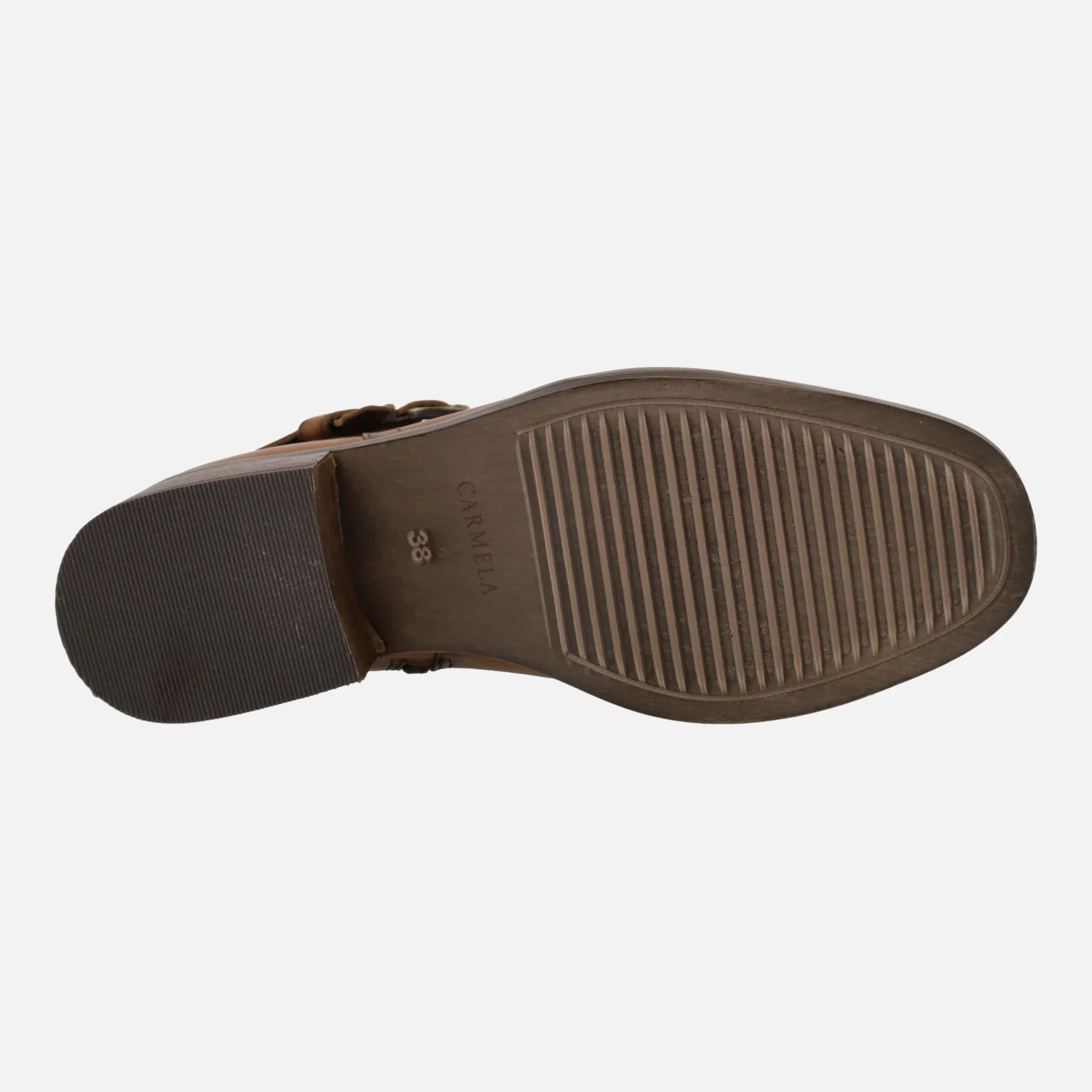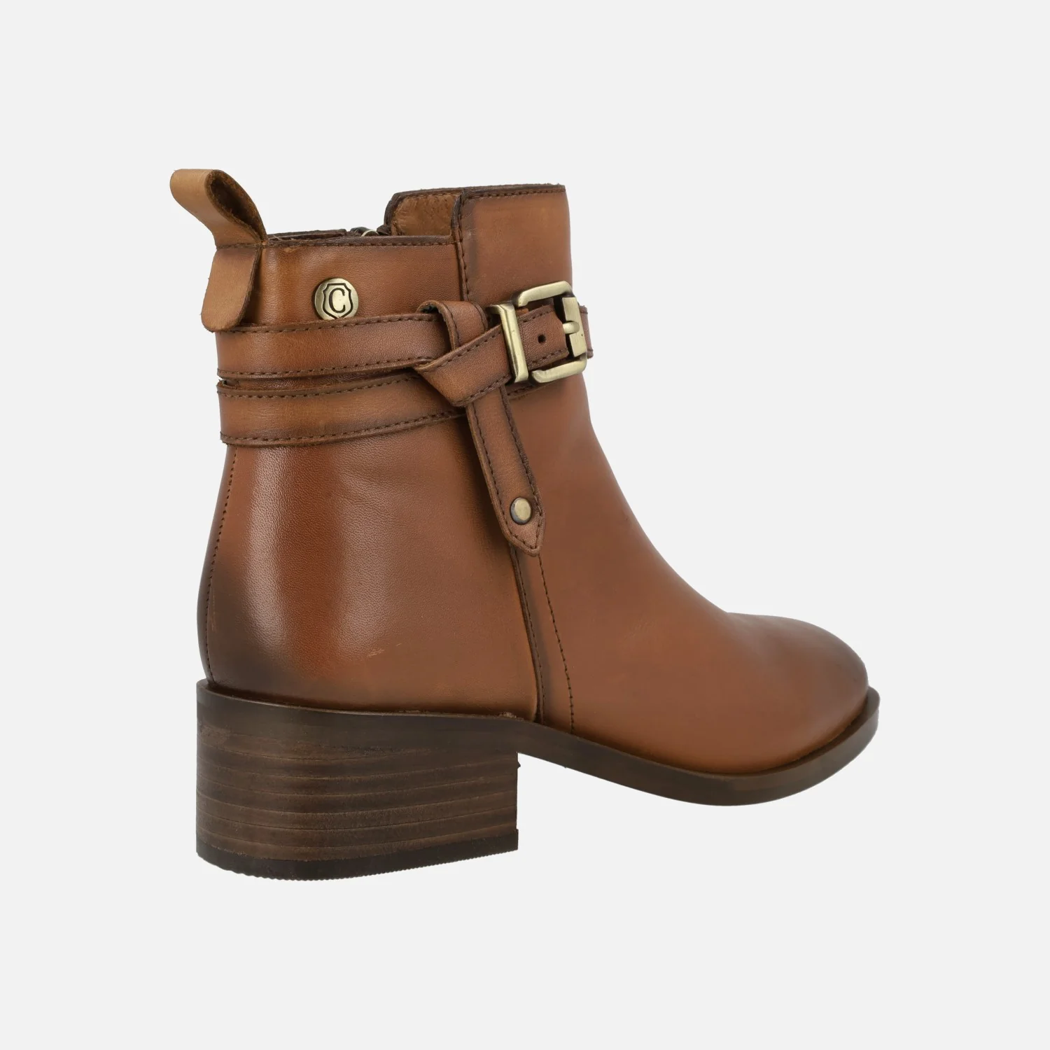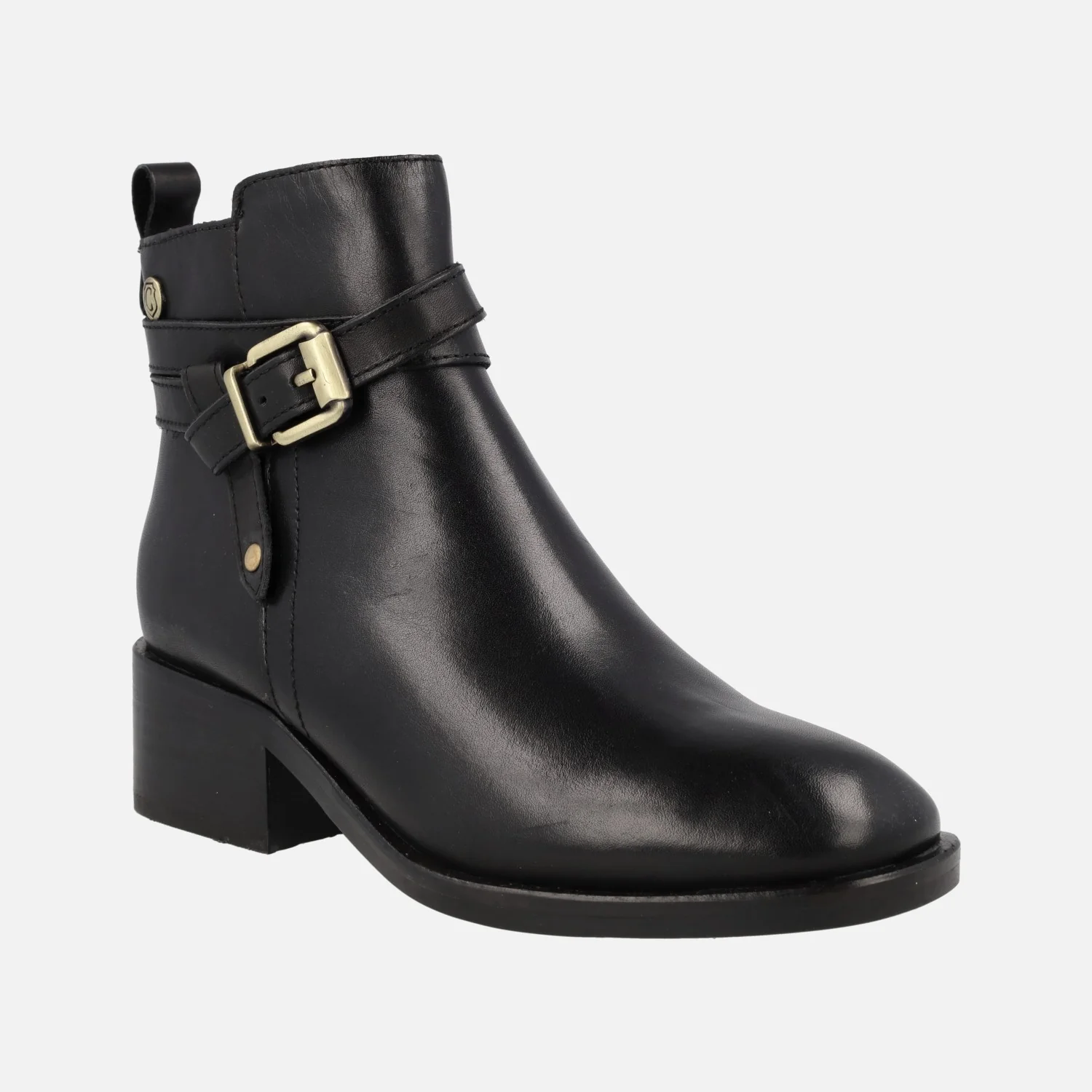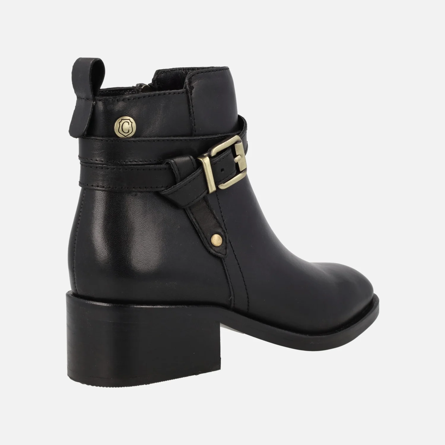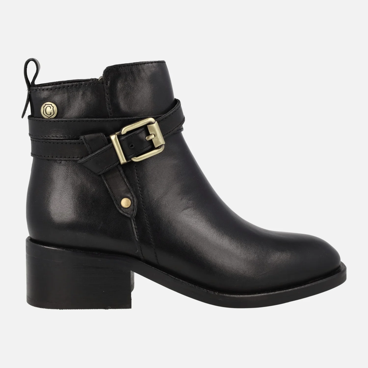 Elegantes botines de piel para mujer de la marca Carmela modelo 160951, disponibles en color camel o negros. Botines de piel con cierre de cremallera en el lado interior. Adorno de hebilla metálica y nudo. Detalle de tirador trasero para ayudar en el calce. Interior textil con planta de piel. Caña de 11,5 cms de altura. Tacones de 4,5 cms.