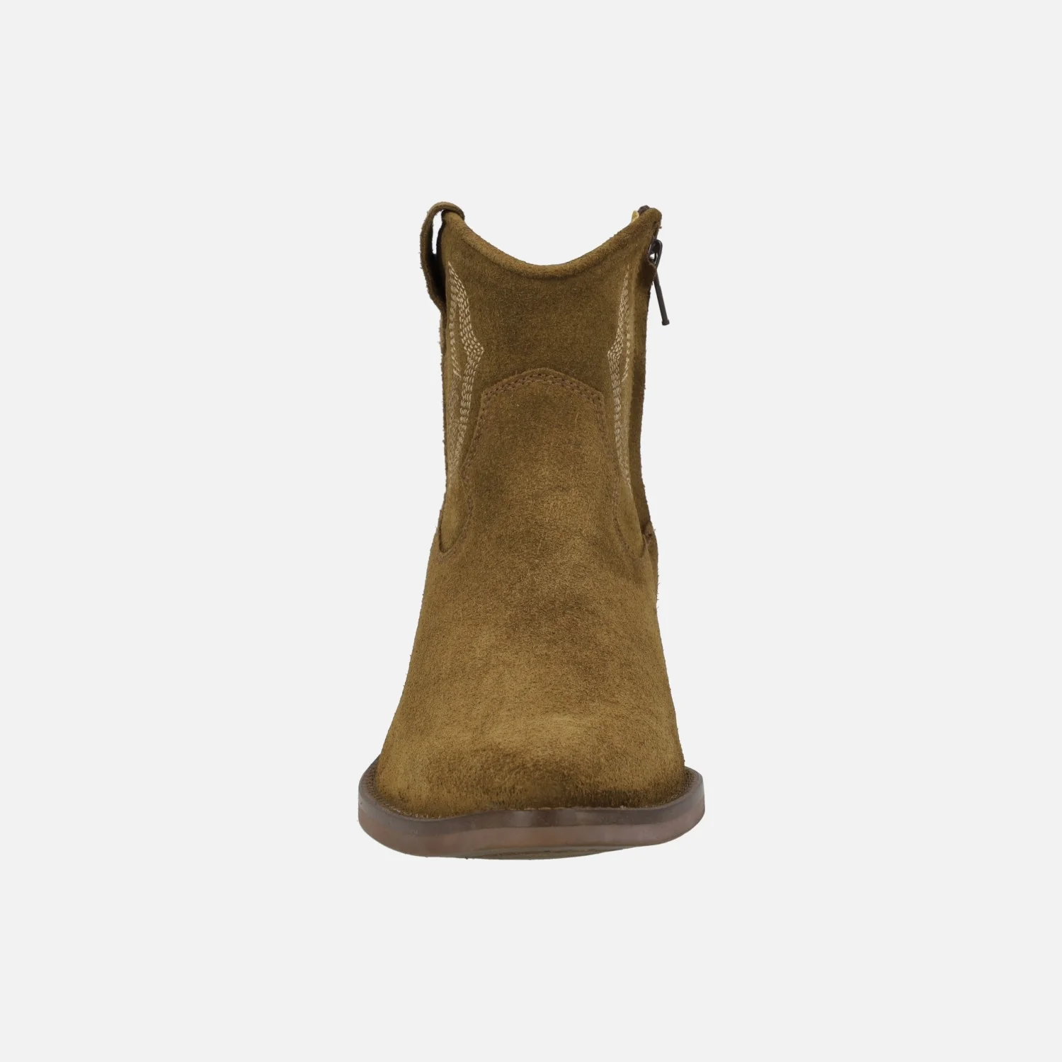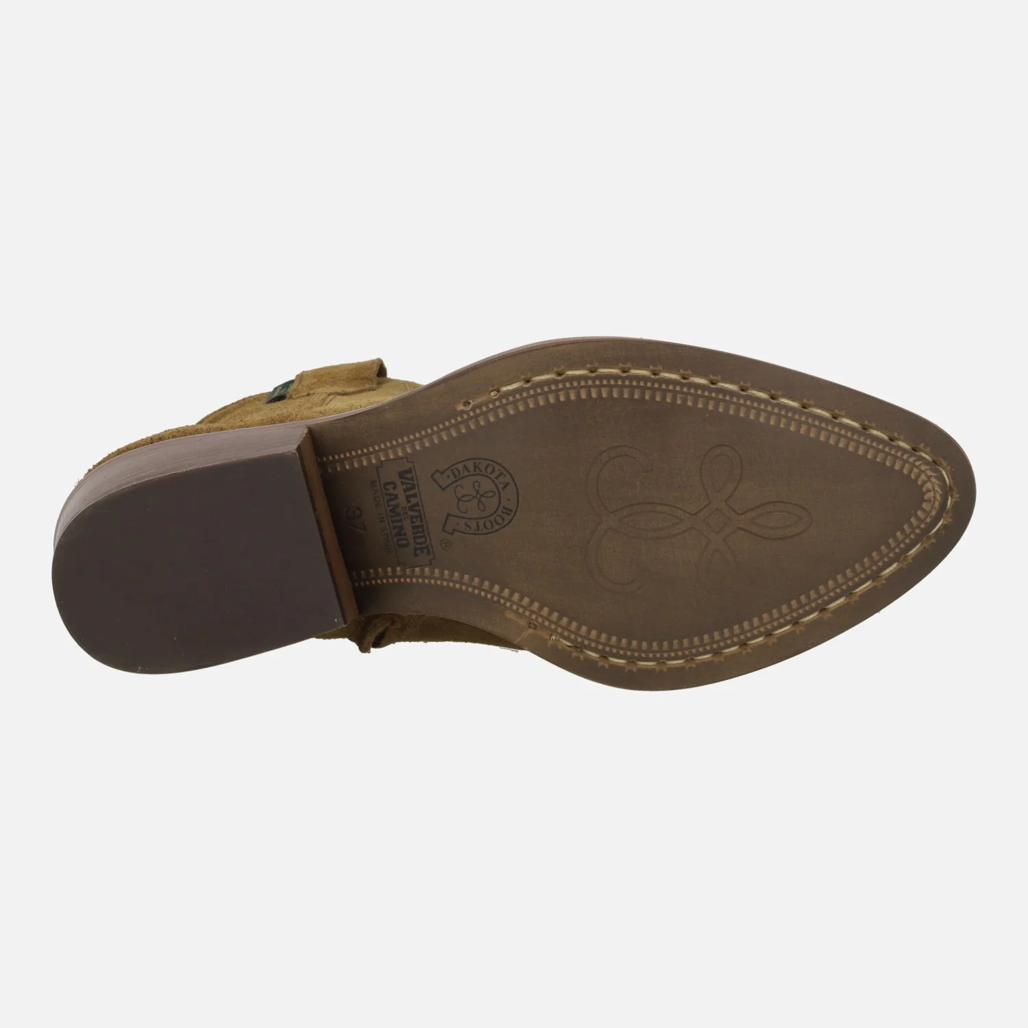 Botines para mujer de la marca española Dakota Boots modelo DKT68 Oil capuccino. Botines elaborados en piel serraje, con cierre de cremallera en el lado interior. Detalle de dibujos pespunteados. Interior mixto en piel y sintéticos. Caña de 12,5 cm. Suela sintética, con tacones anchos, de 7,5 cm de altura. Dakota Boots, Valverde del Camino, SPain.