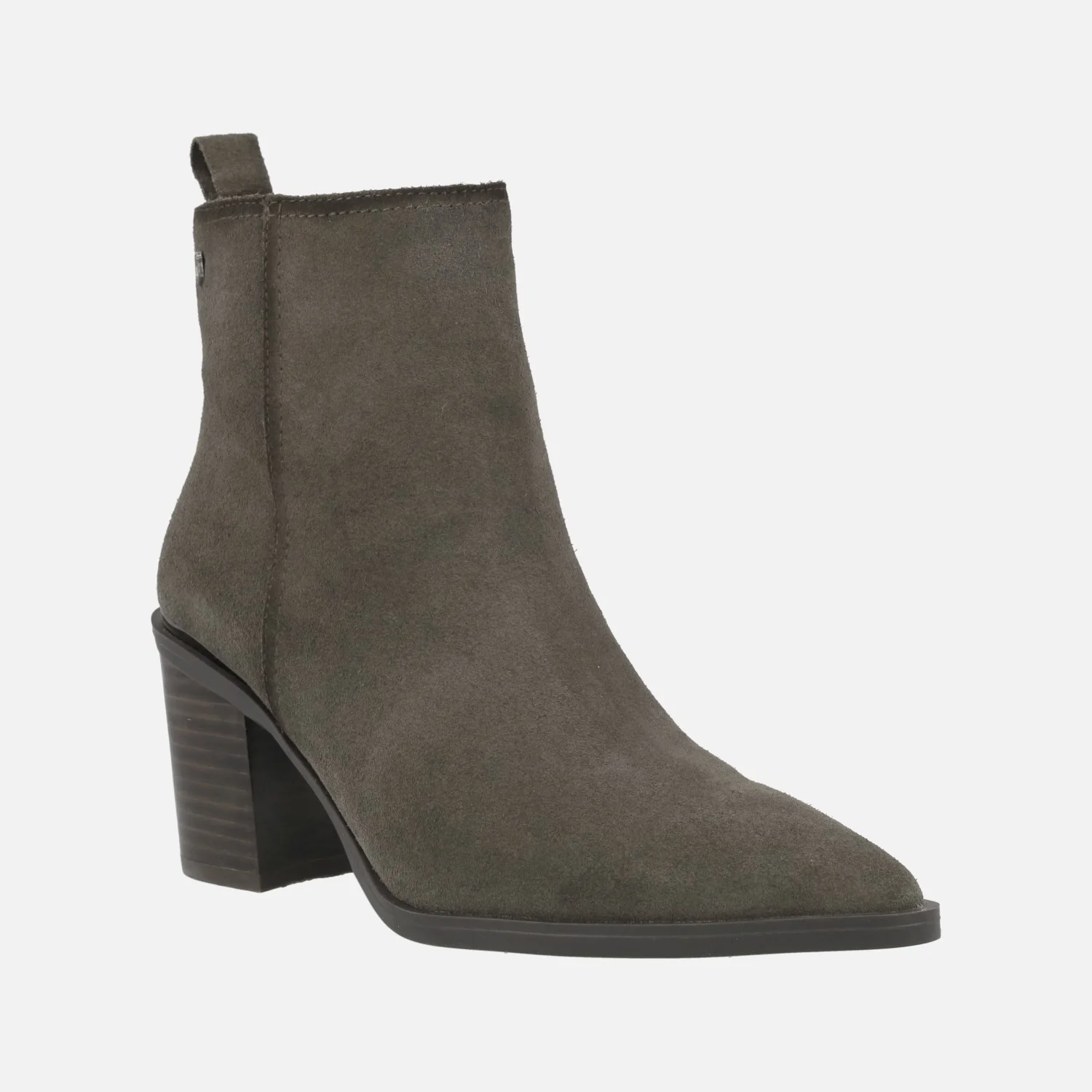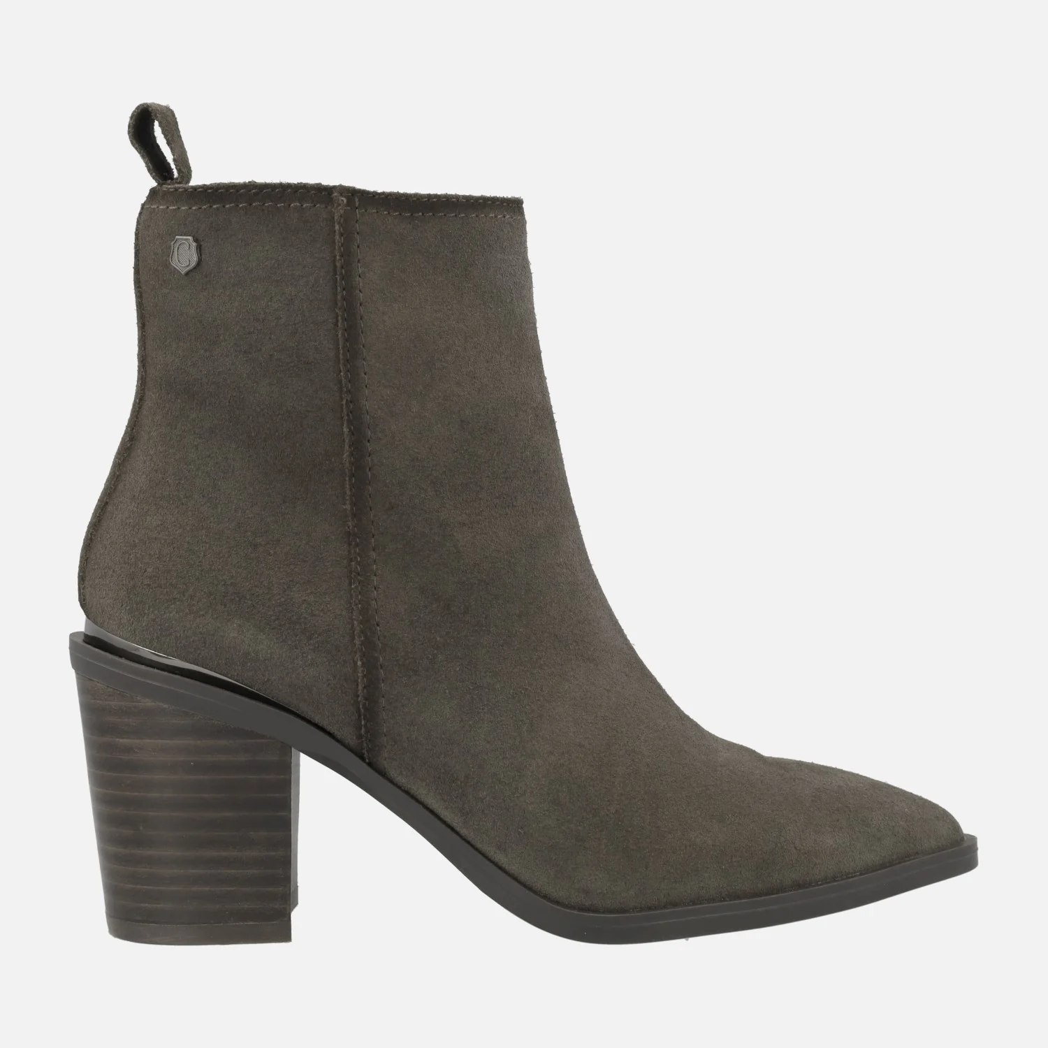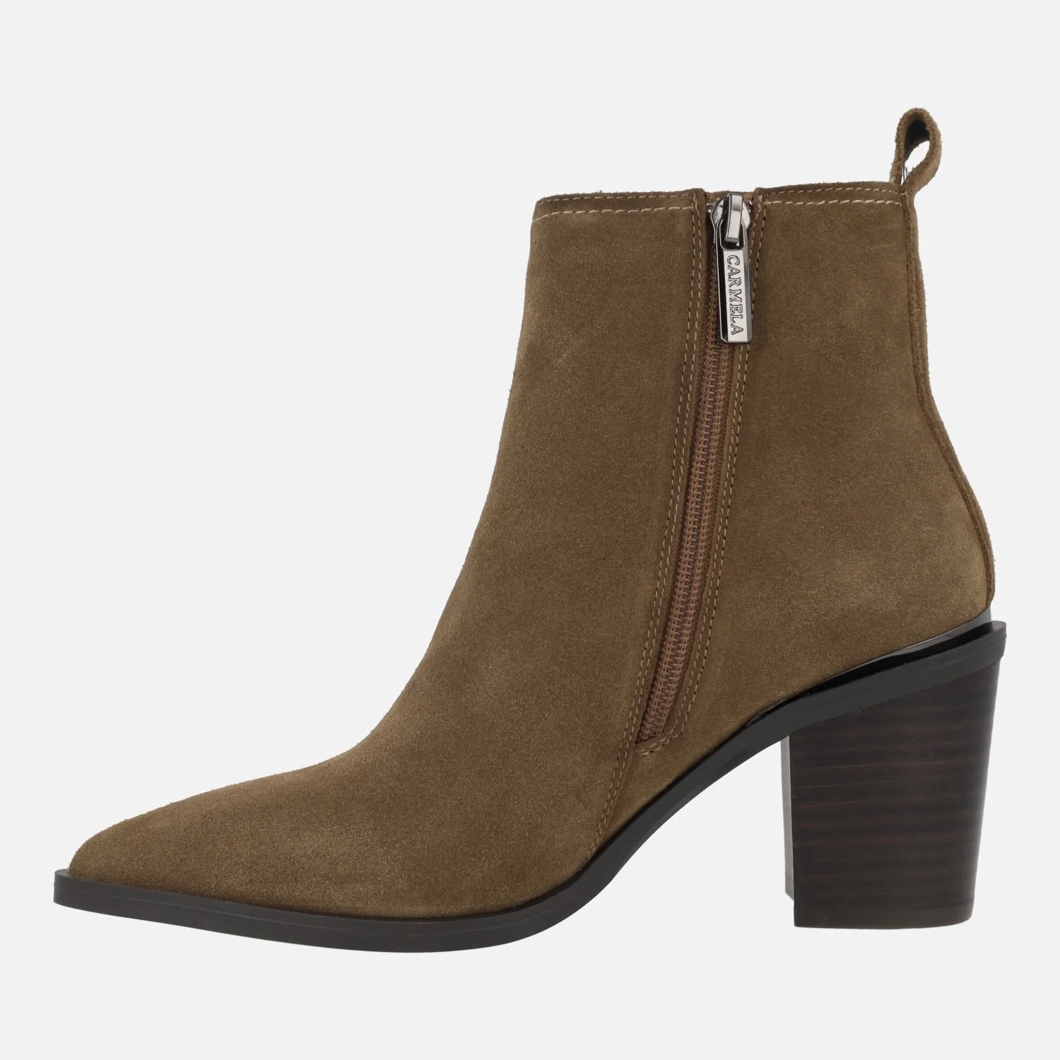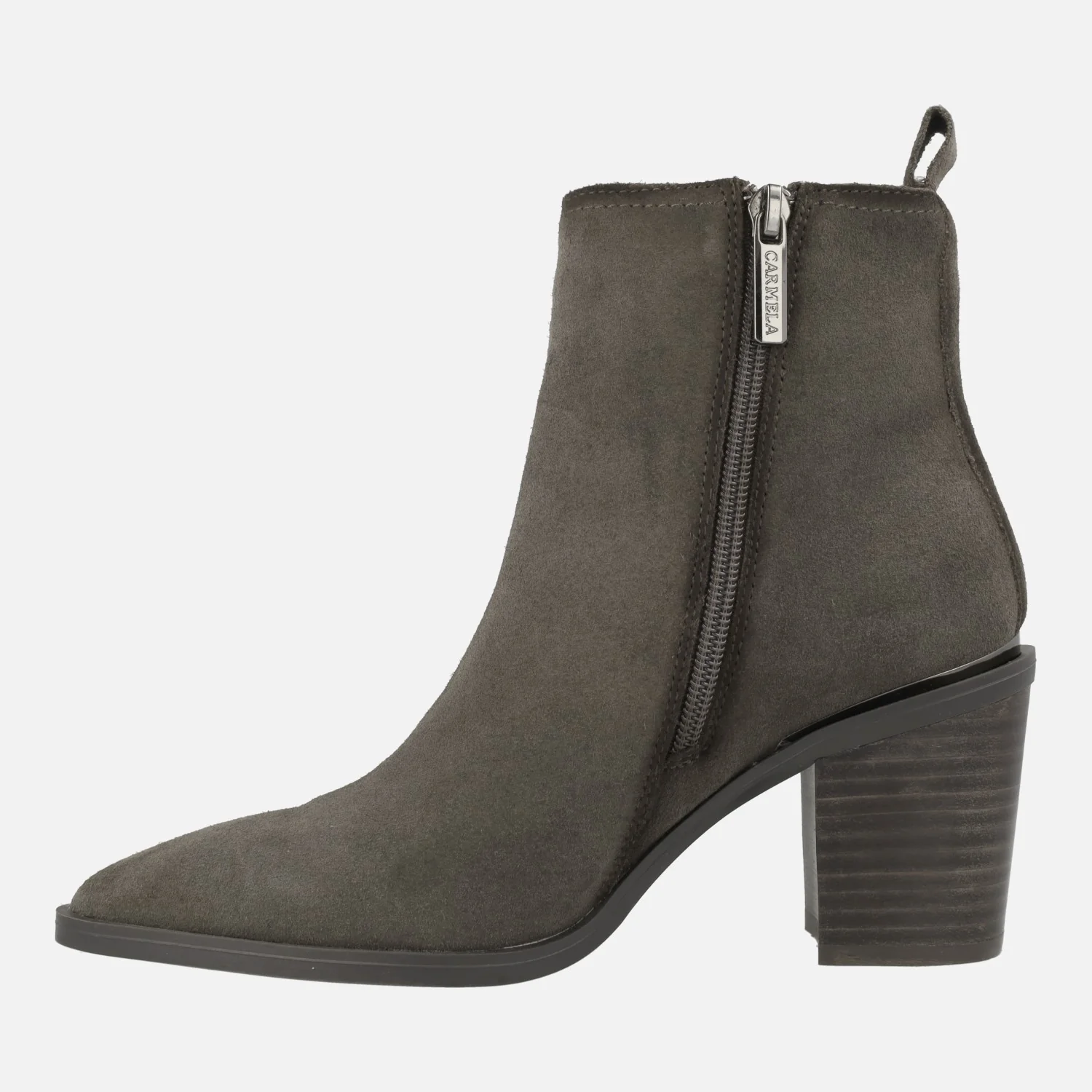 Botines de tacón alto marca Carmela shoes, modelo 161895, disponibles en gris y en cuero. Botines elaborados en piel serraje, con horma afilada y cierre de cremallera lateral. Detalle de tirador trasero. Interior mixto, en piel y tejido. Piso de goma, con tacones de 7,5 cms de altura. Caña de aproximadamente 13 cms de altura.