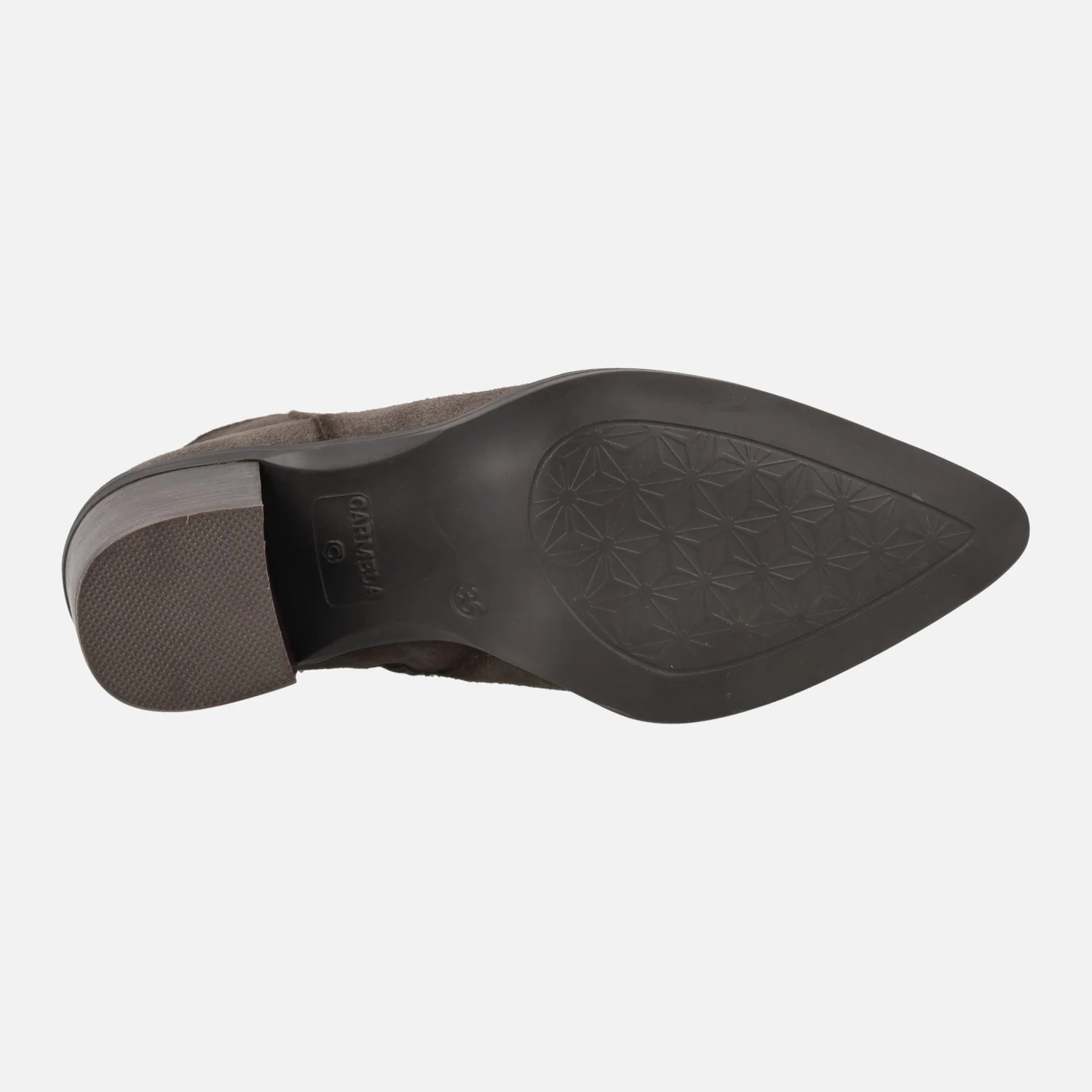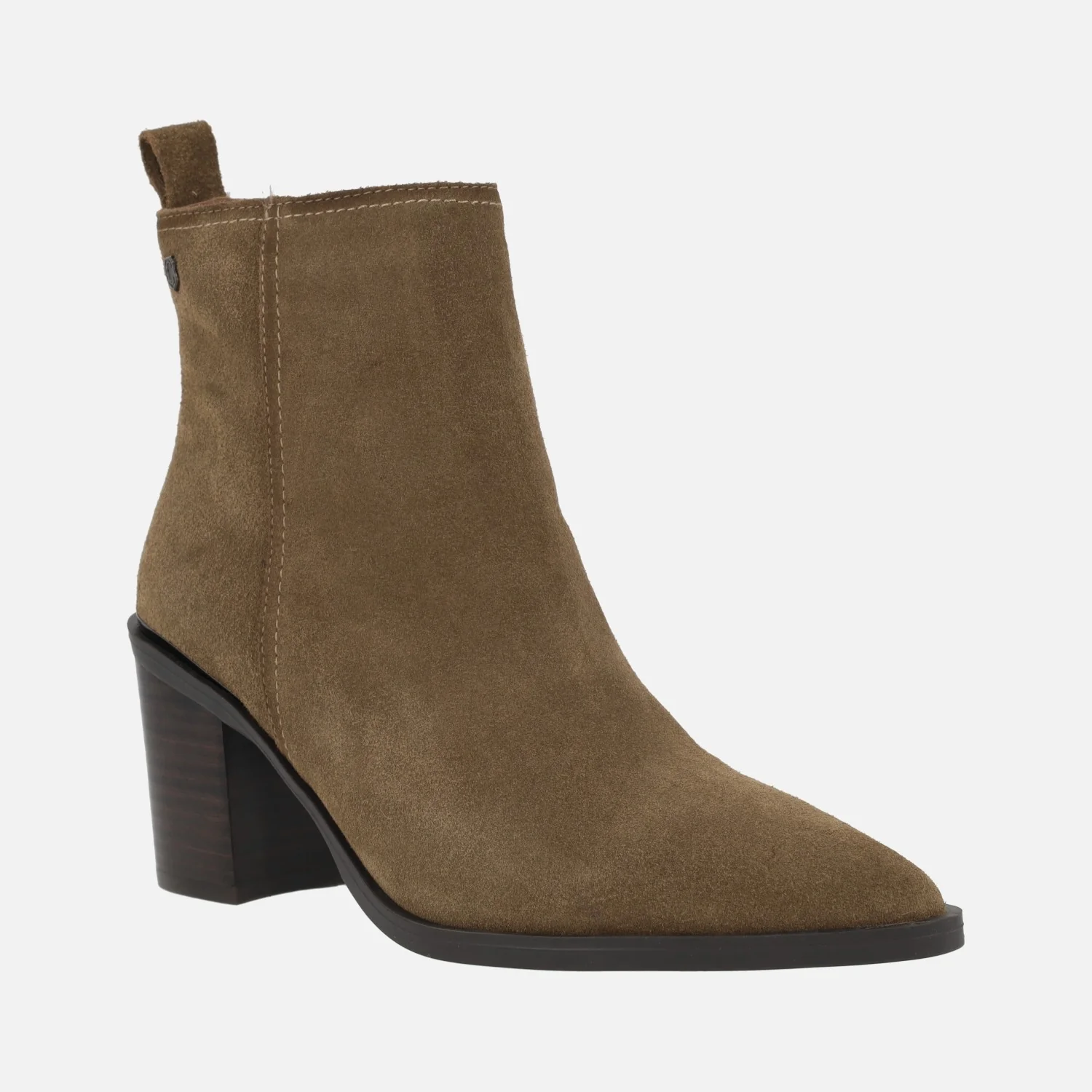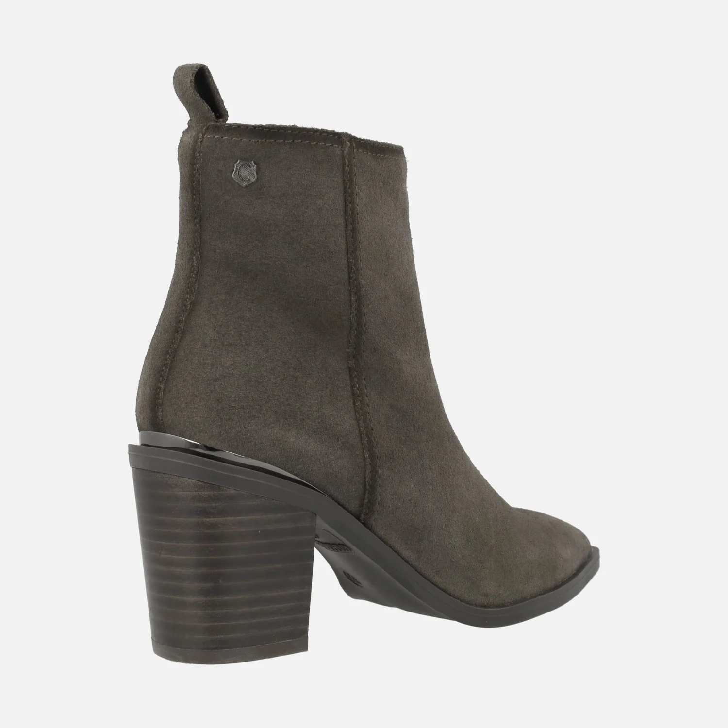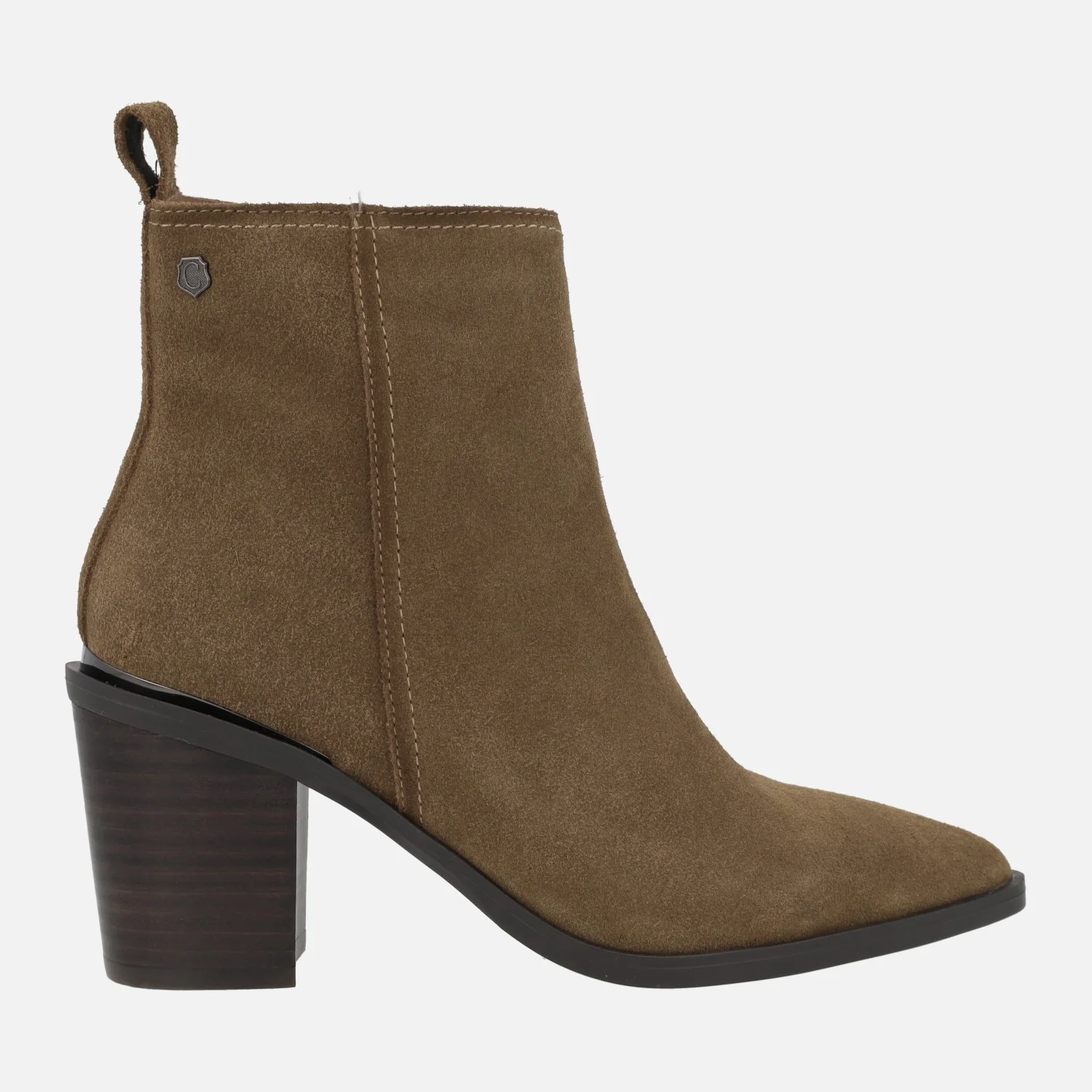 Botines de tacón alto marca Carmela shoes, modelo 161895, disponibles en gris y en cuero. Botines elaborados en piel serraje, con horma afilada y cierre de cremallera lateral. Detalle de tirador trasero. Interior mixto, en piel y tejido. Piso de goma, con tacones de 7,5 cms de altura. Caña de aproximadamente 13 cms de altura.