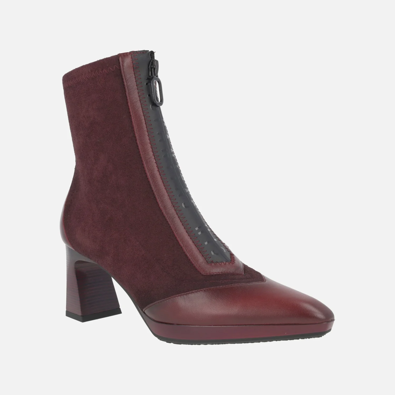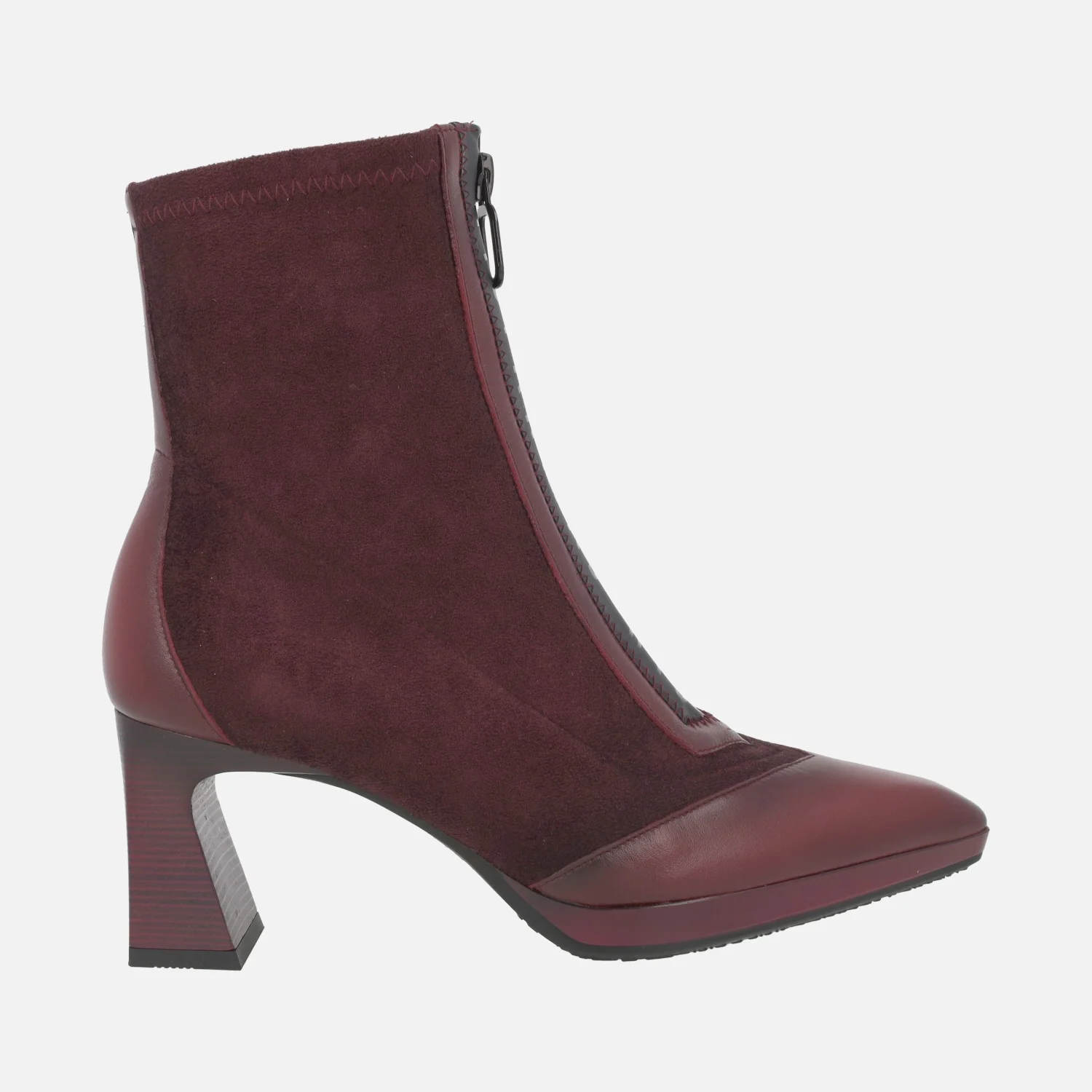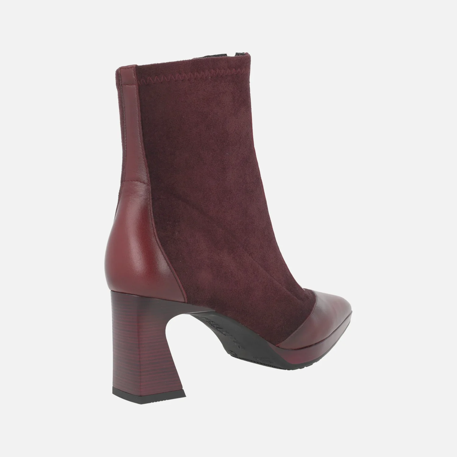 Botines de tacón modelo HI254186 Avellana o Wine (burdeos), de la marca Hispanitas. Botines con caña elaborada en materiales elásticos, cremallera frontal y detalles en piel en la talonera y la puntera. Horma ligeramente afilada. Tacones de 7 cm de altura, con pequeña plataforma delantera de 1,5 cm. Caña de 14 cm de altura. Piso sintético. Made in Spain.