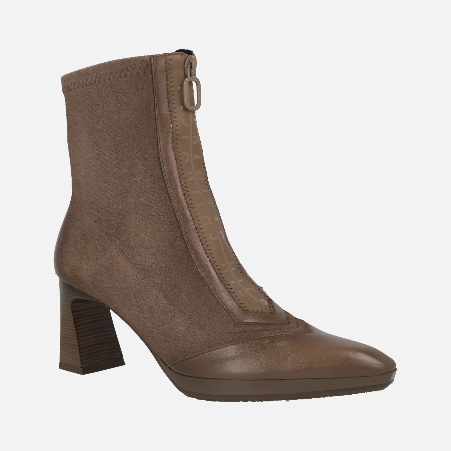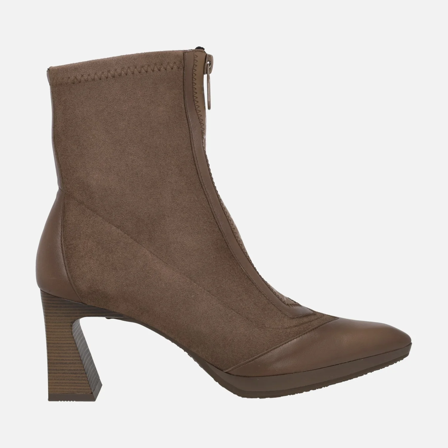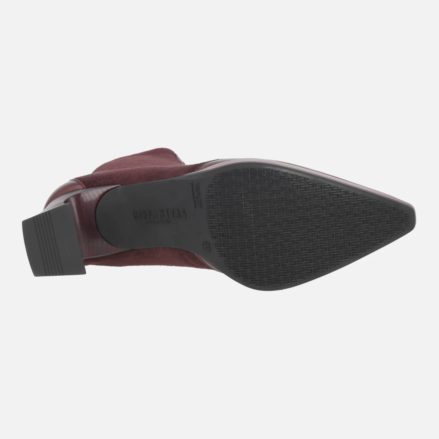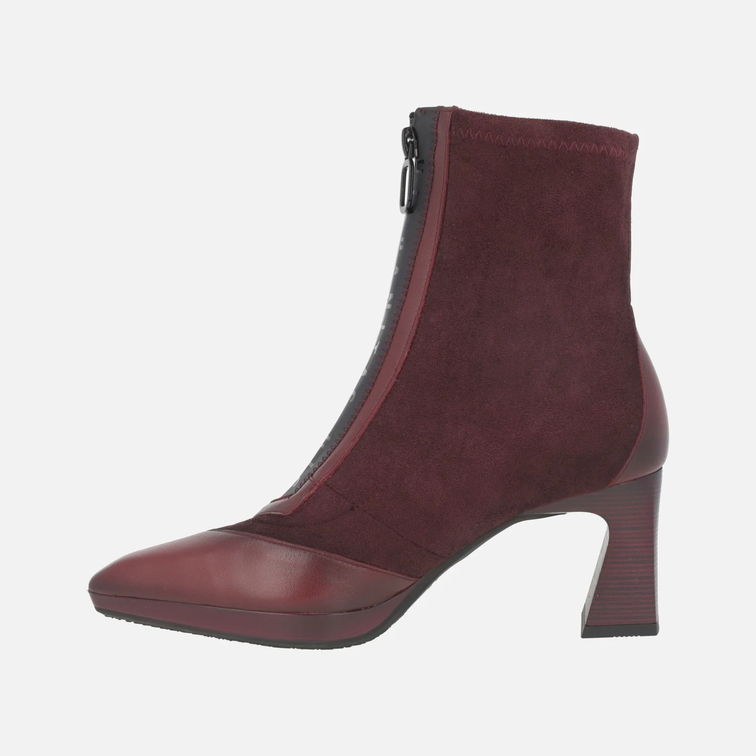 Botines de tacón modelo HI254186 Avellana o Wine (burdeos), de la marca Hispanitas. Botines con caña elaborada en materiales elásticos, cremallera frontal y detalles en piel en la talonera y la puntera. Horma ligeramente afilada. Tacones de 7 cm de altura, con pequeña plataforma delantera de 1,5 cm. Caña de 14 cm de altura. Piso sintético. Made in Spain.