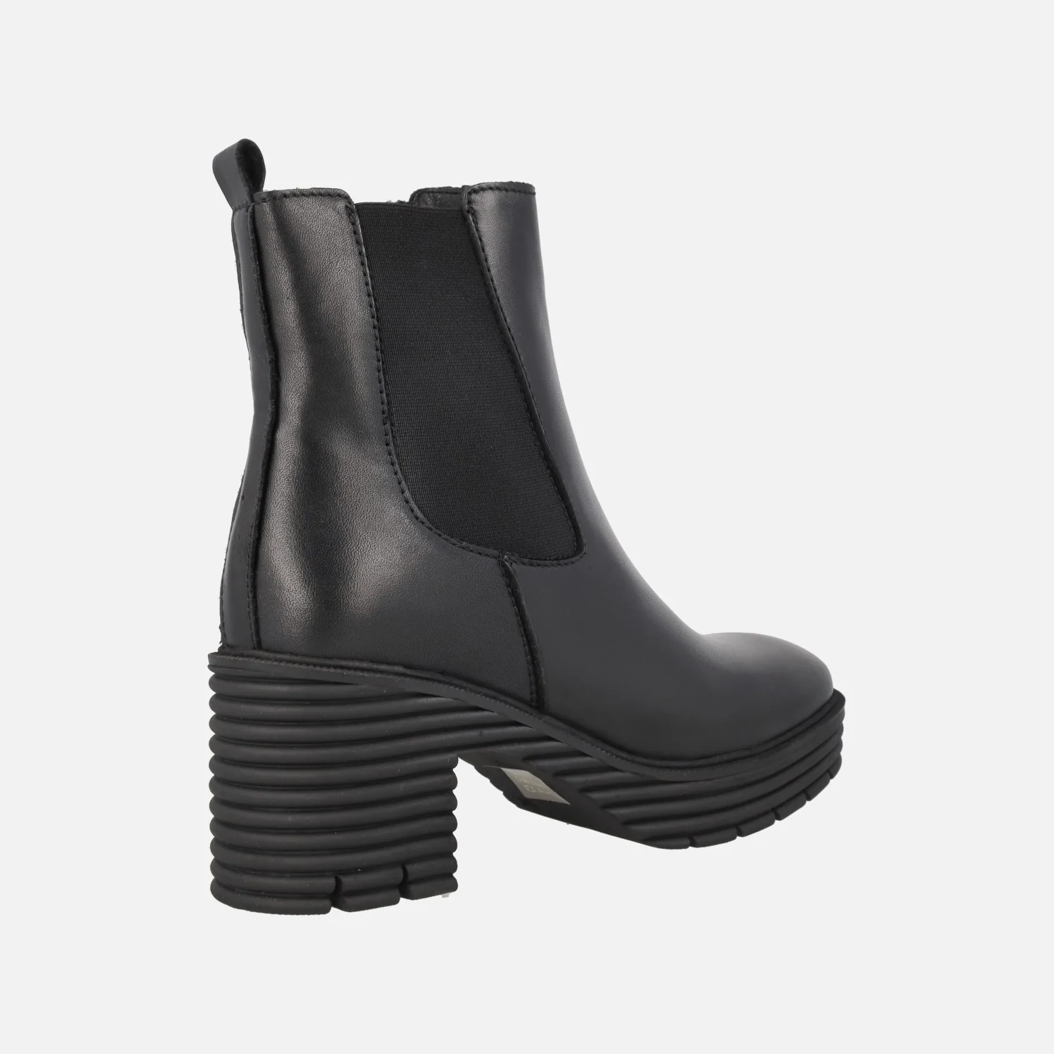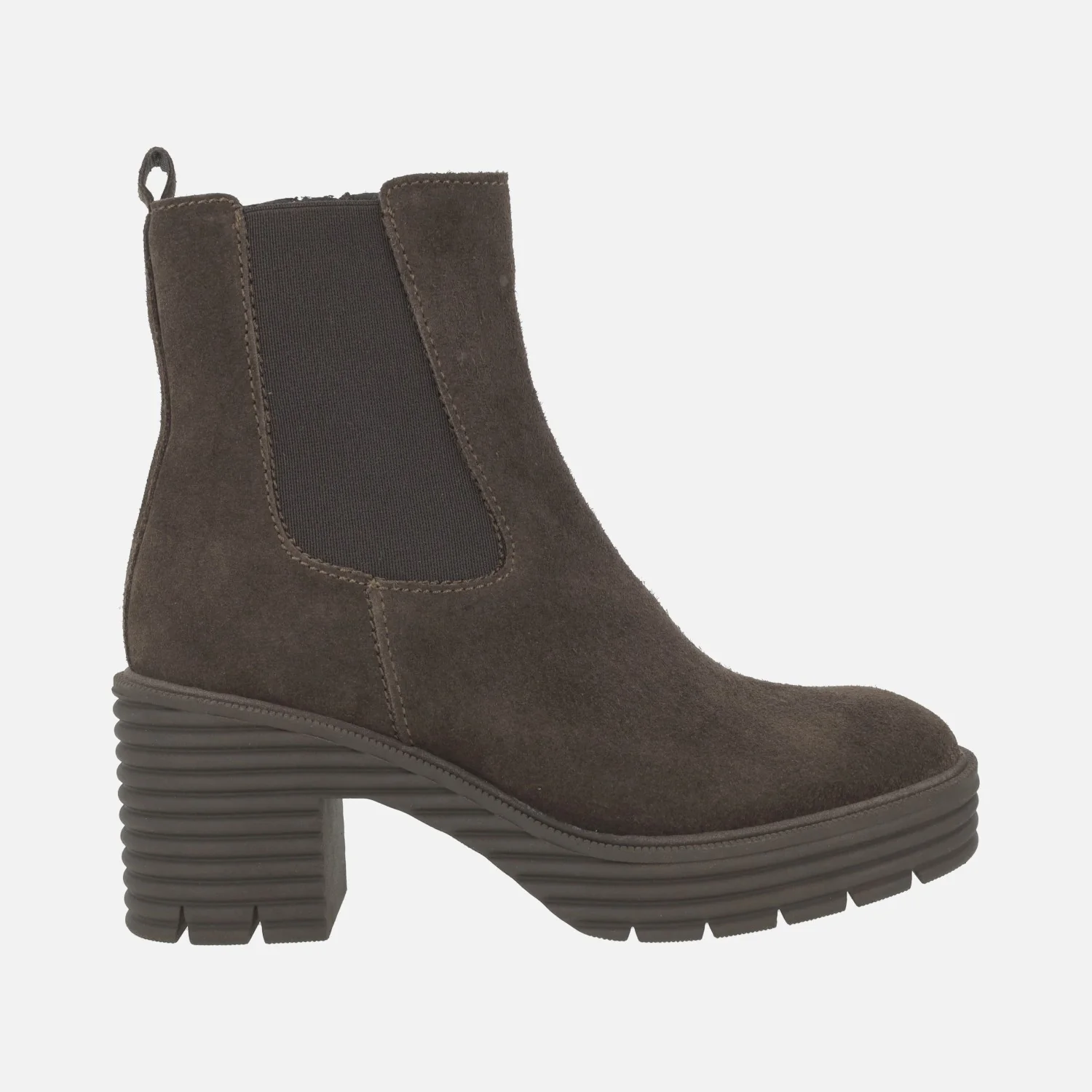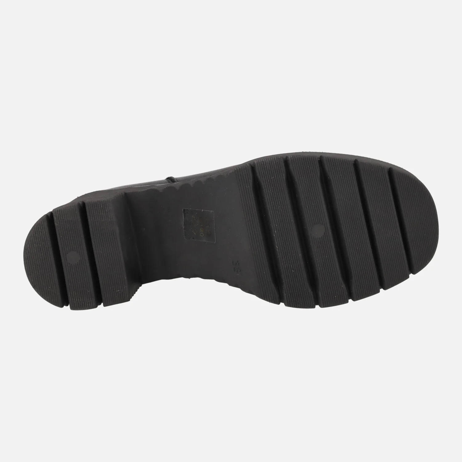 Botines de tacón y plataforma de la marca Lol shoes, modelo Gladys. Disponibles en piel negra y en serraje marrón chocolate. Botines inspiración chelsea, con elástico en el lado exterior y cierre de cremallera en el lado interior. Forro y planta en combinado de tejido y sintéticos. Piso sintético con tacones de 7,5 cm de altura y plataforma de 2,5 cm. Caña de 13 cm.