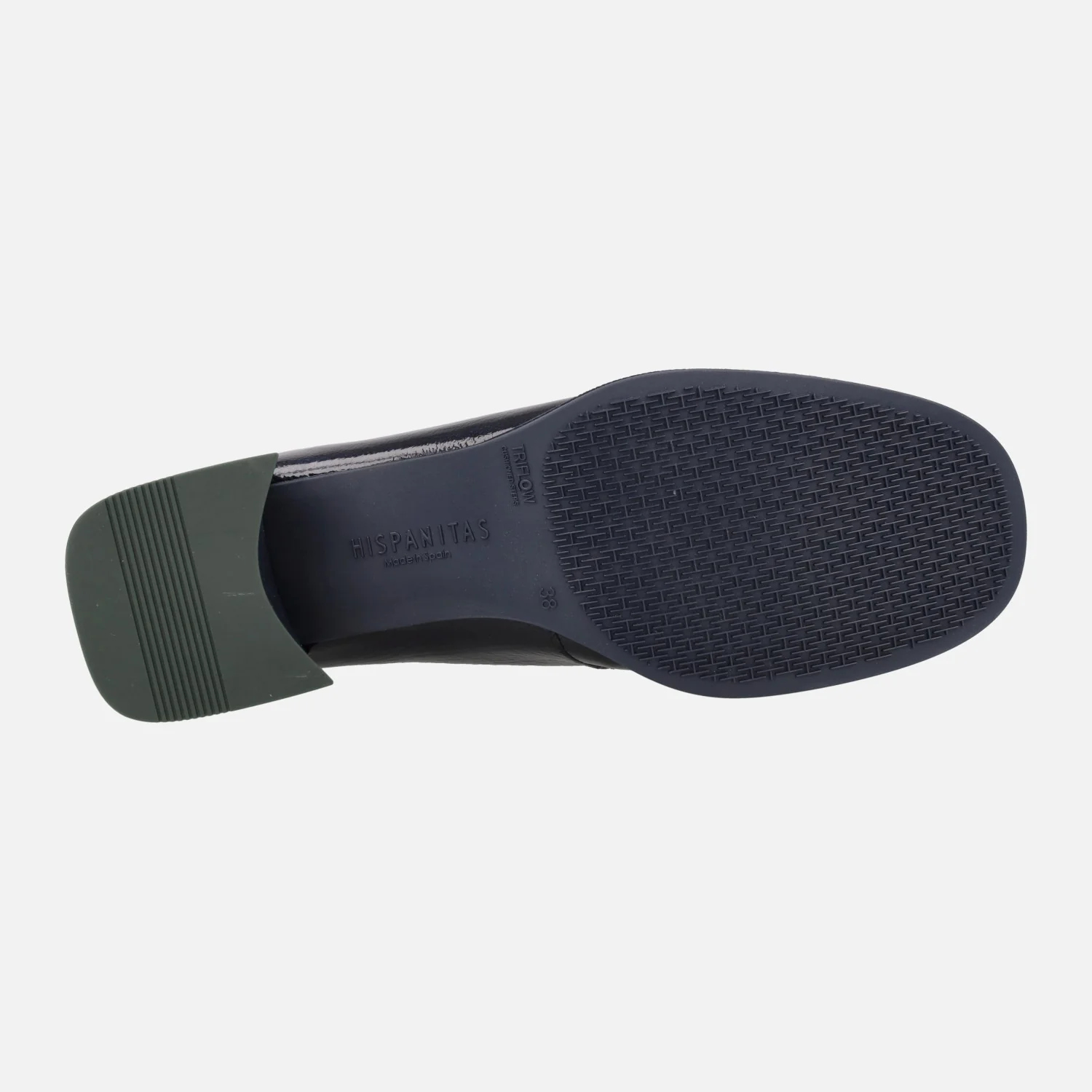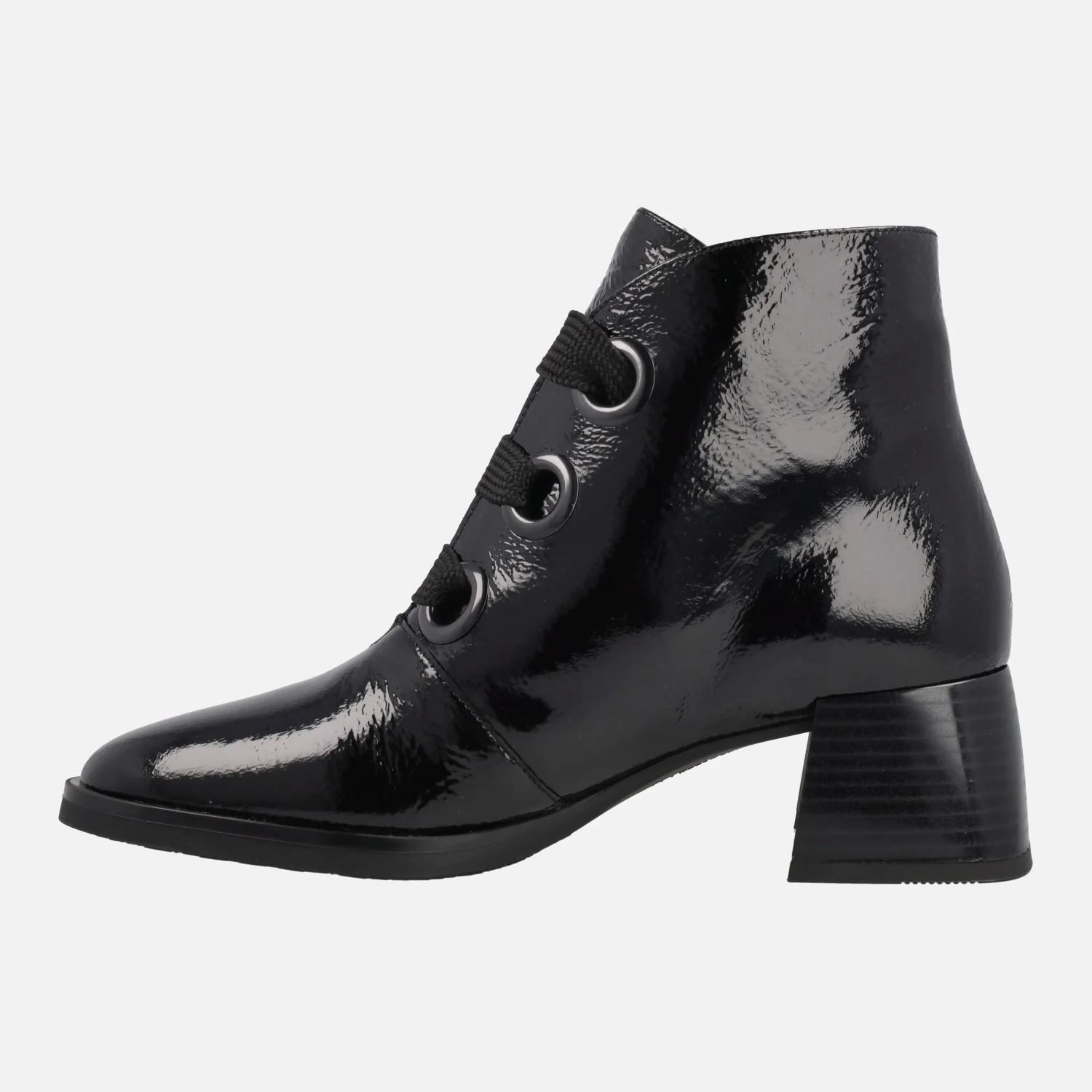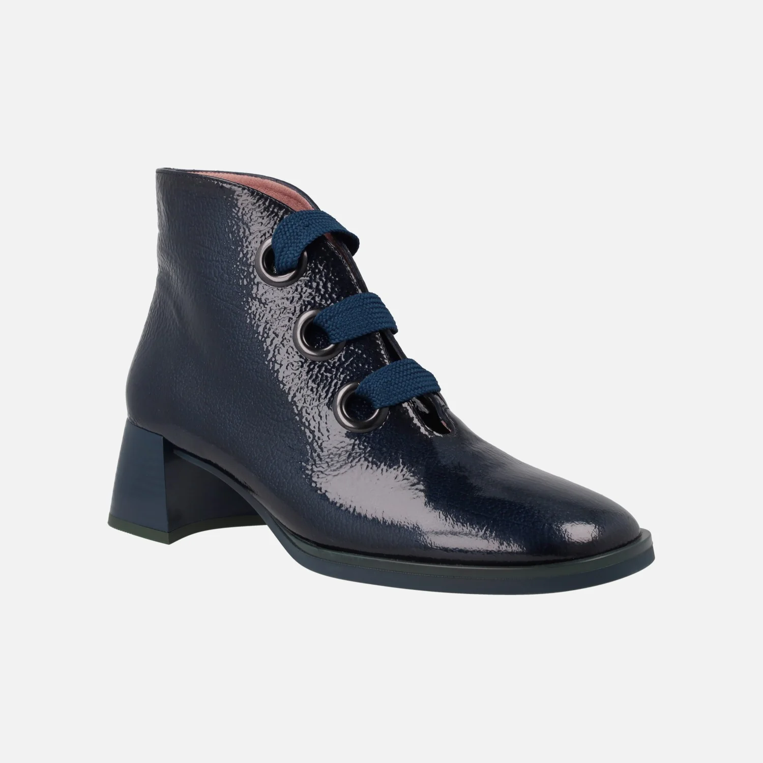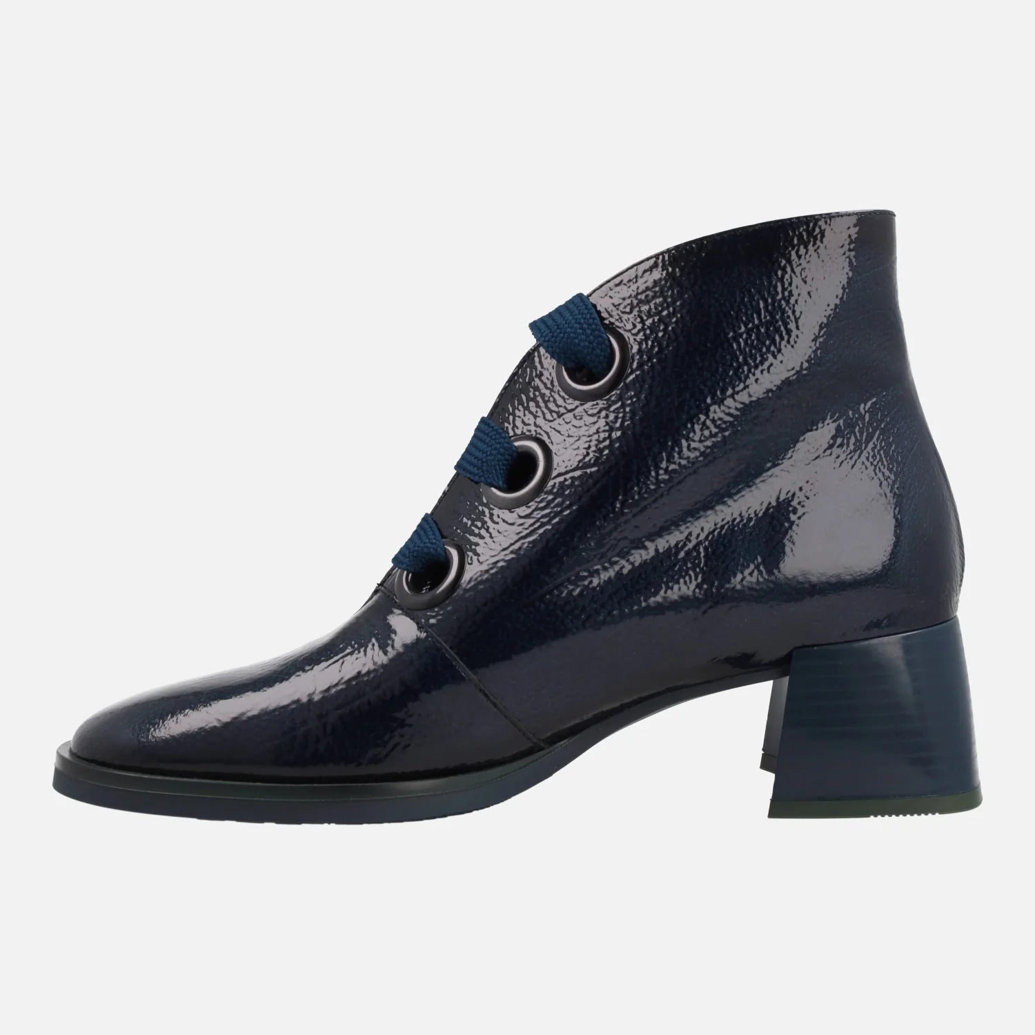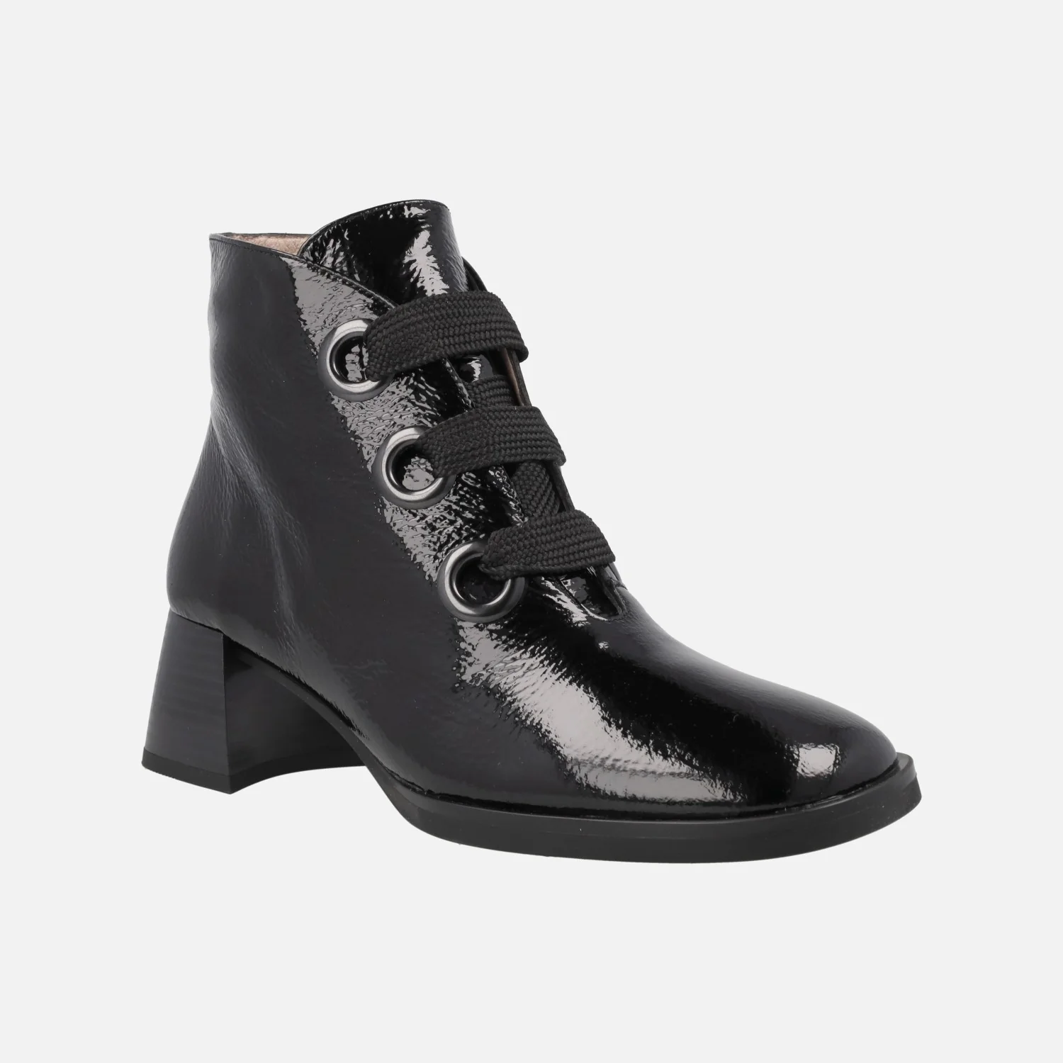 Botines de cordones para mujer de la marca Hispanitas, modelo HI243635 disponibles en black (negro), midnight (azul) o rioja (burdeos). Botines de piel charol, con cierre de cordones. Interior de microfibra, con textura similar a la piel. Sistema de triple almohadillado TRIFLOW, para un gran confort al caminar. Piso sintético. Tacones de 5,5 cms de altura. Caña de 12 cms de altura. Made in Spain.