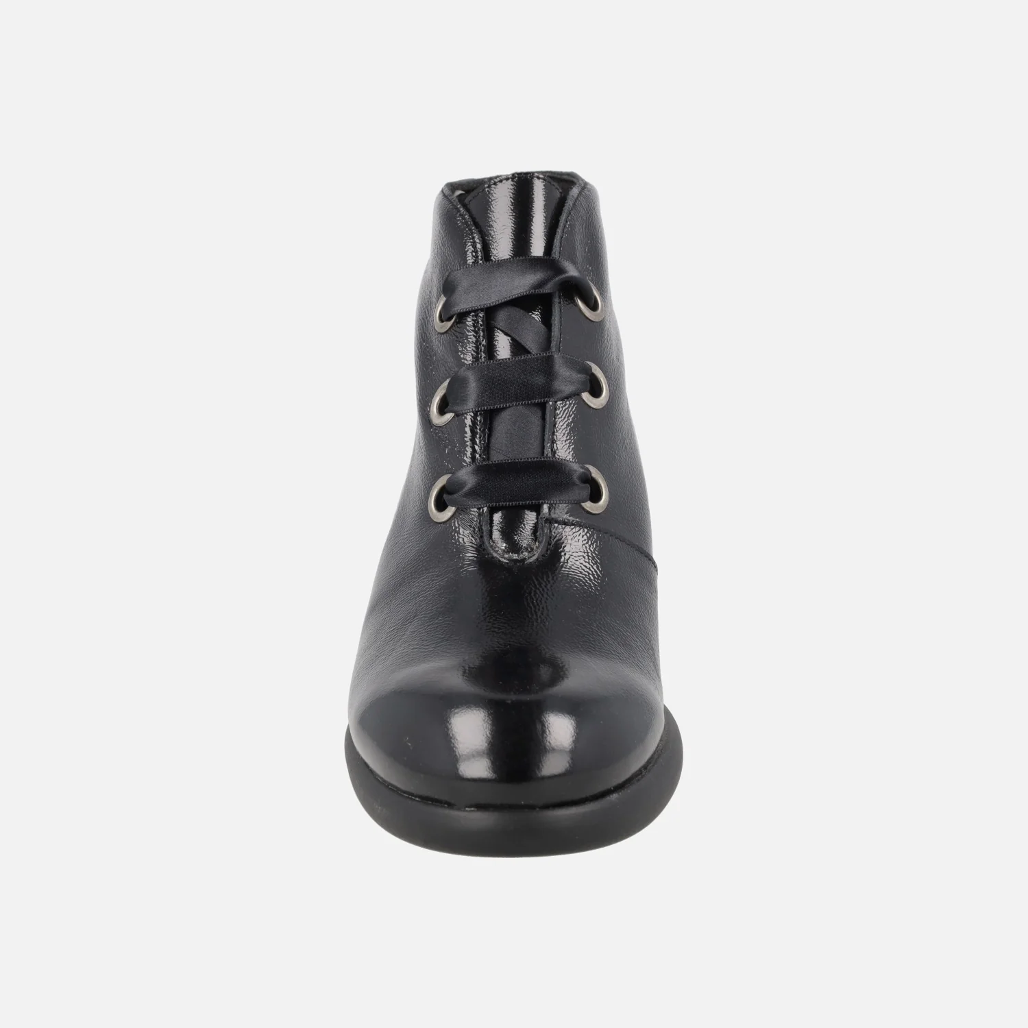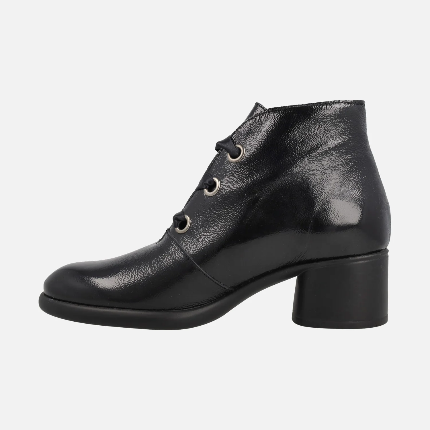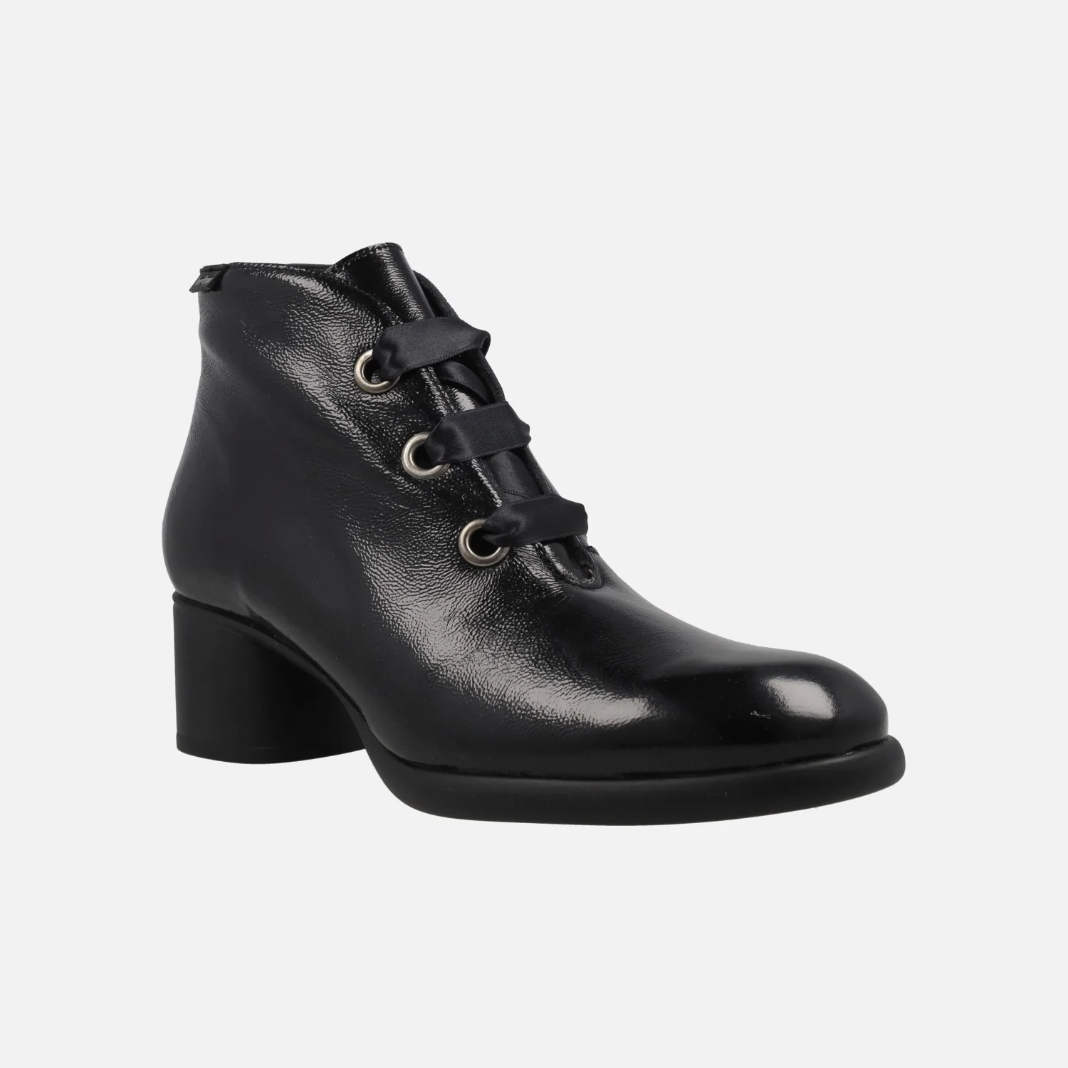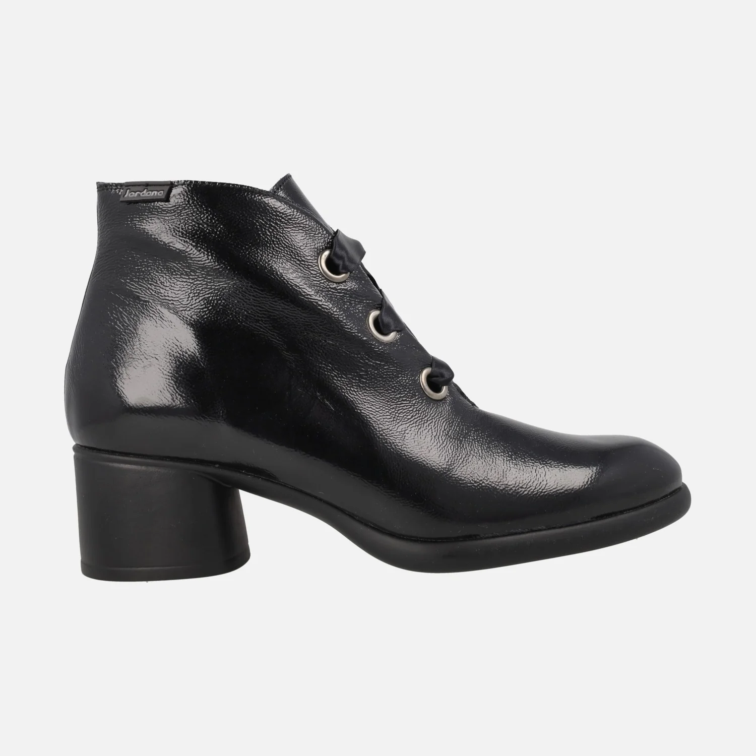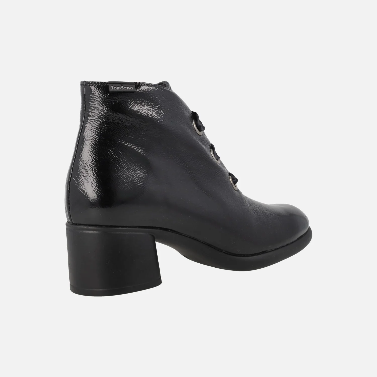 Elegantes botines de cordones para mujer de la marca Jordana, modelo 4389 Negro. Botines de tacón, elaborados en charol negro, con cierre de cordones satinados tipo lazo. Interior mixto en piel y otros materiales, con plantillas forradas de piel. Suela sintética. Tacones de 5,5 cm. Caña de 11,5 cm de altura.