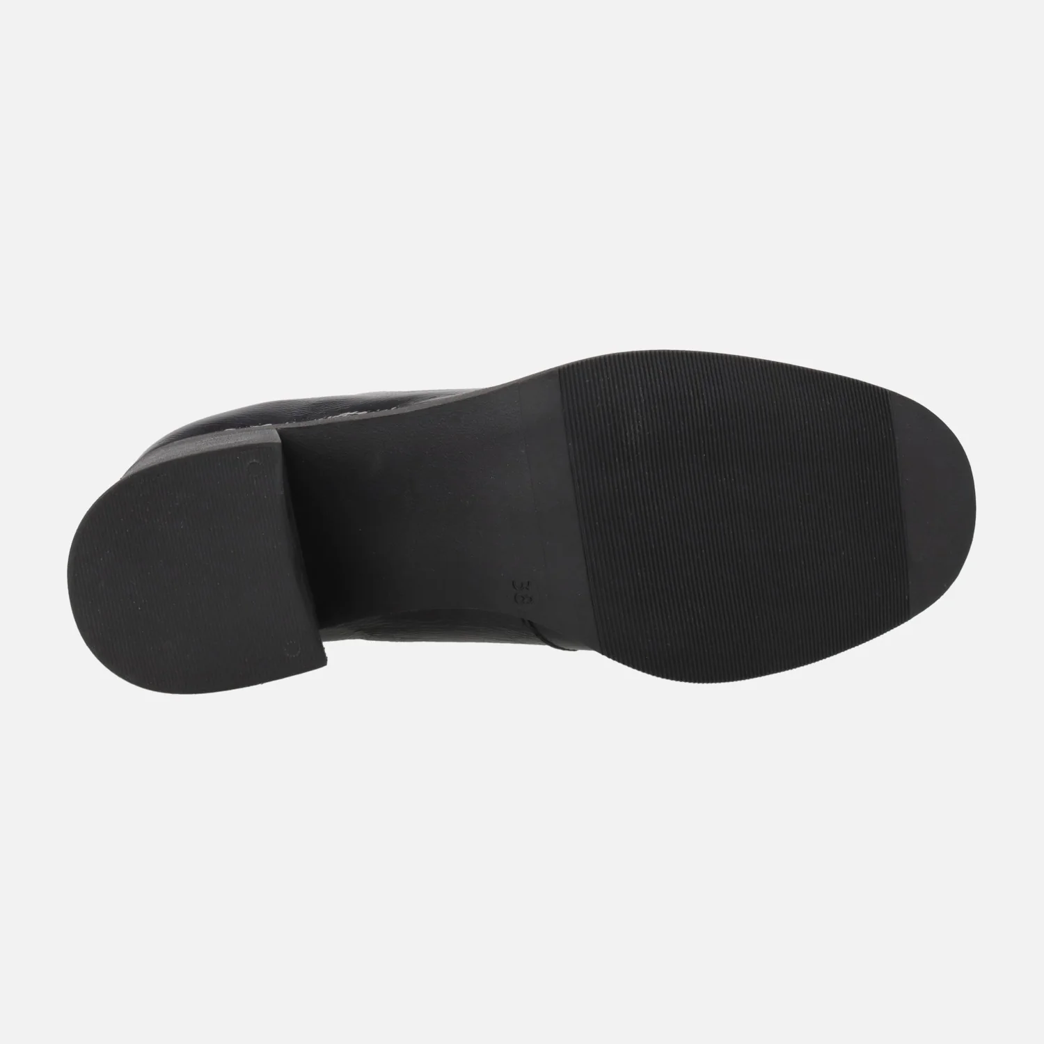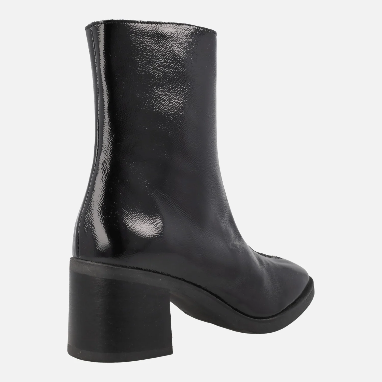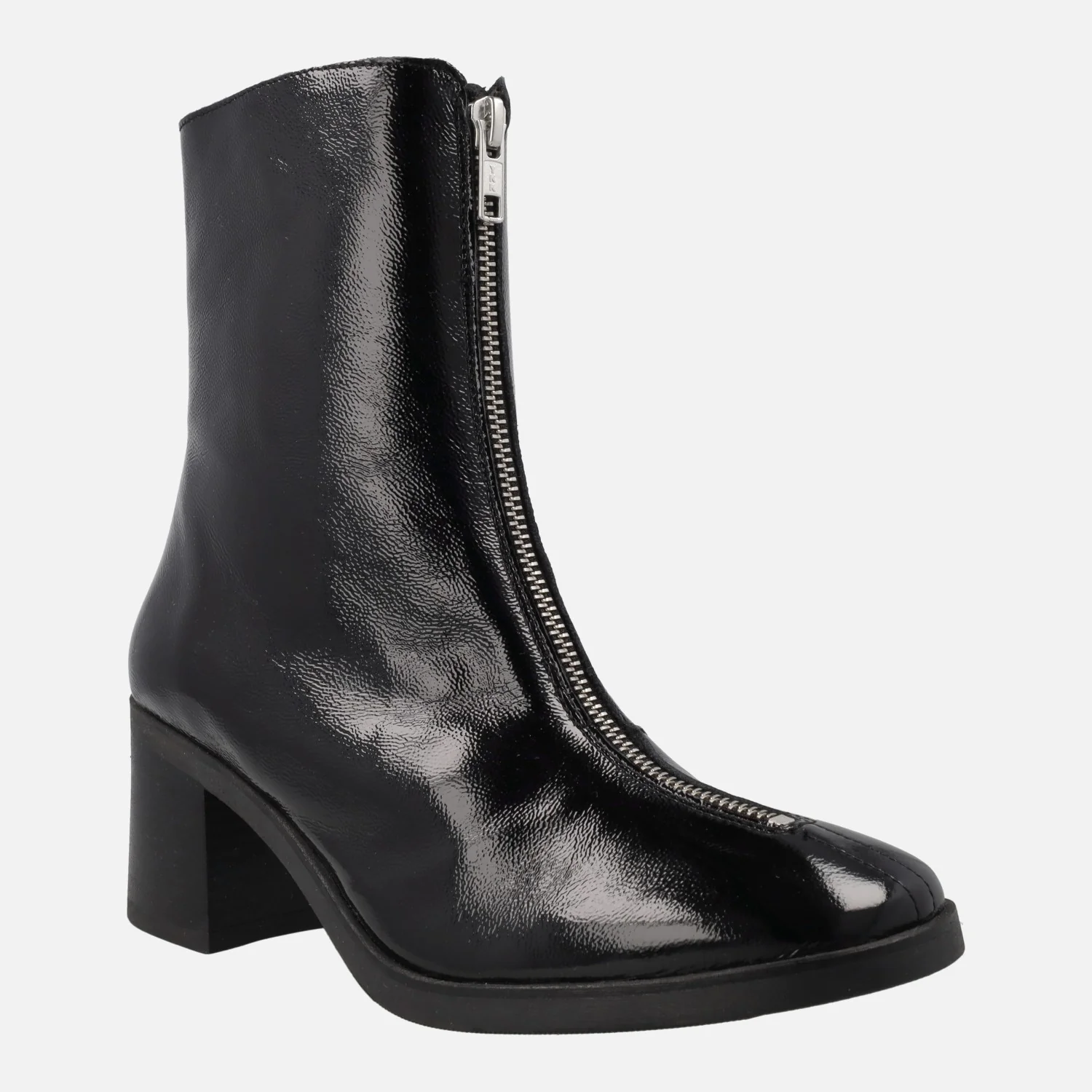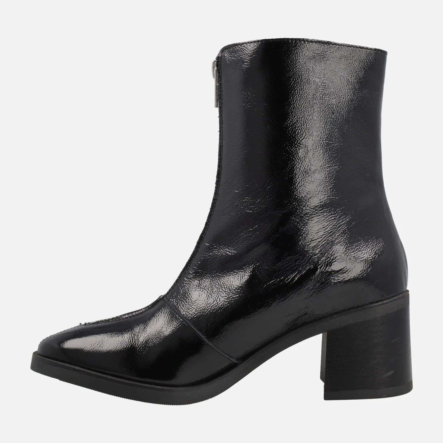 Botines de tacón elaborados en charol negro, de la marca Bryan stepwise, modelo 4804 negro. Botines de charol con cierre de cremallera frontal y tacones anchos, de 6,5 cms de altura. Caña de 17 cms aproximadamente. Interior textil.