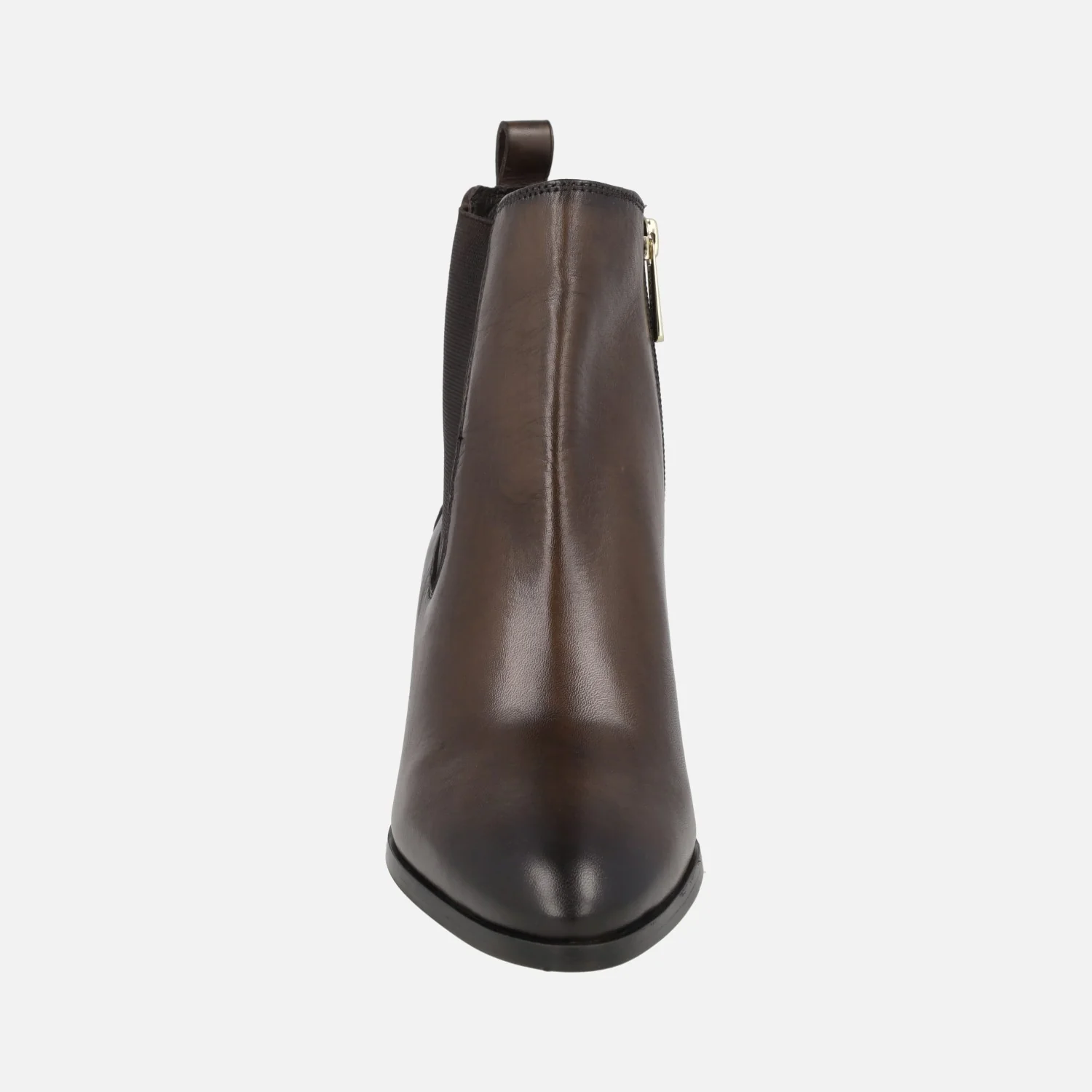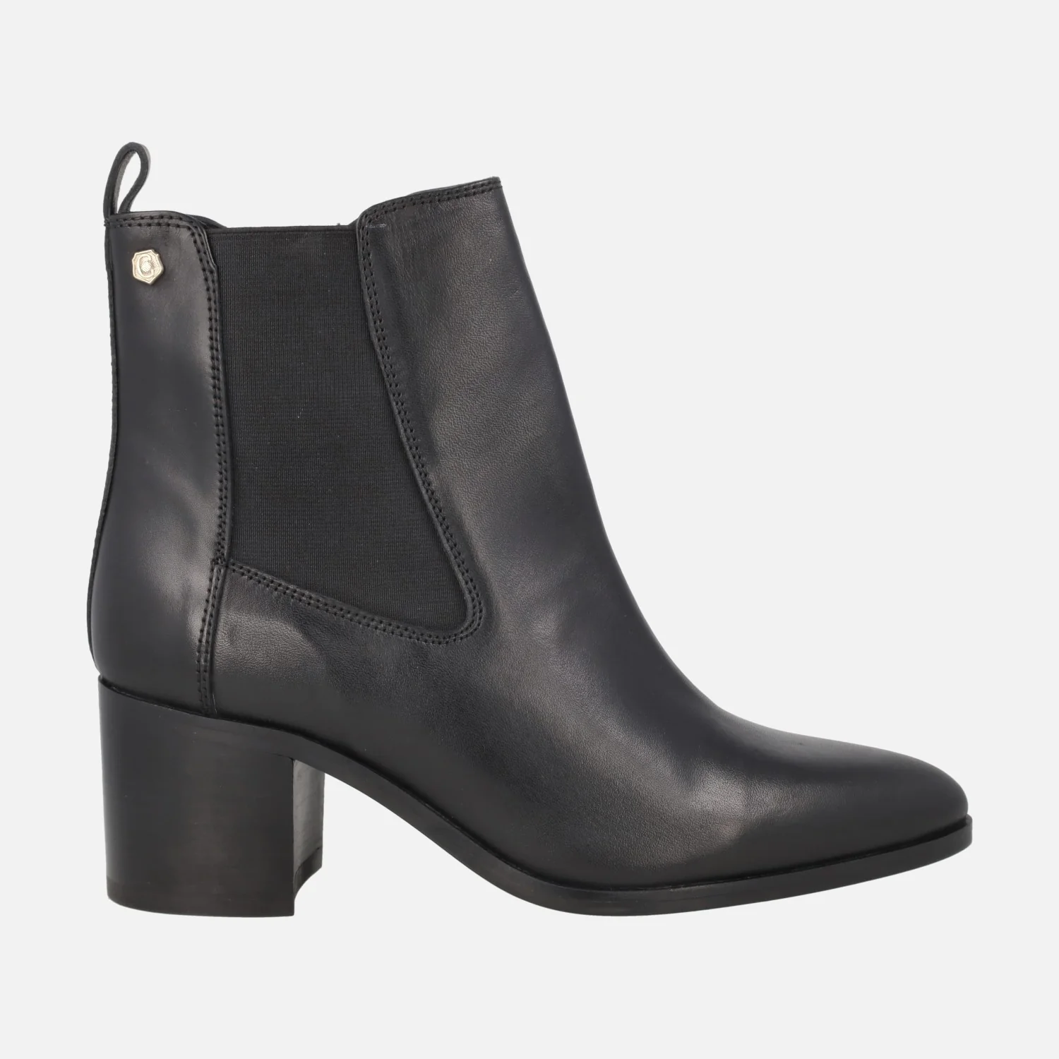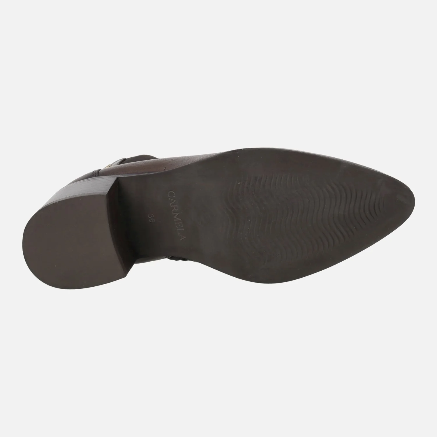 Botines de piel de la marca Carmela shoes modelo 162715. Botines negros o marrón chocolate, de piel con elástico en el lado exterior y cierre de cremallera en el lado interior. Interiores en combinado de piel y tejido. Caña de 13 cm con tirador. Piso sintético de 6 cm de tacón.