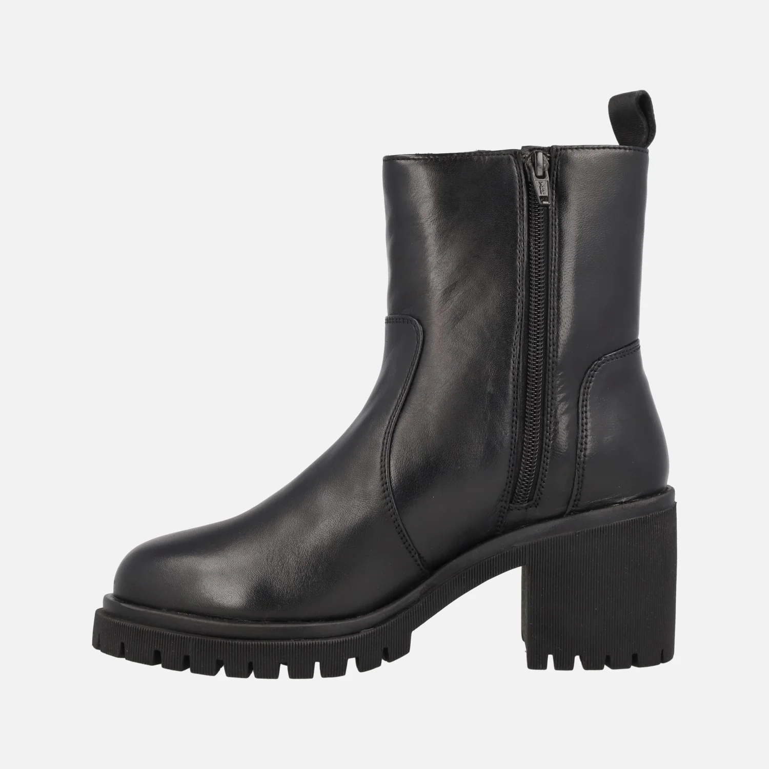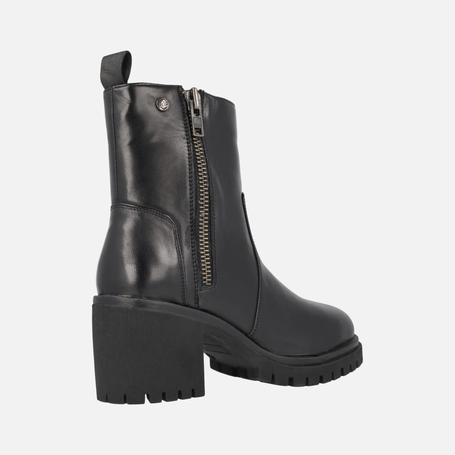 Botines negros de piel para mujer de la marca TOP3 modelo SS24836 Negro. Botines elaborados en piel negra, con dos cremalleras, la del lado exterior es de adorno, la interior es la funcional. Piso de goma track, con tacones de 7,5 cms de altura (2,5 cms parte delantera). Caña de 16 cms con detalle de tirador trasero. Forro textil y planta de piel.