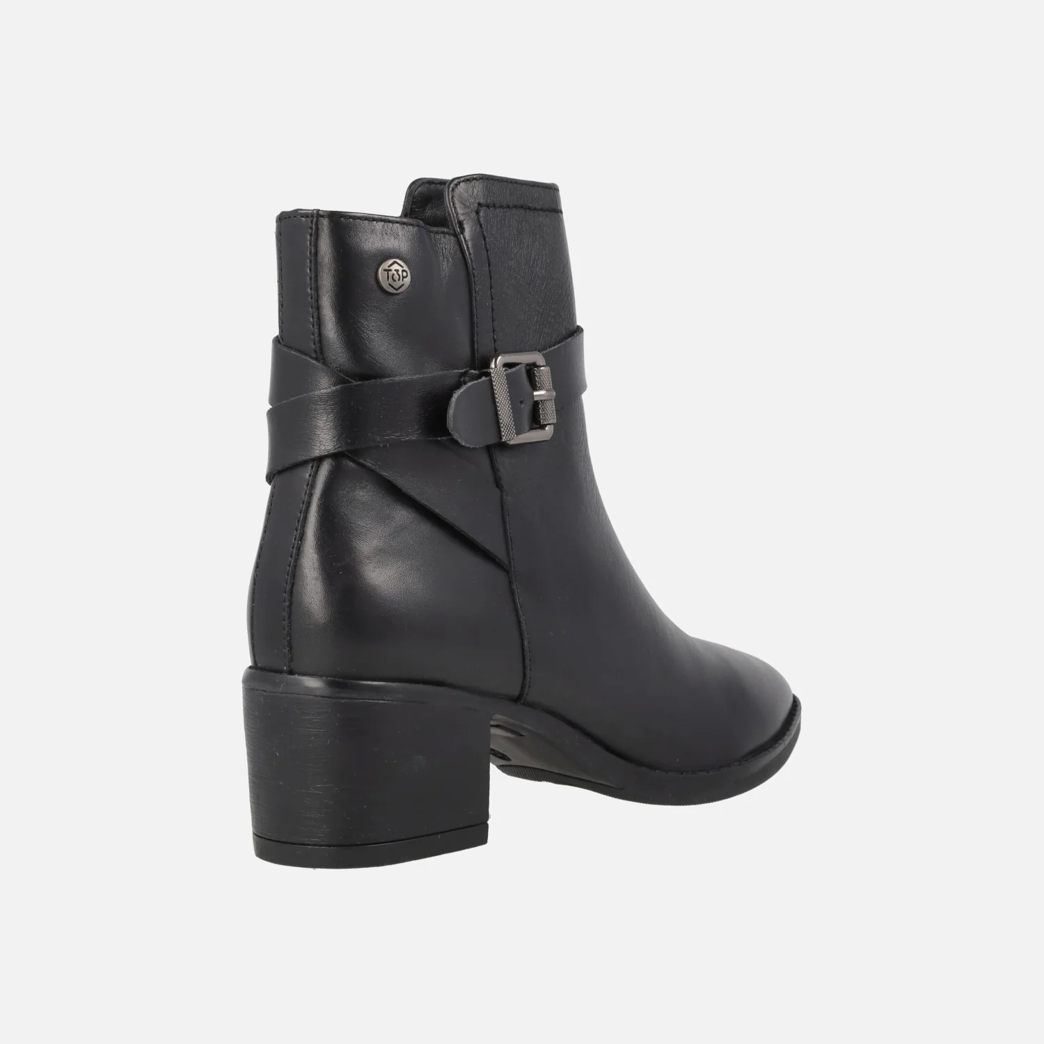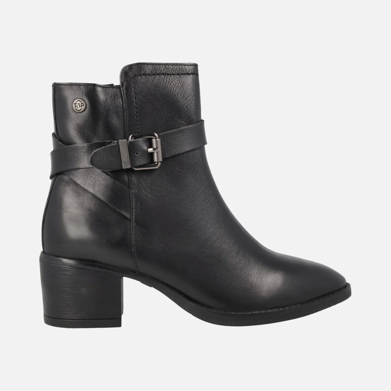 Botines negros de piel de la marca Top3, modelo SS24855 Negro. Botines de piel con adorno de hebilla en el lateral exterior y cierre de cremallera en el interior. Forro textil, planta de piel. Tacones de 5,5 cms de altura. Caña de 13 cms.