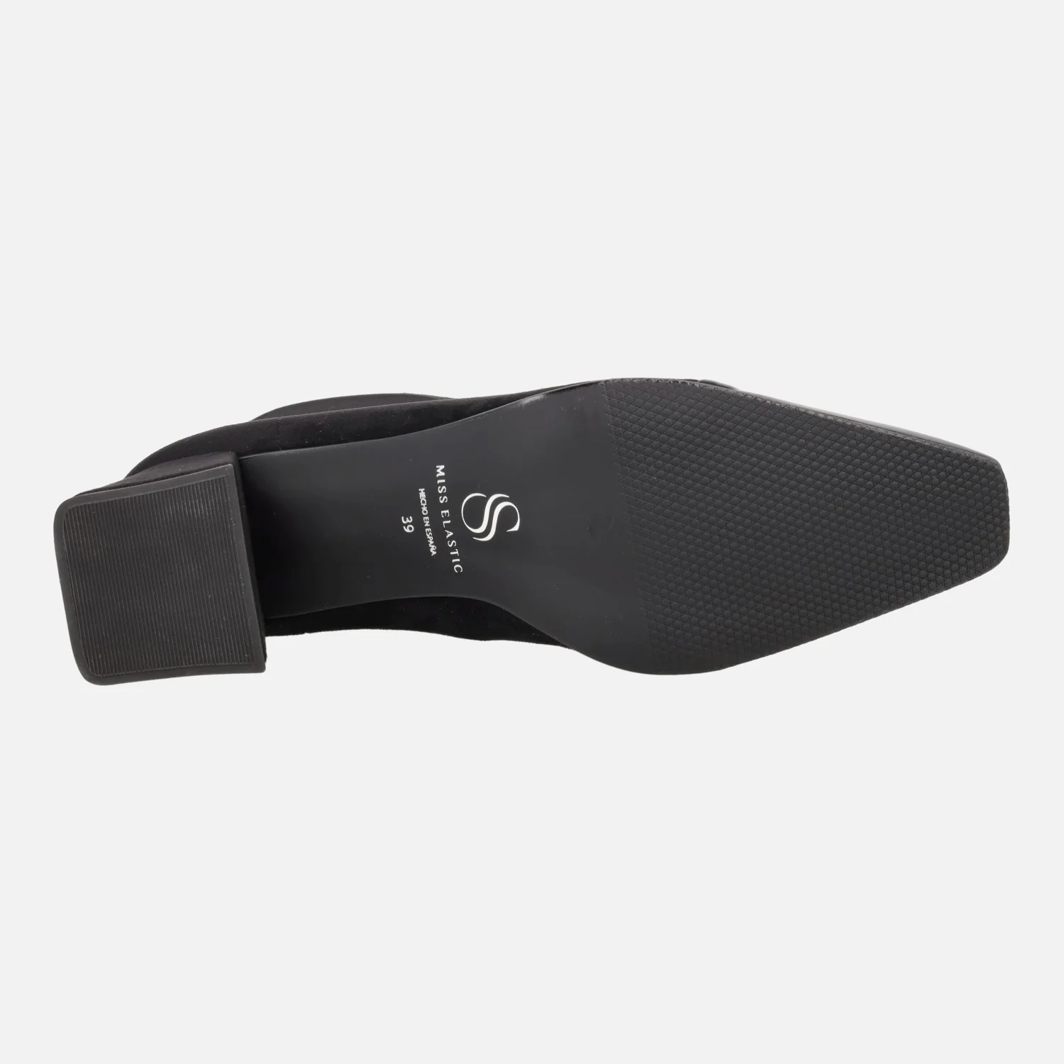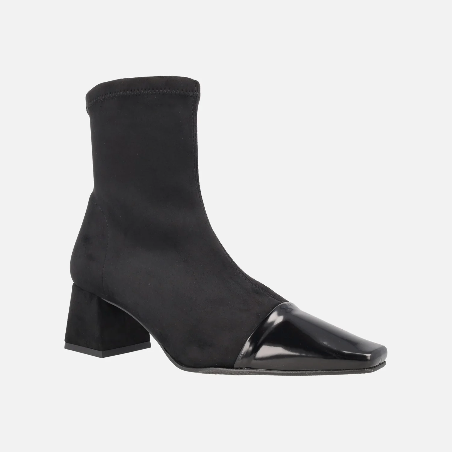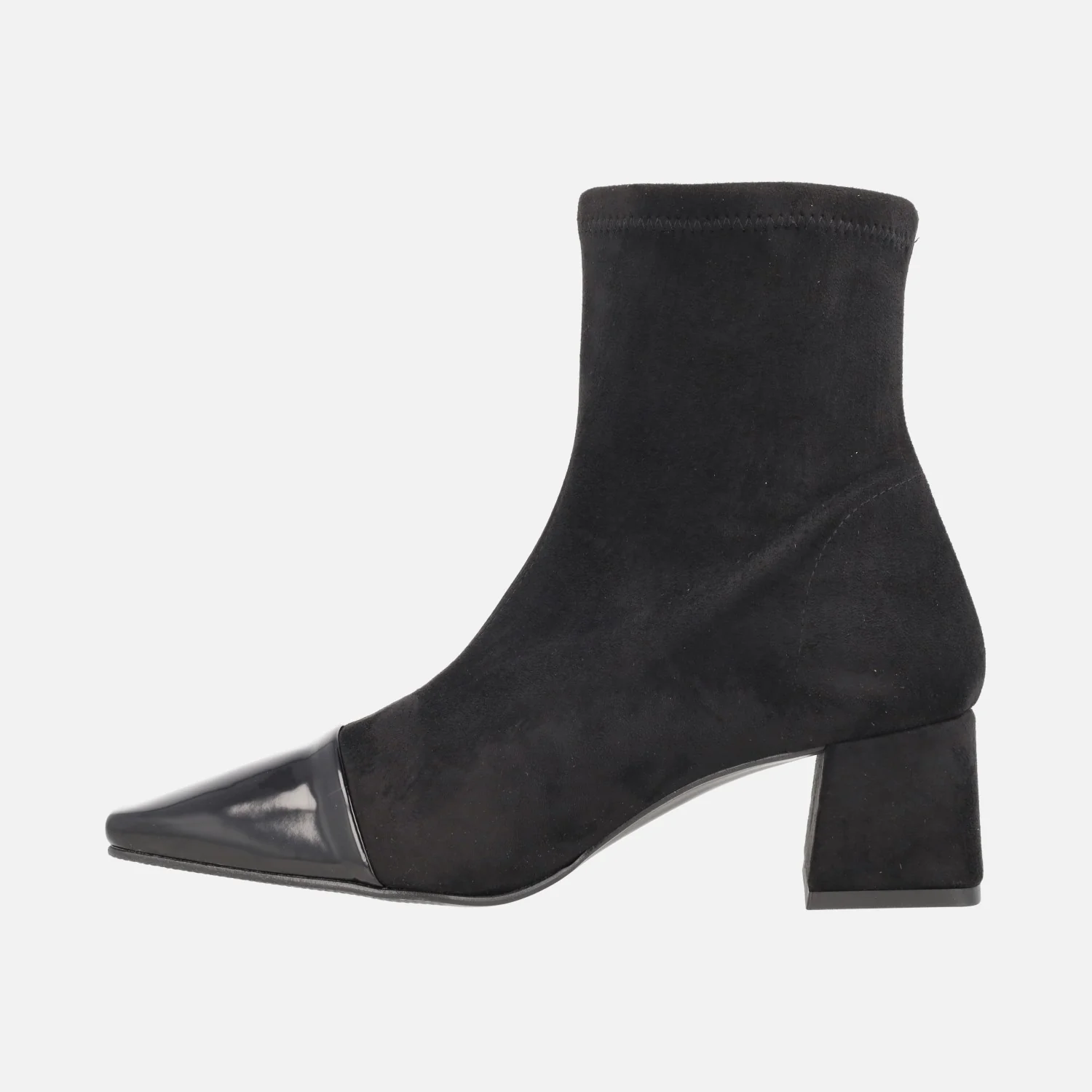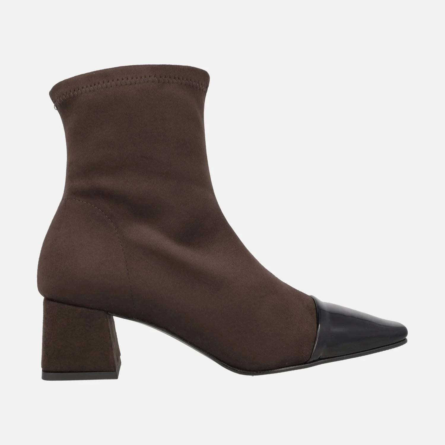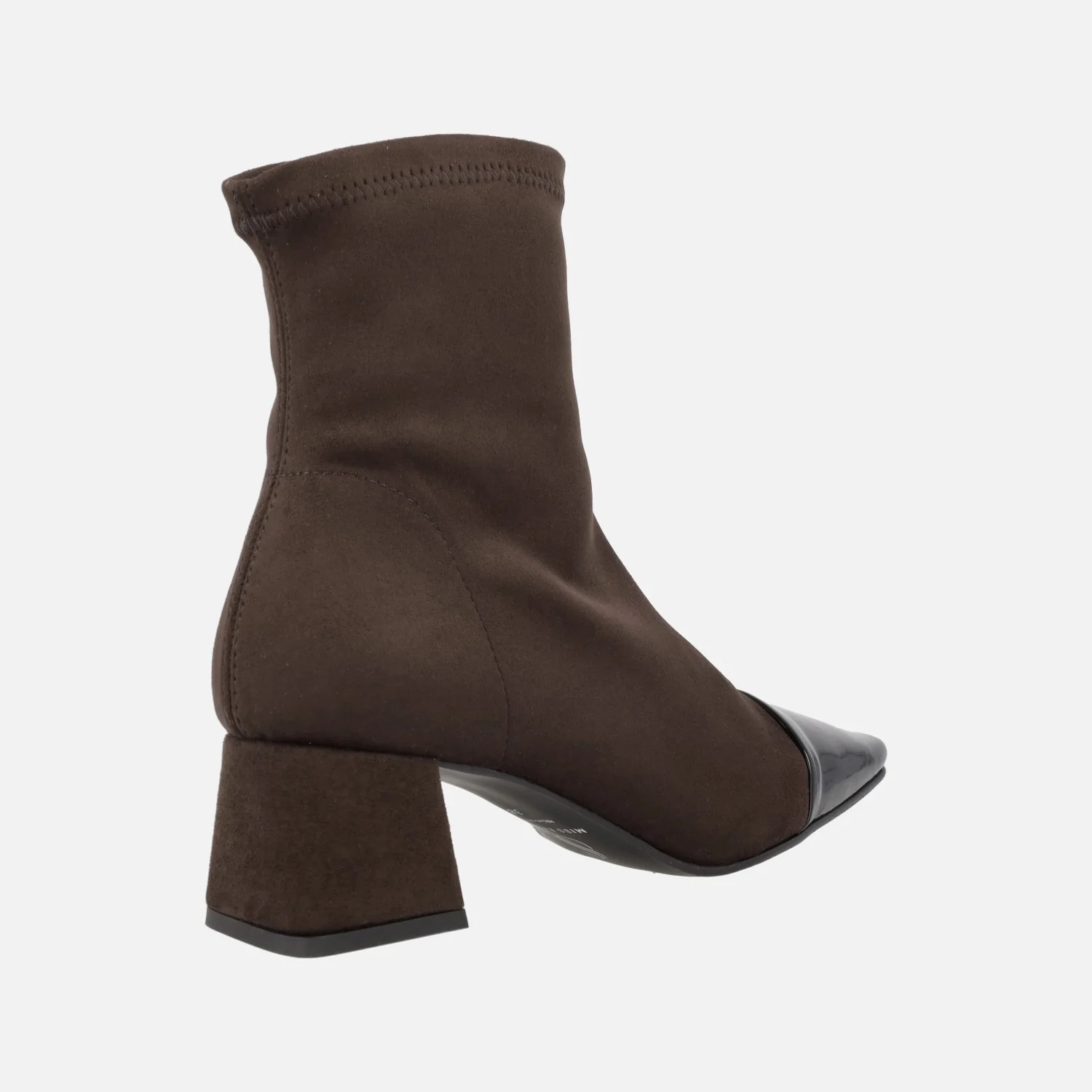 Botines para mujer de la marca Miss Elastic, modelo Laura 076152. Botines con puntera afilada, elaborados en tejido ante strech reciclado repelente al agua. Puntera contrastada en piel acharolada. Botines sin cremallera, estilo calcetín, disponibles en negro, azul marino o marrón (testa). Interior textil. Tacones de 5 cms de altura. Caña de 15 cms de altura. Made in Spain.