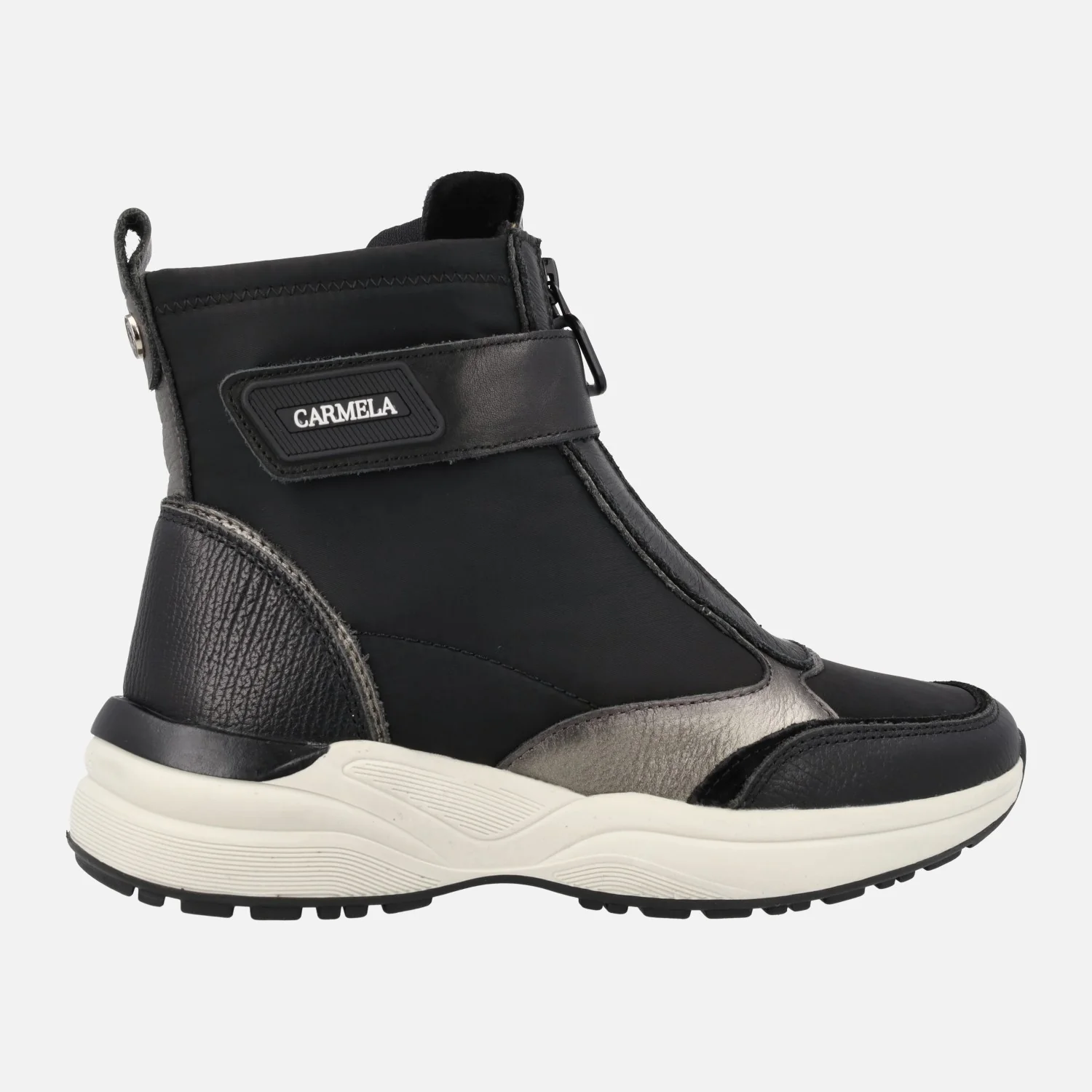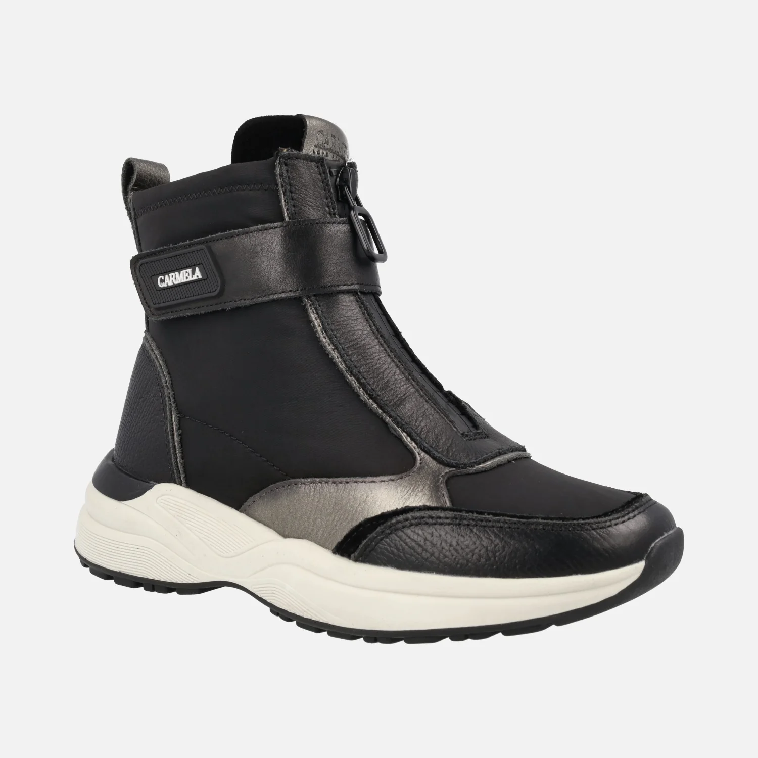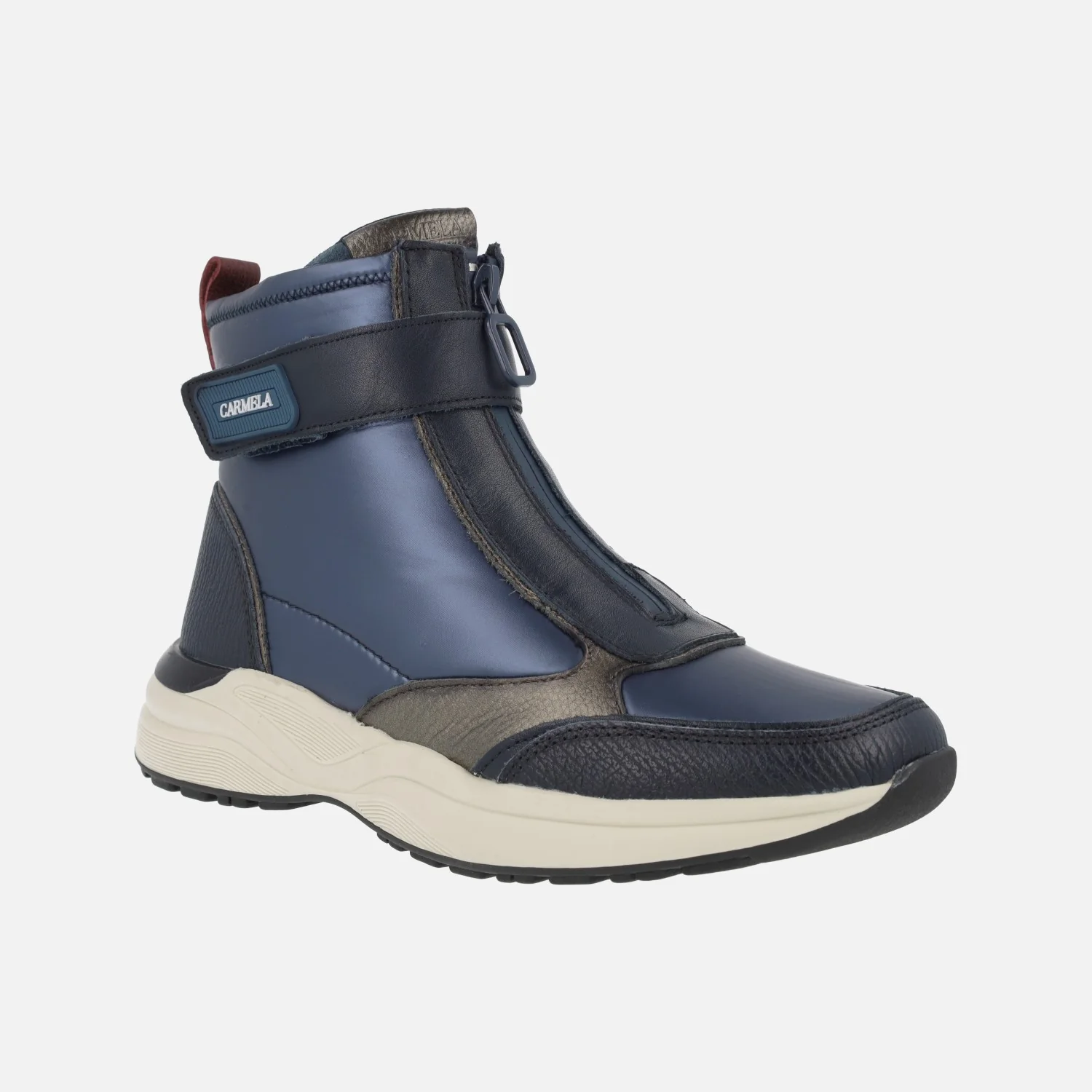 Botines de estilo deportivo de la marca Carmela shoes modelo 161962, disponibles en combinado negro, verde kaki y azul. Botines elaborados en combinado de piel y tejido, con cremallera frontal y tira con velcro. Caña de 12 cms de altura. Interior mixto de piel y tejido. Plantillas extraíbles. Piso de goma con 4 cms de altura trasera (2 cms parte delantera).