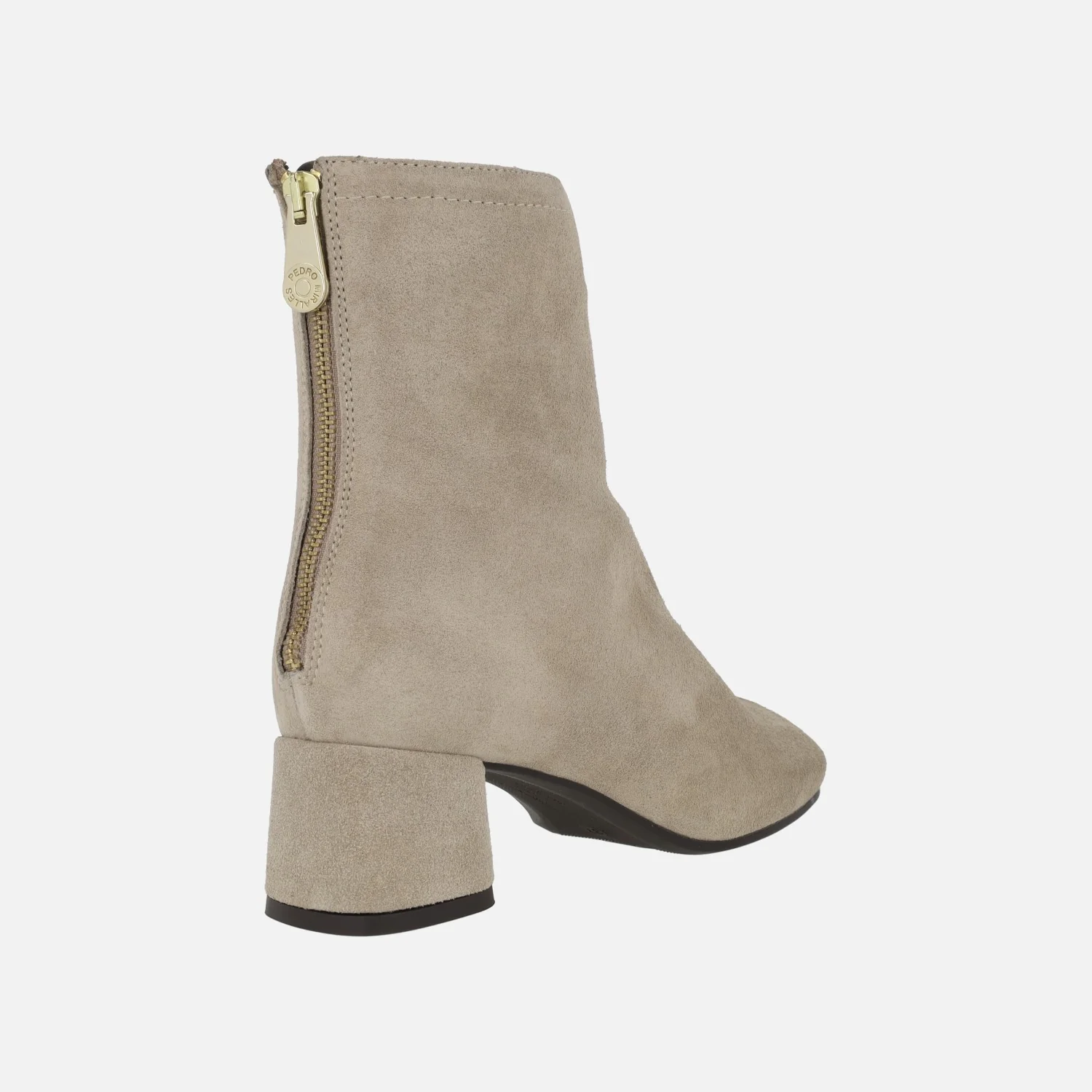 Botines de tacón para mujer de la marca Pedro Miralles modelo Doha 29262 disponibles en piel velour marmota (beige) o testa (marrón oscuro). Botines de ante con cierre de cremallera en la parte trasera. Forro y planta de piel. Piso de goma con tacones de 4,5 cm de altura. Caña de aproximadamente 15 cm de altura. Made in Spain