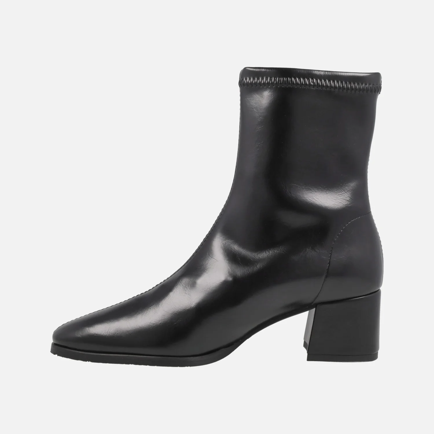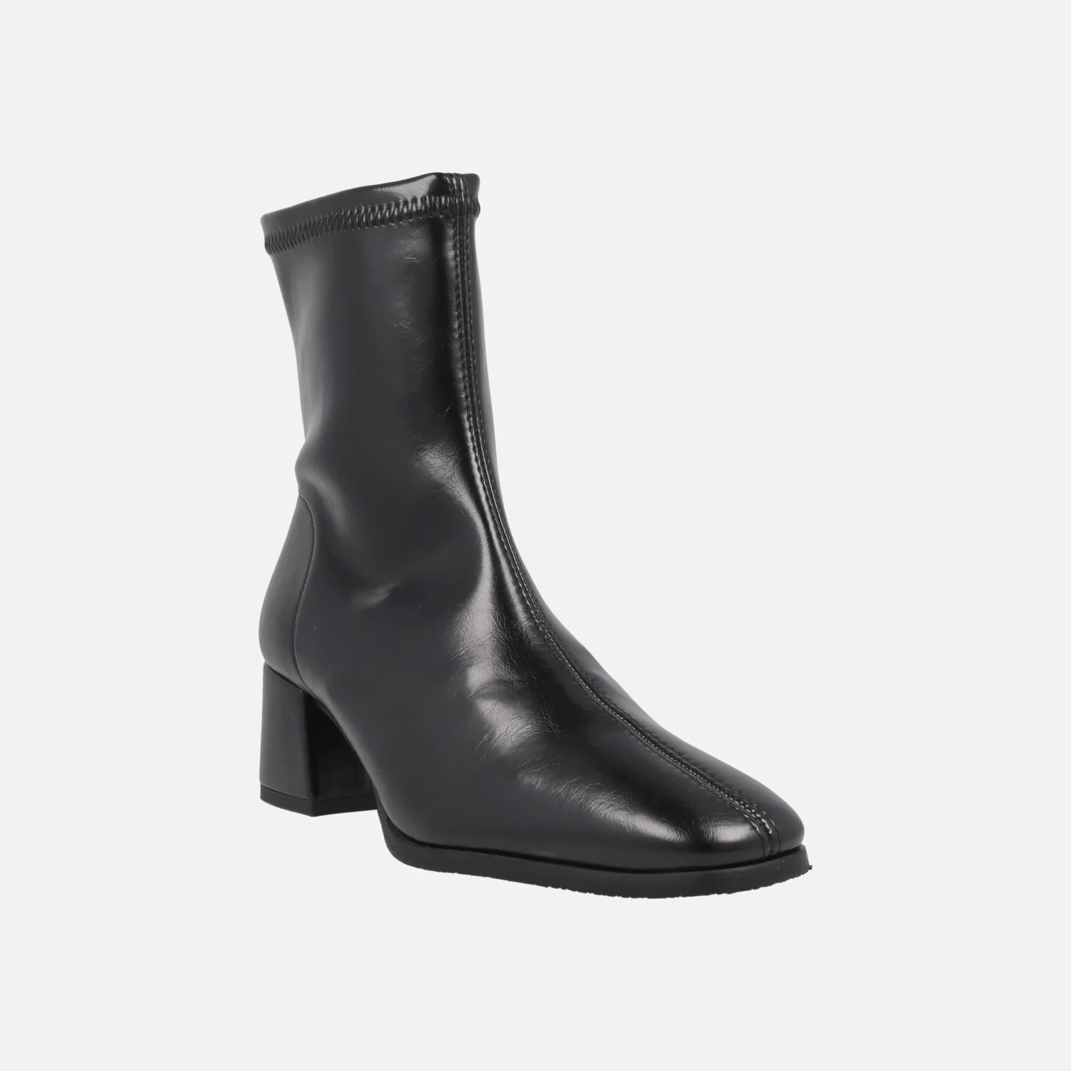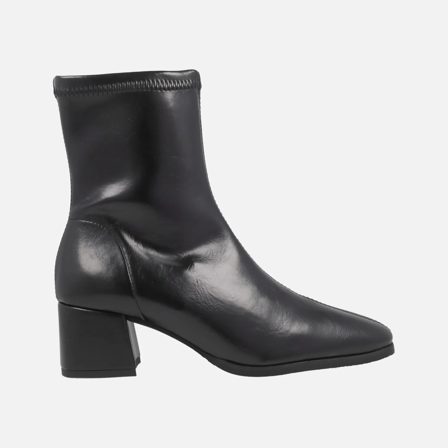 Botines para mujer de la marca española Miss elastic, modelo 078330-62 Negro. Botines elaborados en materiales elásticos (tejido y sintéticos) con efecto piel. Sin cremallera. Exterior tratado con Eco Dry solutions para repeler la lluvia. Interior textil. Piso sintético, con tacones de 5 cm de altura. Caña de aproximadamente 17 cm. Made in Spain.