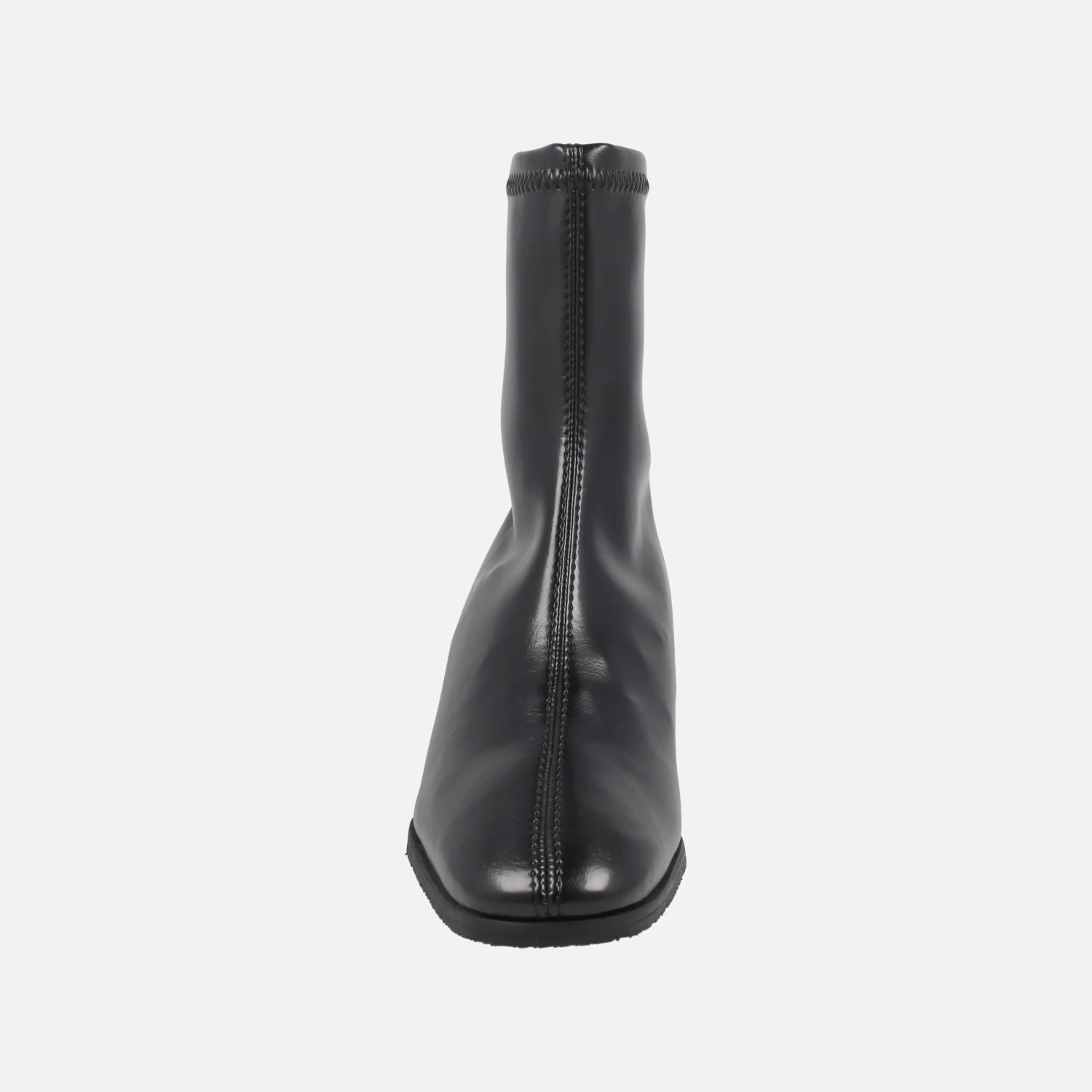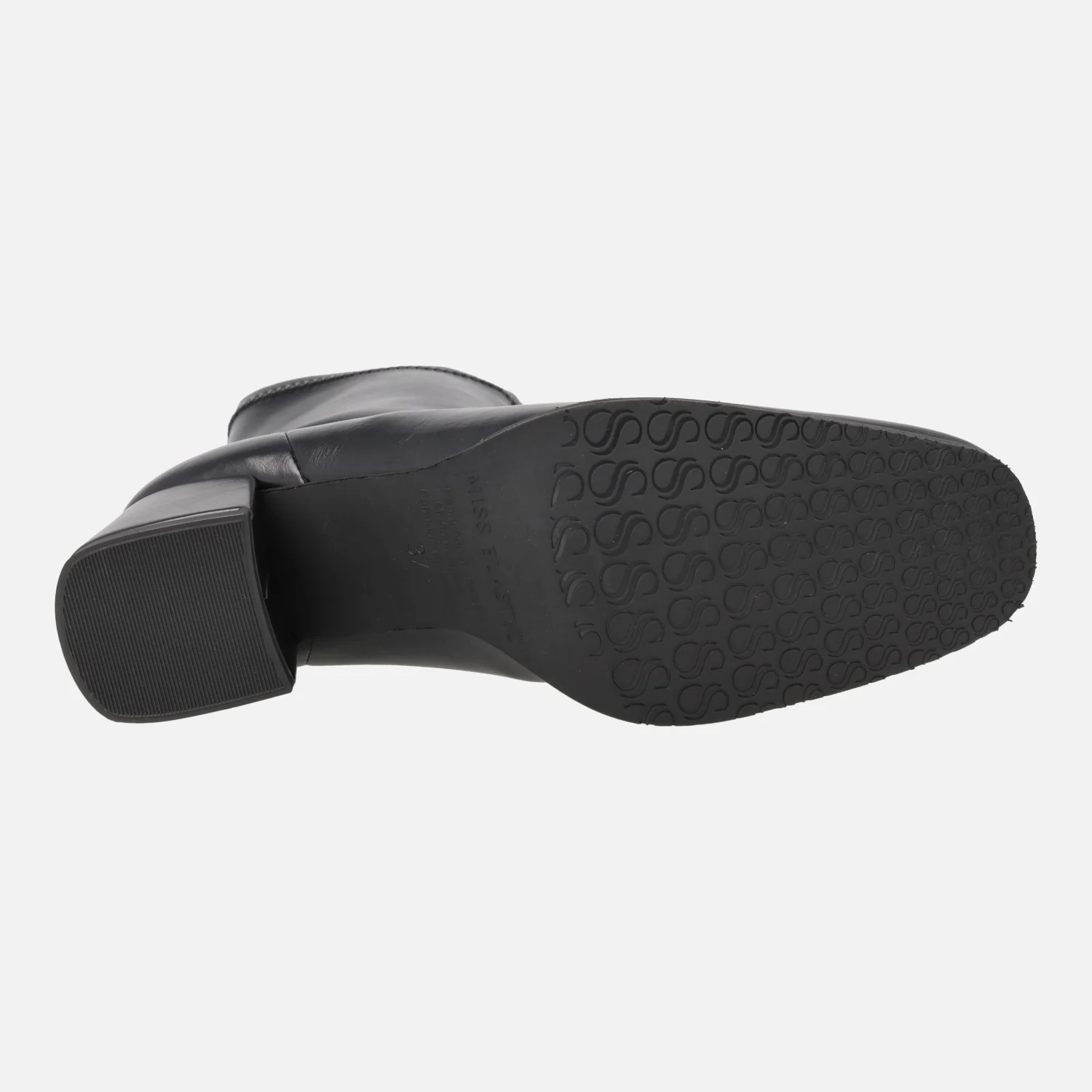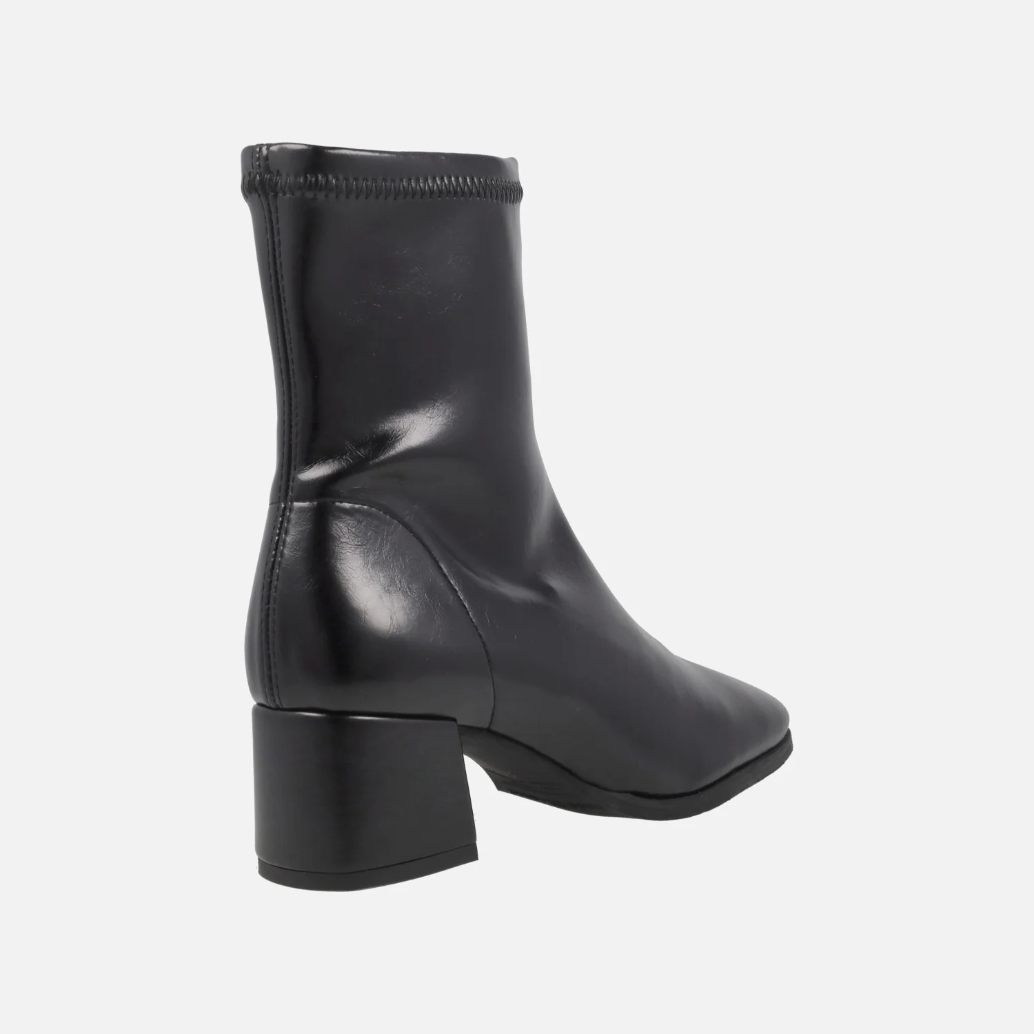 Botines para mujer de la marca española Miss elastic, modelo 078330-62 Negro. Botines elaborados en materiales elásticos (tejido y sintéticos) con efecto piel. Sin cremallera. Exterior tratado con Eco Dry solutions para repeler la lluvia. Interior textil. Piso sintético, con tacones de 5 cm de altura. Caña de aproximadamente 17 cm. Made in Spain.