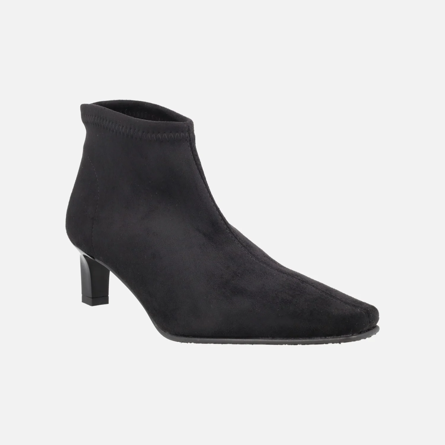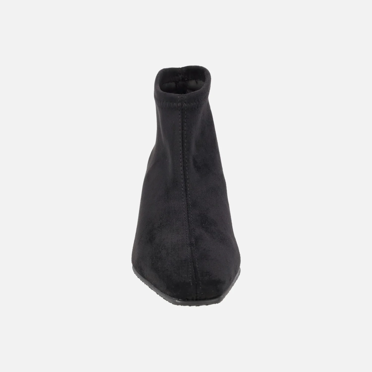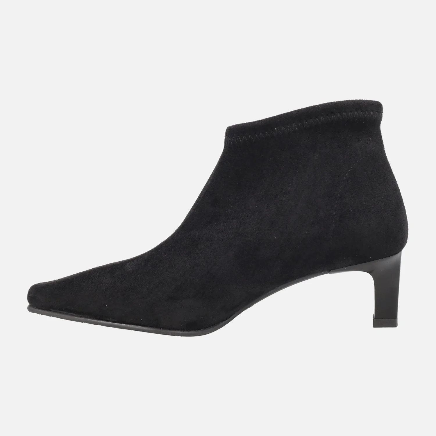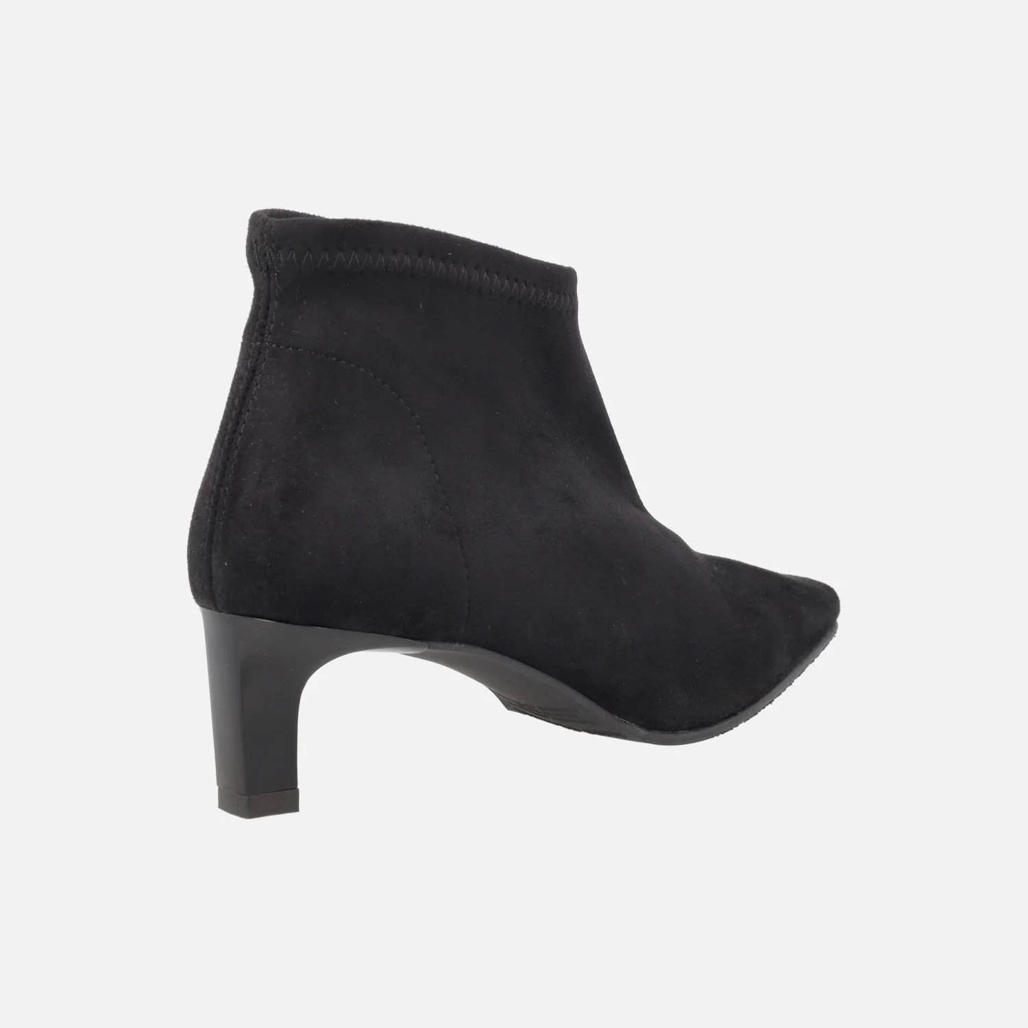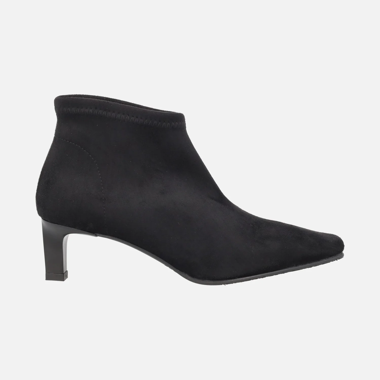 Botines de tejido elástico Miss Elastic modelo 078102-AE Negro. Botines de horma afilada, elaborados en tejido elástico que imita ante, con sistema Eco Dry Solutions para una ligera resistencia a la lluvia. Interior textil. Piso sintético, con tacones de 5 cm de altura. Caña de aproximadamente 10 cm de altura. Made in Spain.
