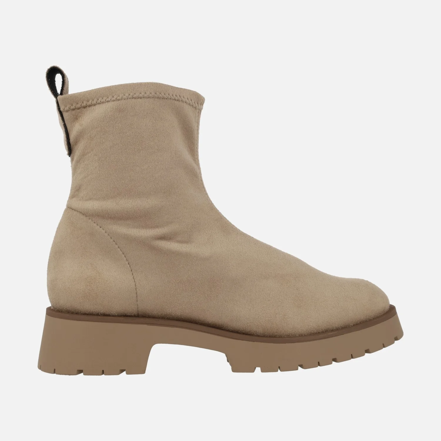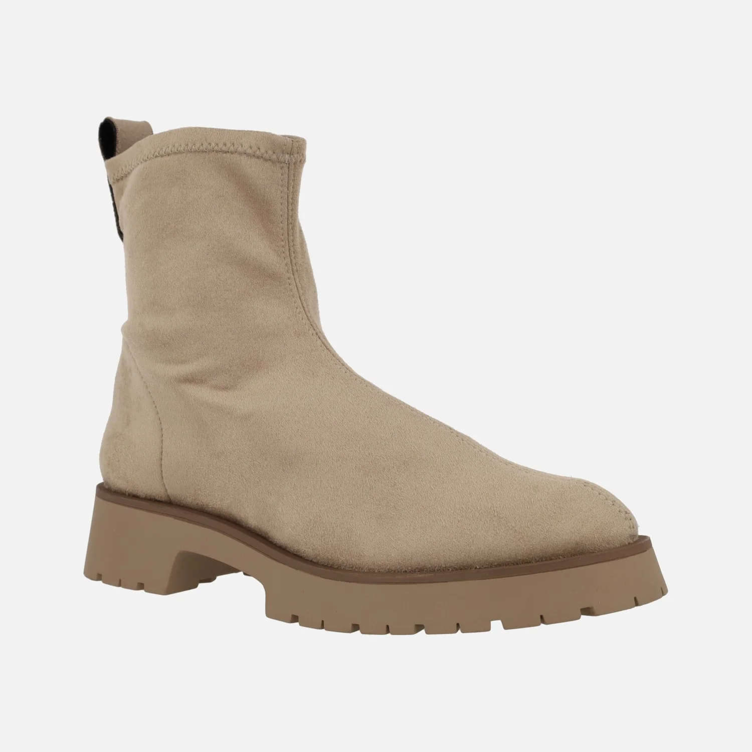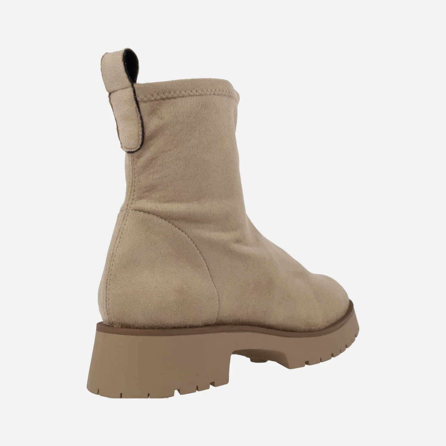 Preciosos botines para mujer de la marca Barminton, modelo 11001, disponibles en tejido acabado en textura ante en beige y negro. Exterior e interior textiles. Piso muy ligero, de goma, con 4 cms de altura de tacón. Caña de 15 cms de altura. Made in Spain.