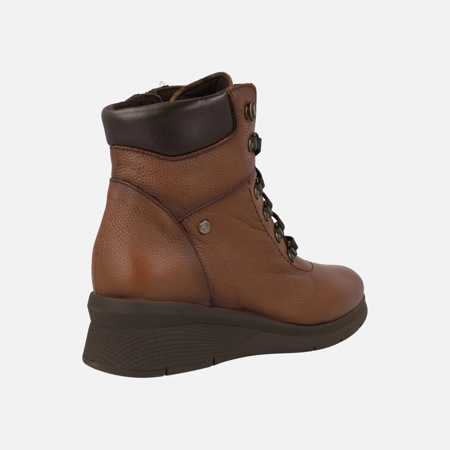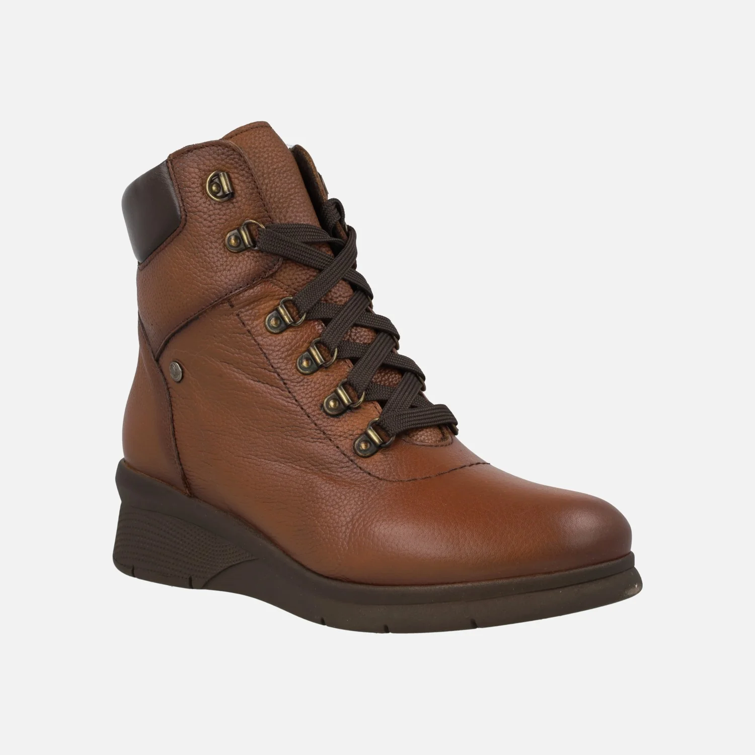 Botines de cordones para mujer de la marca Kaola modelo 7613 cuero. Botines marrones de piel, con collarín acolchado. Cierre de cordones en la parte frontal y cremallera en el lateral. Interior textil con plantillas de piel extraíbles. Piso de goma con 5 cms de altura trasera (2 cms parte delantera). Caña de 11,5 cms. Made in SPain.