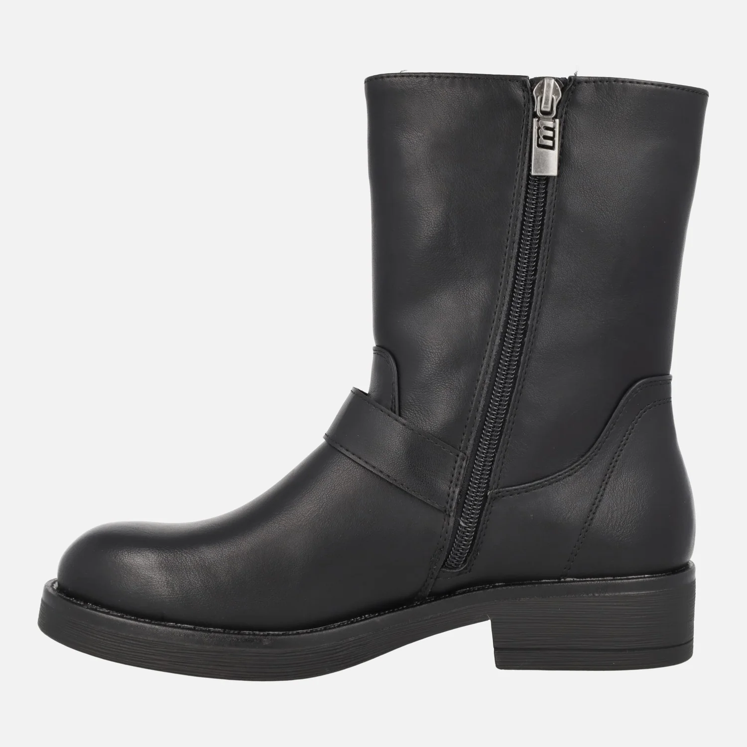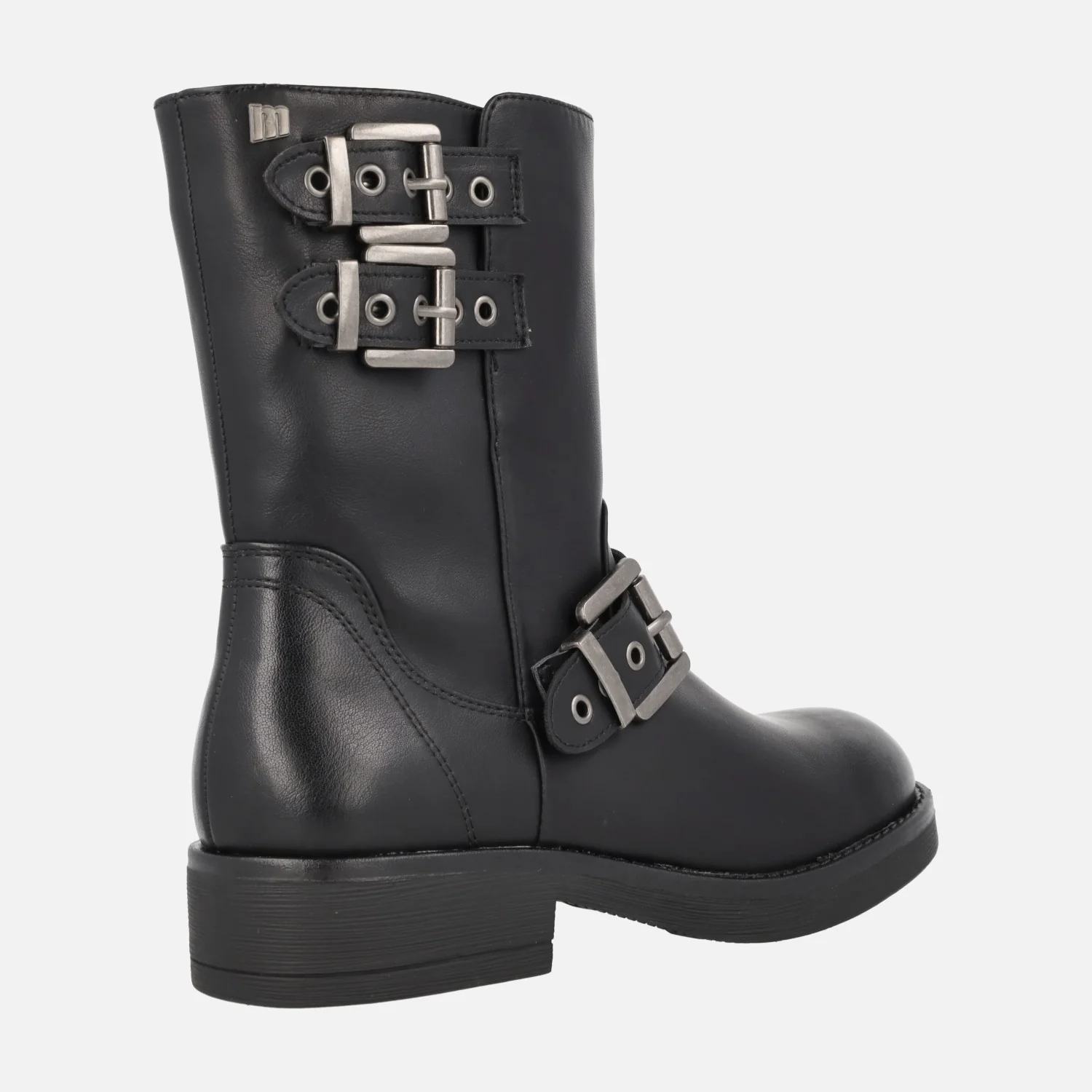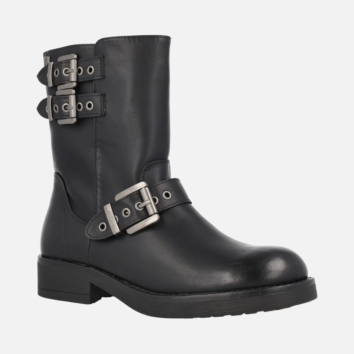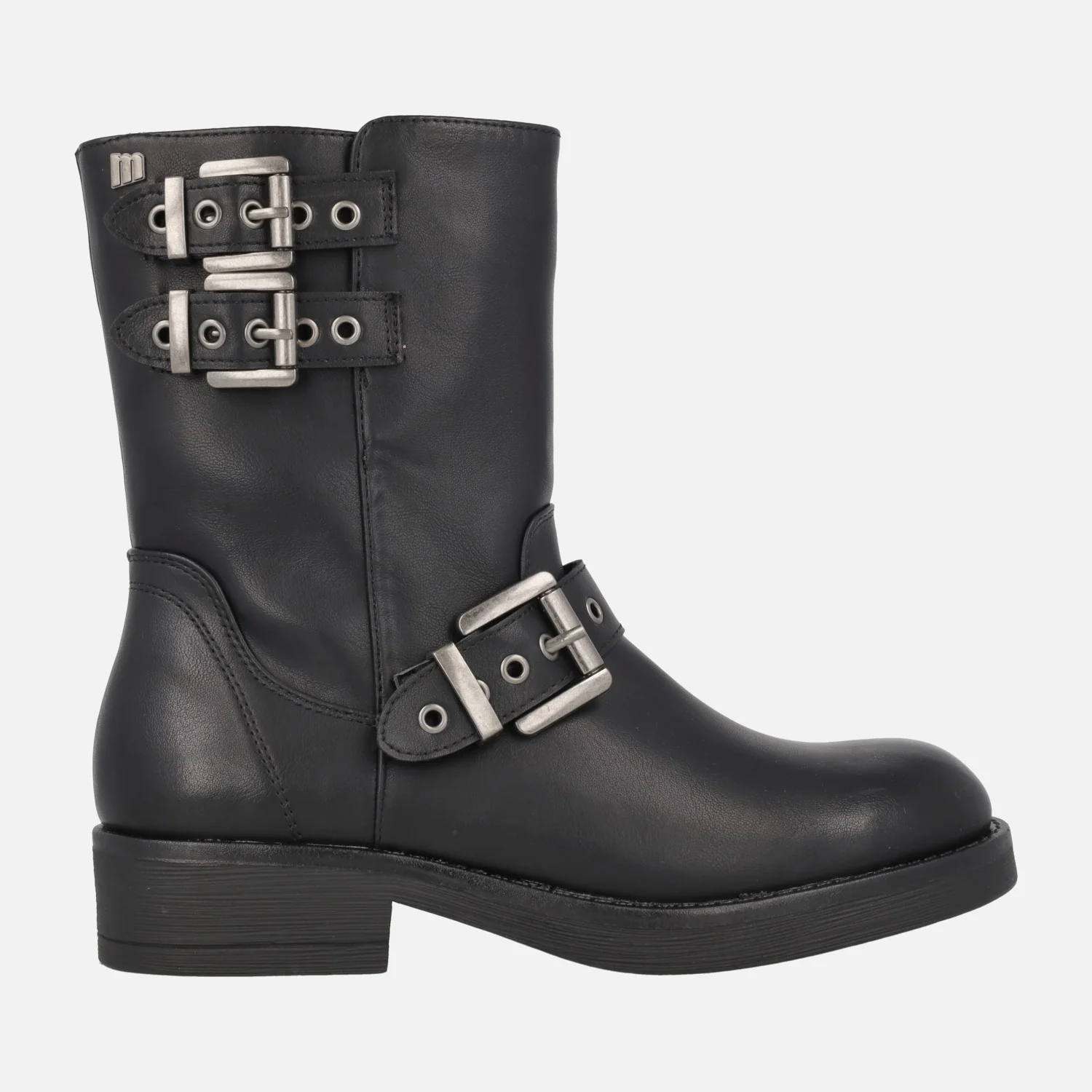 Botines de estilo motero para mujer de la marca Mustang, modelo Bruna 59832 Negro. Botines negros de piel, con detalle de tres hebillas plateadas en el lado exterior, cierre de cremallera en el lado interior. Interior mixto, en tejido y sintéticos. Caña de 18,5 cms de altura. Piso de goma, de 3,5 cms de tacón (2 cms altura delantera).