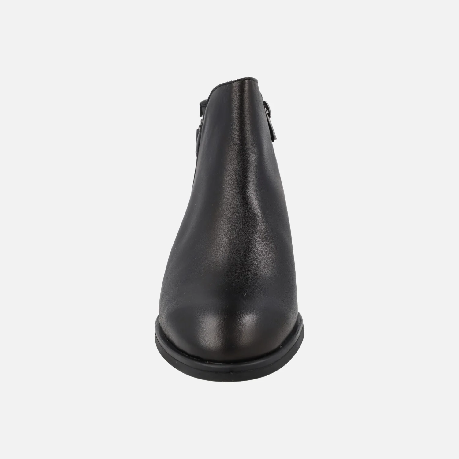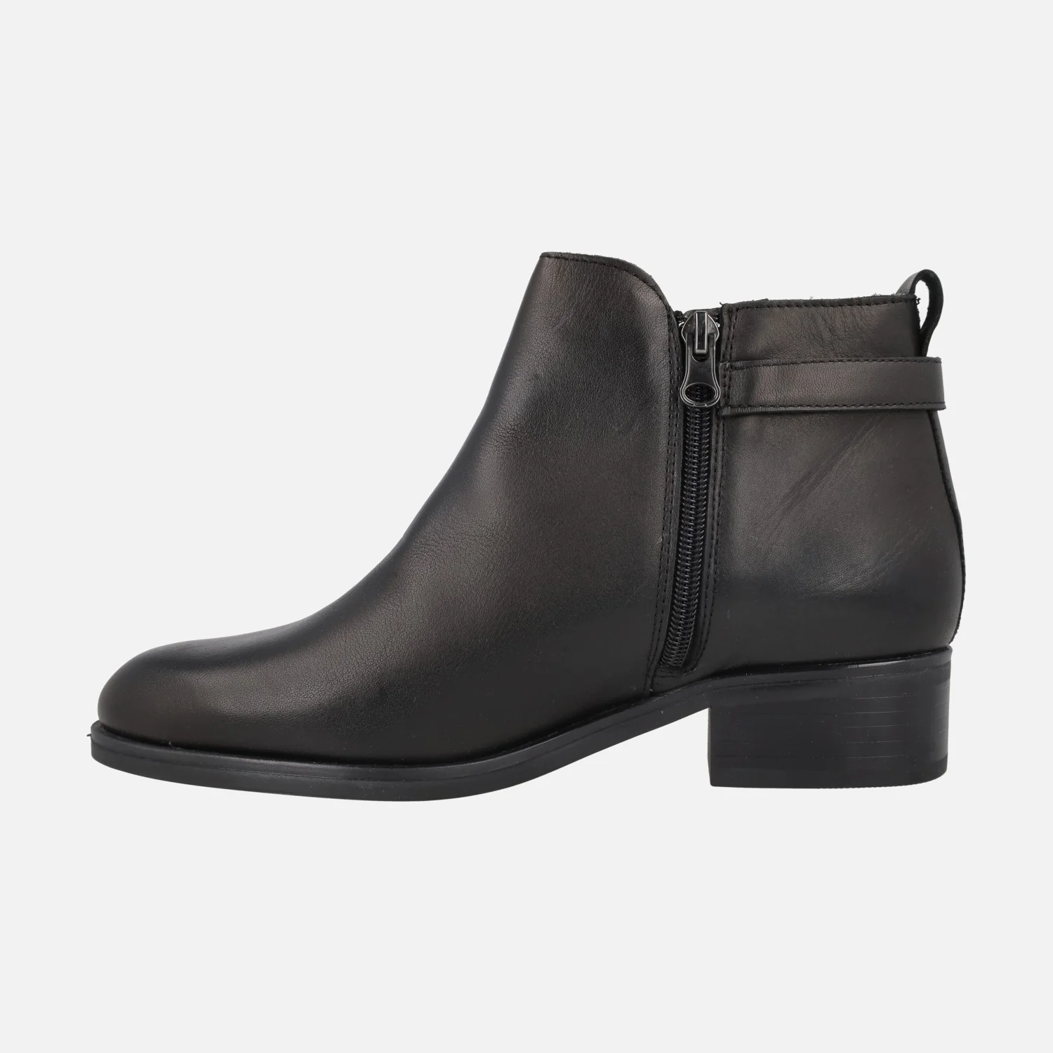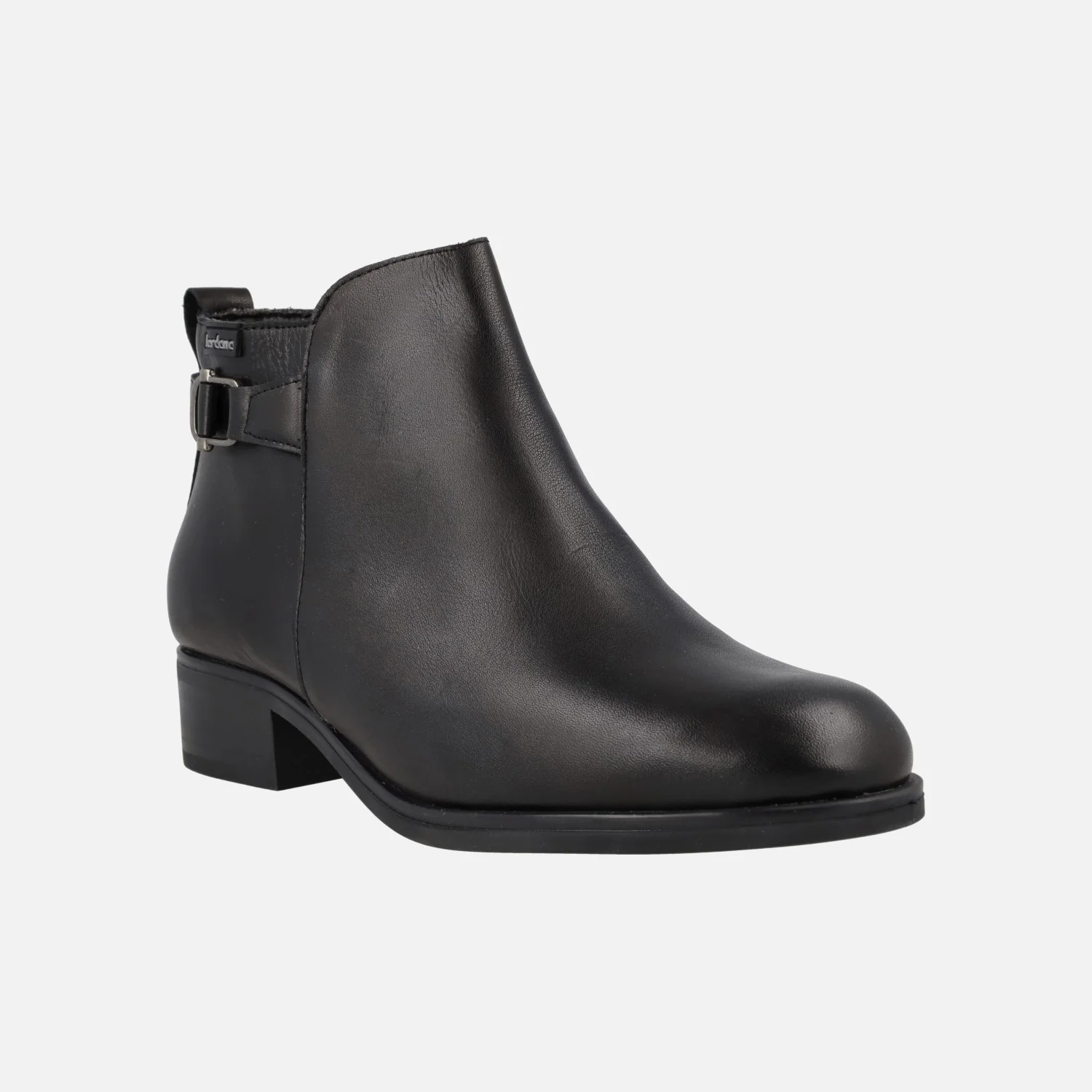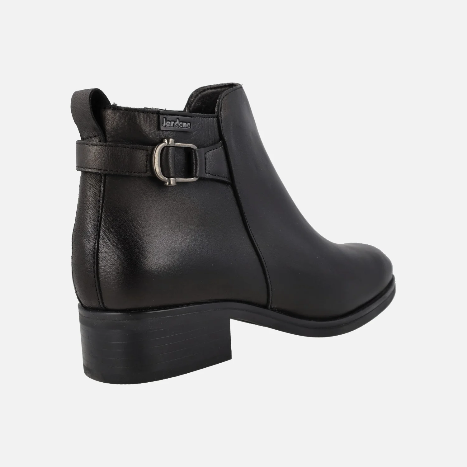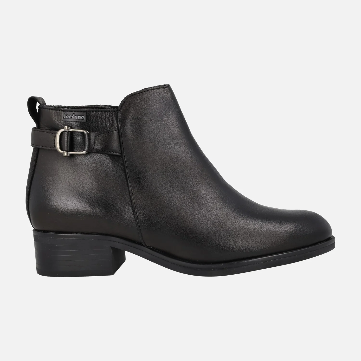 Botines negros de piel para mujer de la marca Jordana, modelo 4358 Negro. Botines de piel con adorno metálico color plomo en la parte trasera, cierre de cremallera en el lado interior. Plantillas forradas de piel. Interior mixto, combinando piel y otros materiales. Suela sintética, con tacones de 4 cm de altura. Caña de aproximadamente 10,5 cm.