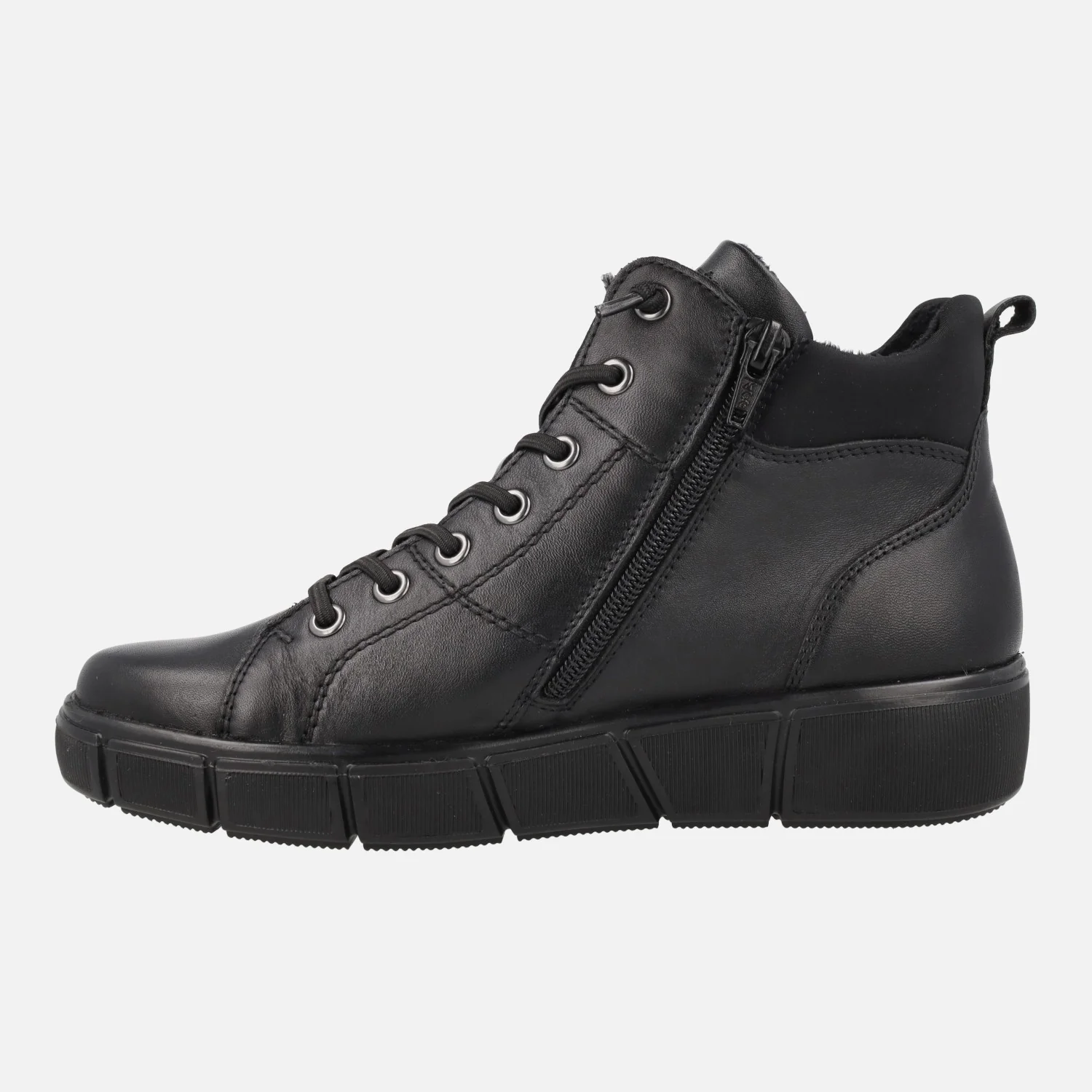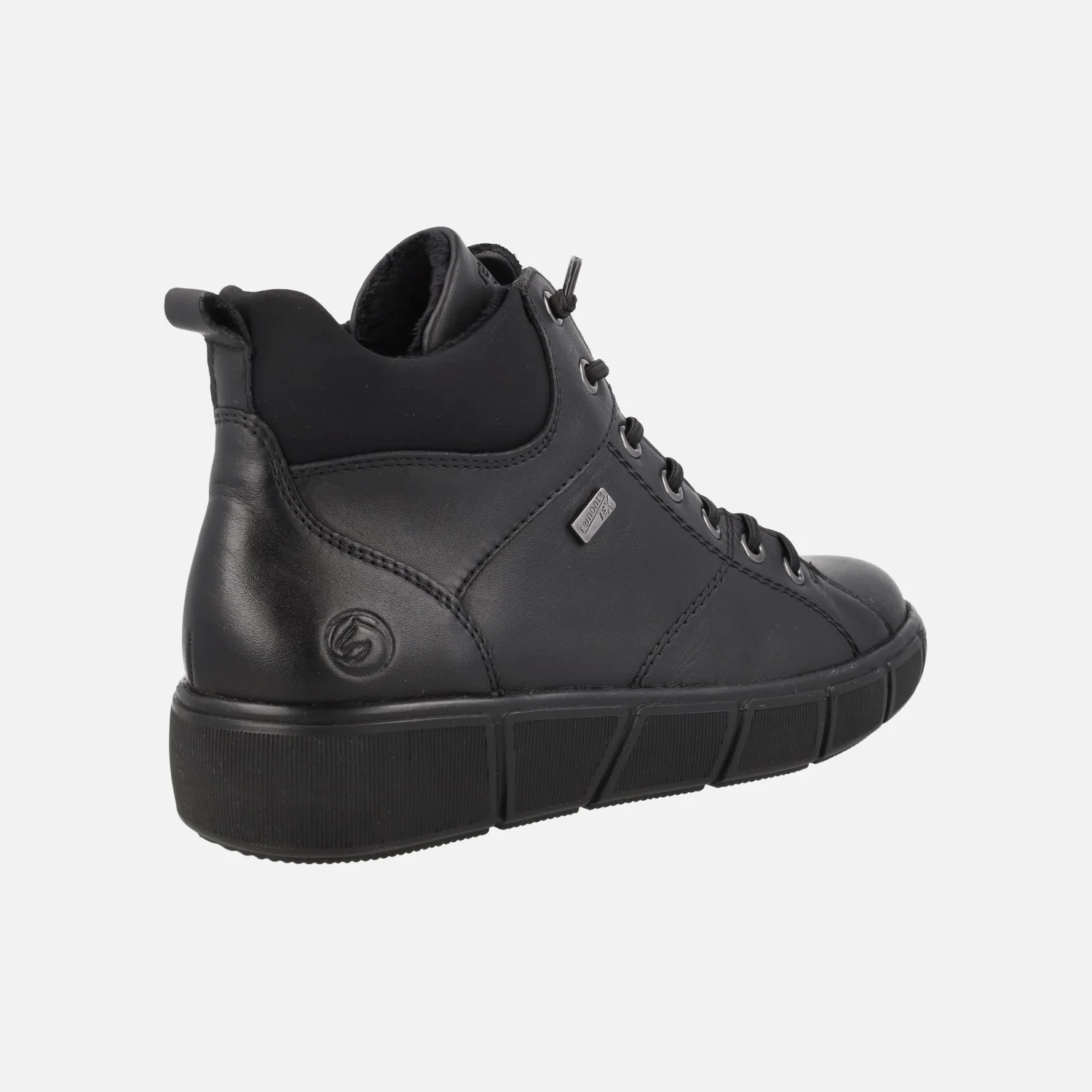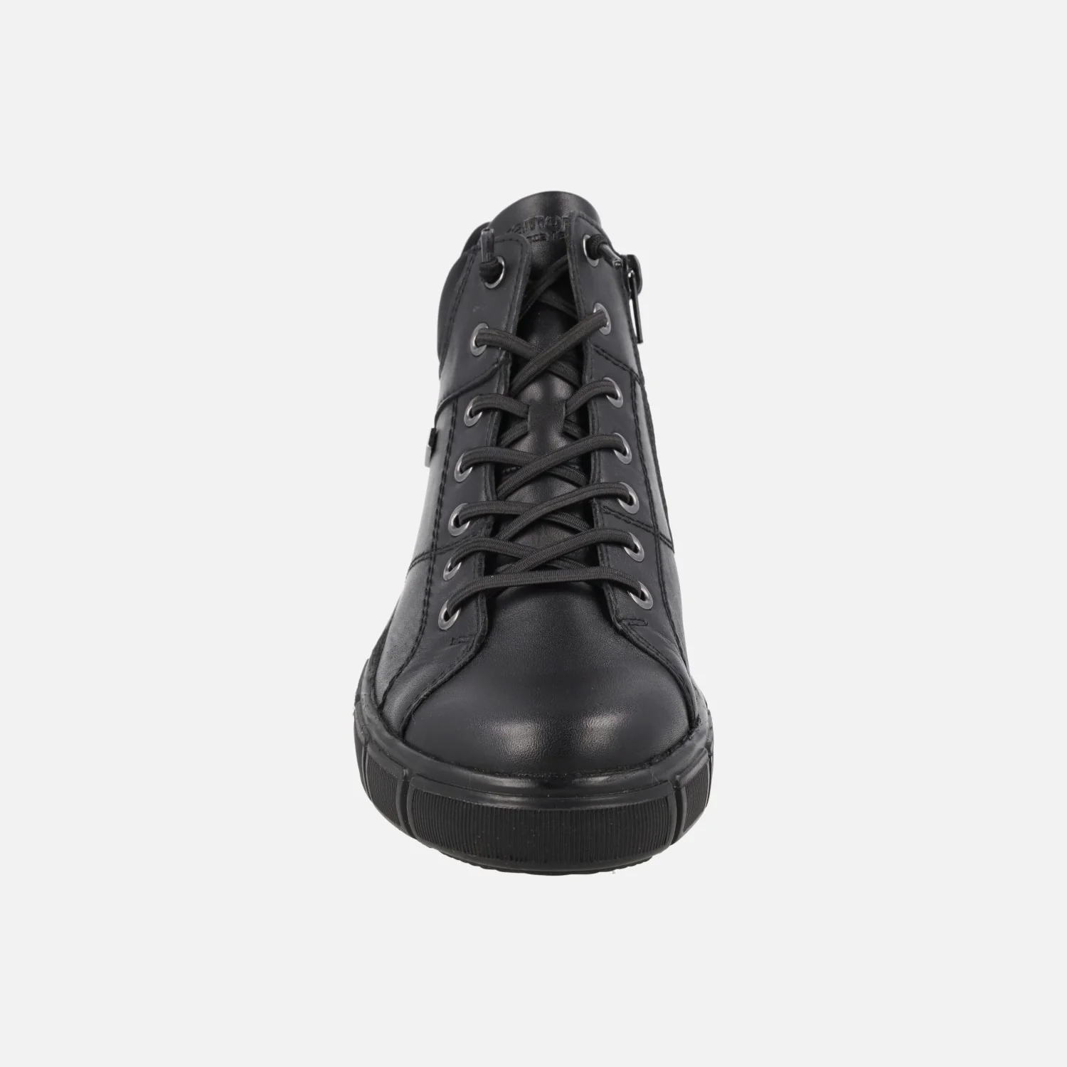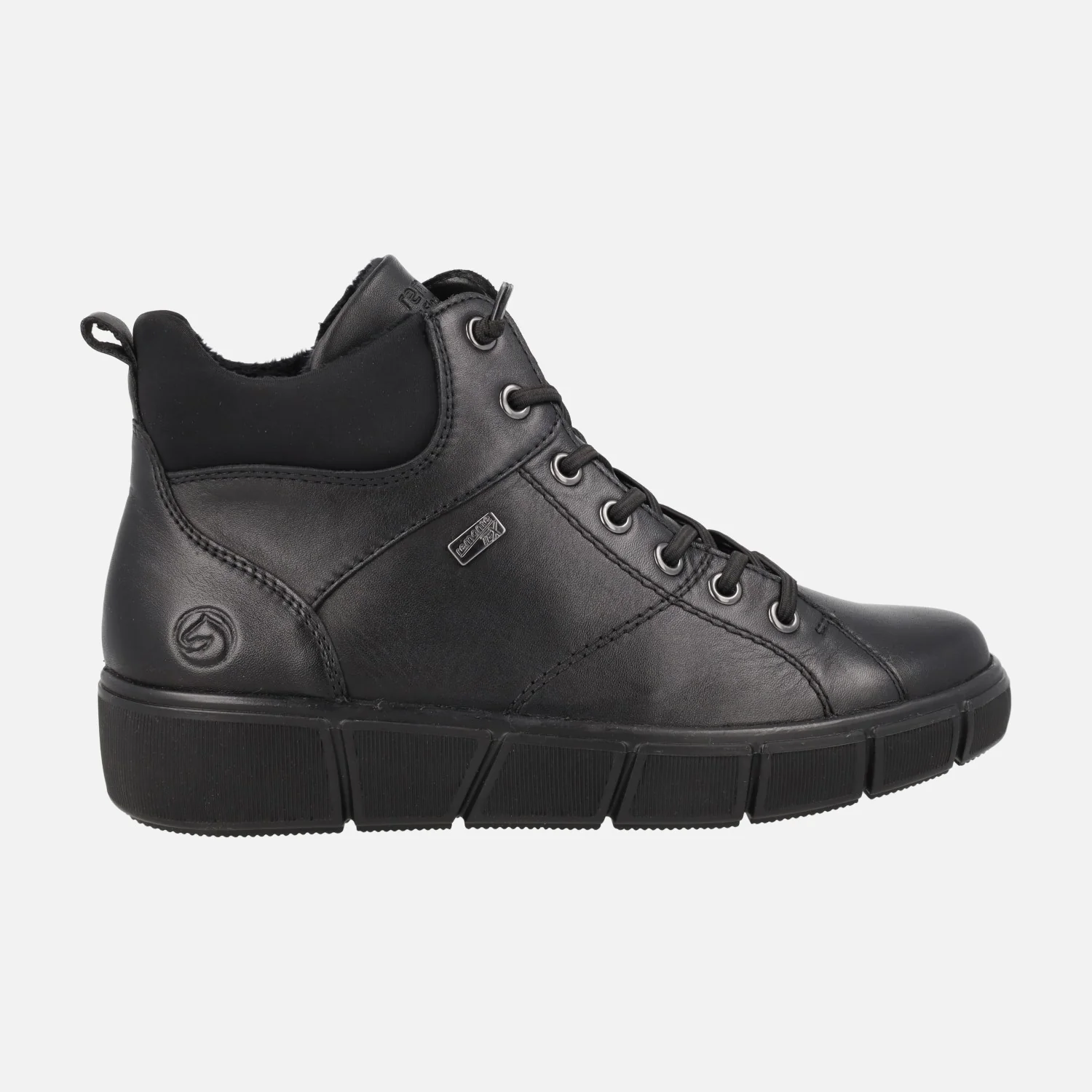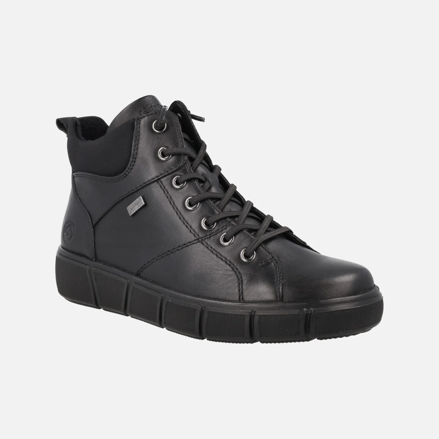 Botines de estilo deportivo de la marca Remonte, modelo D1T76-00 Negro. Botines elaborados en piel negra, con membrana impermeable resistente al agua y gran aislante térmico. Cierre con cordones elásticos (recambio de cordones textiles incluidos). Cierre de cremallera lateral. Collarín textil. Forro y plantillas de pelo, plantillas extraíbles. Piso sintético, con 3,5 cm de altura trasera (2 cm parte delantera). Caña de aproximadamente 10 cm de altura.