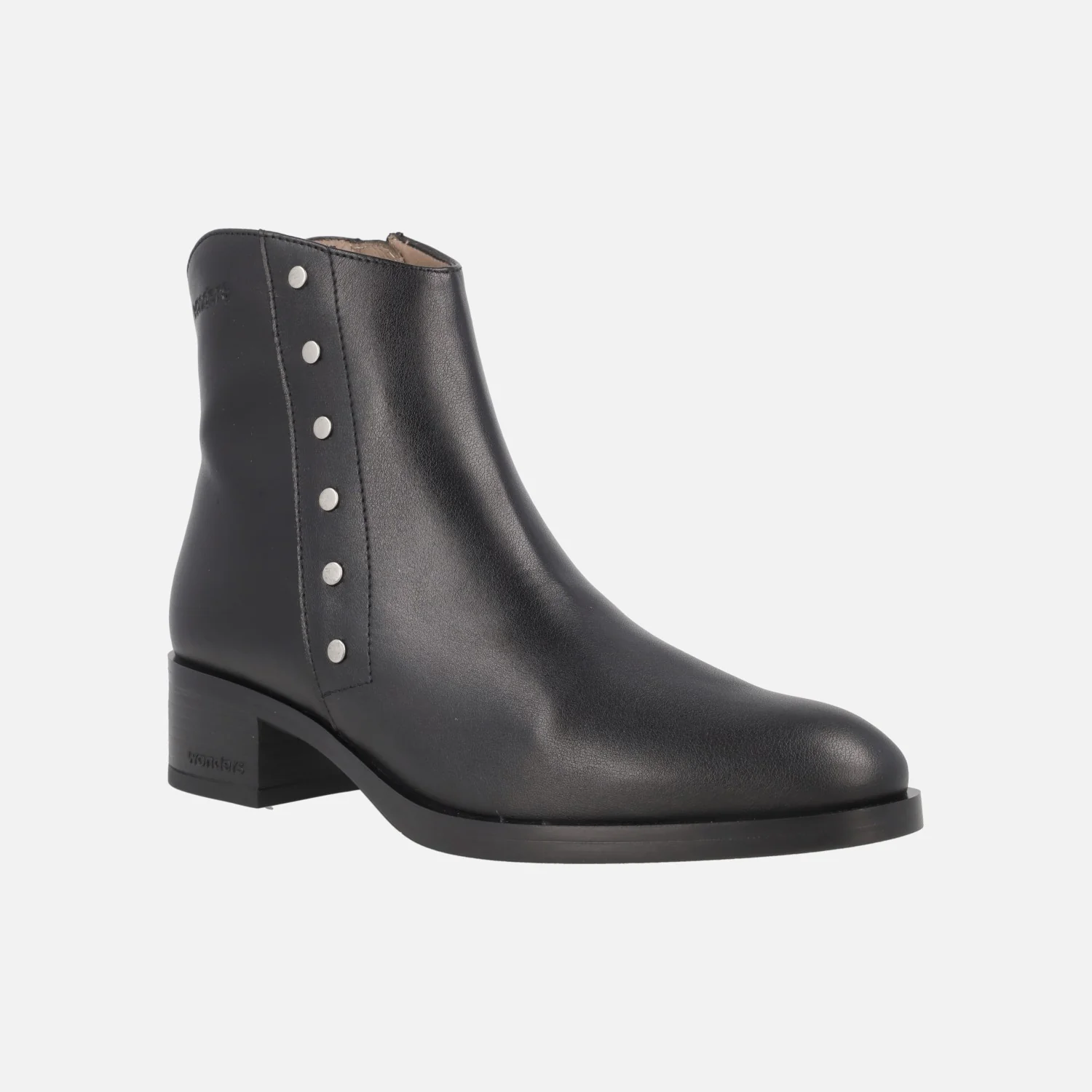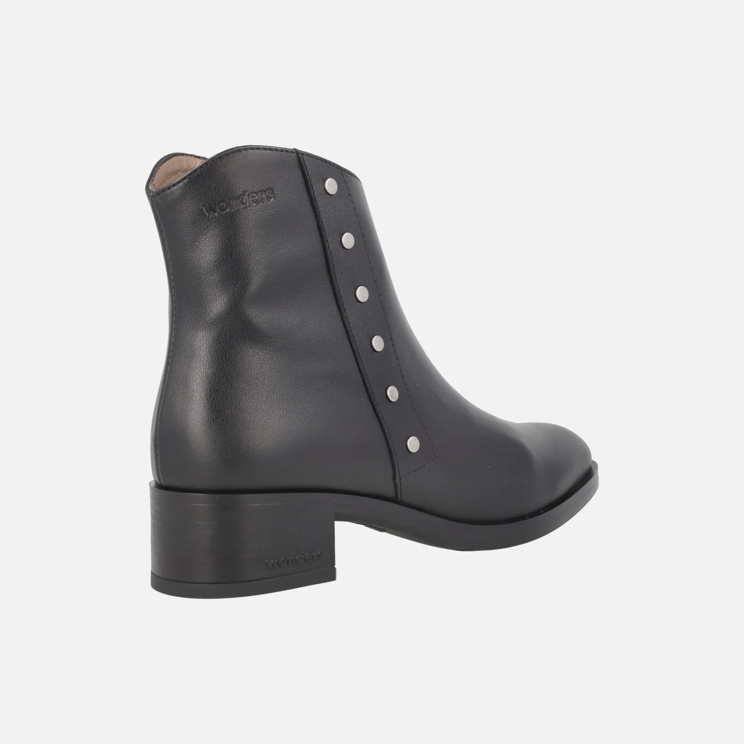 Botines de piel Wonders modelo D-1807 Isy negro. Botines negros de piel con detalle de tachas metálicas plateadas en el lado exterior. Cierre de cremallera interior. Interior mixto en piel y tejido. Piso sintético, con tacones de 4 cm de altura. Caña de 13 cm.