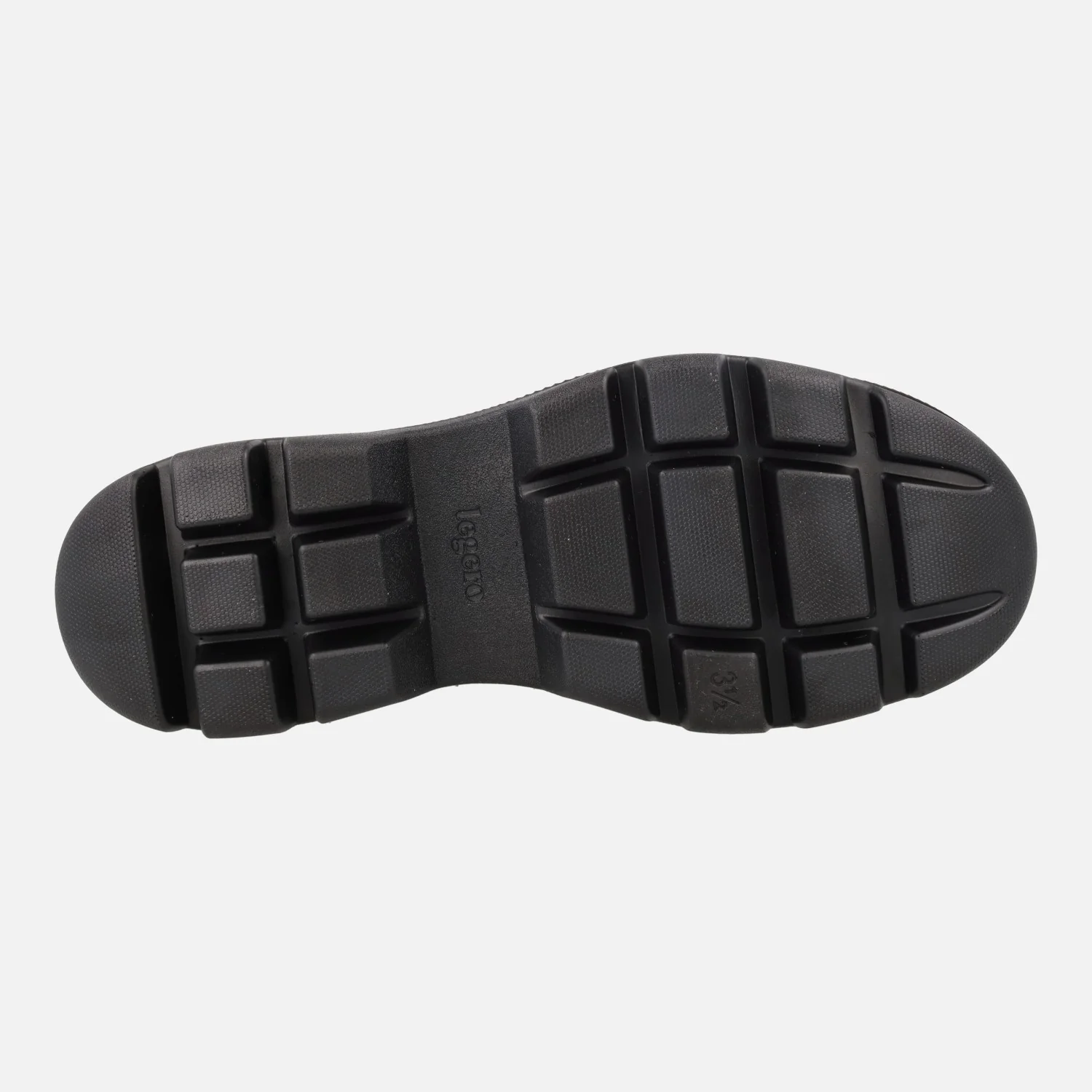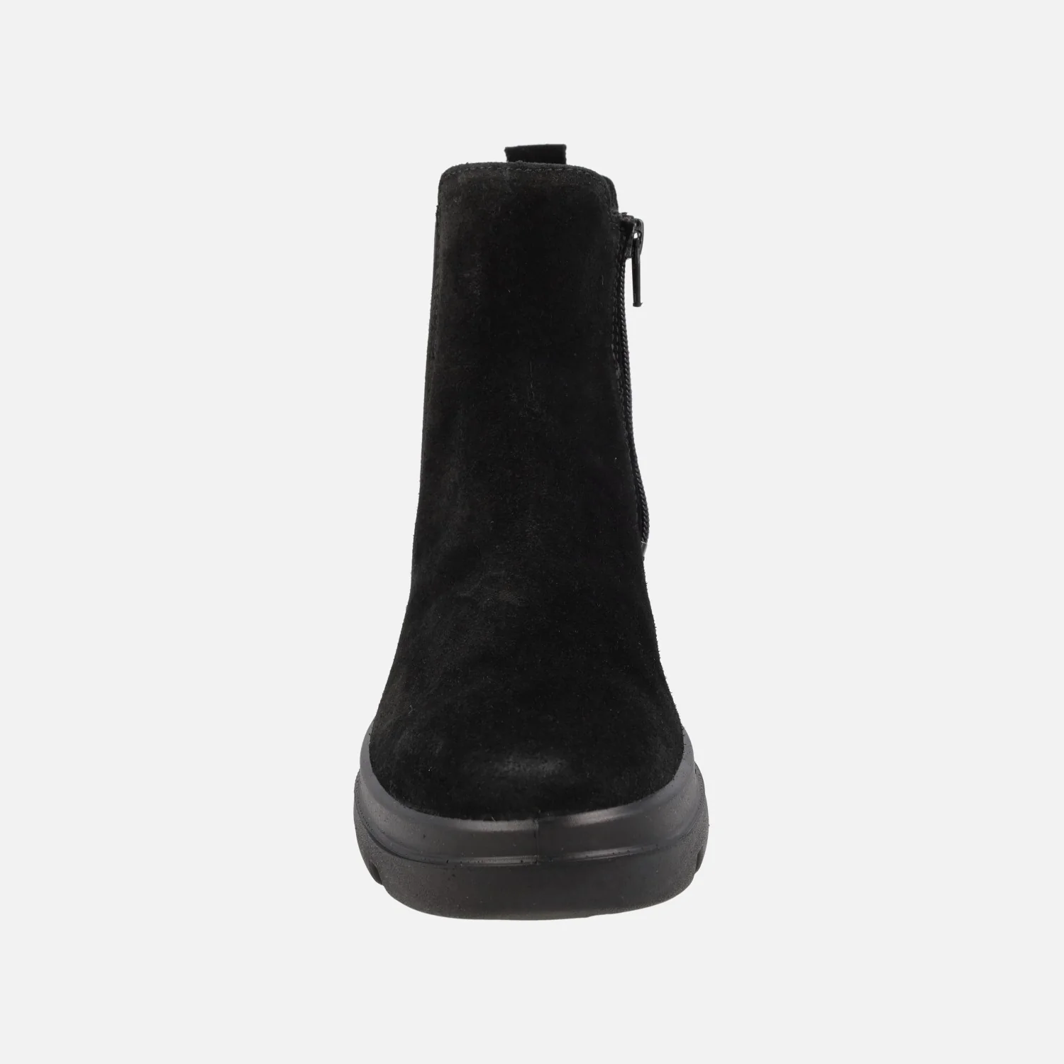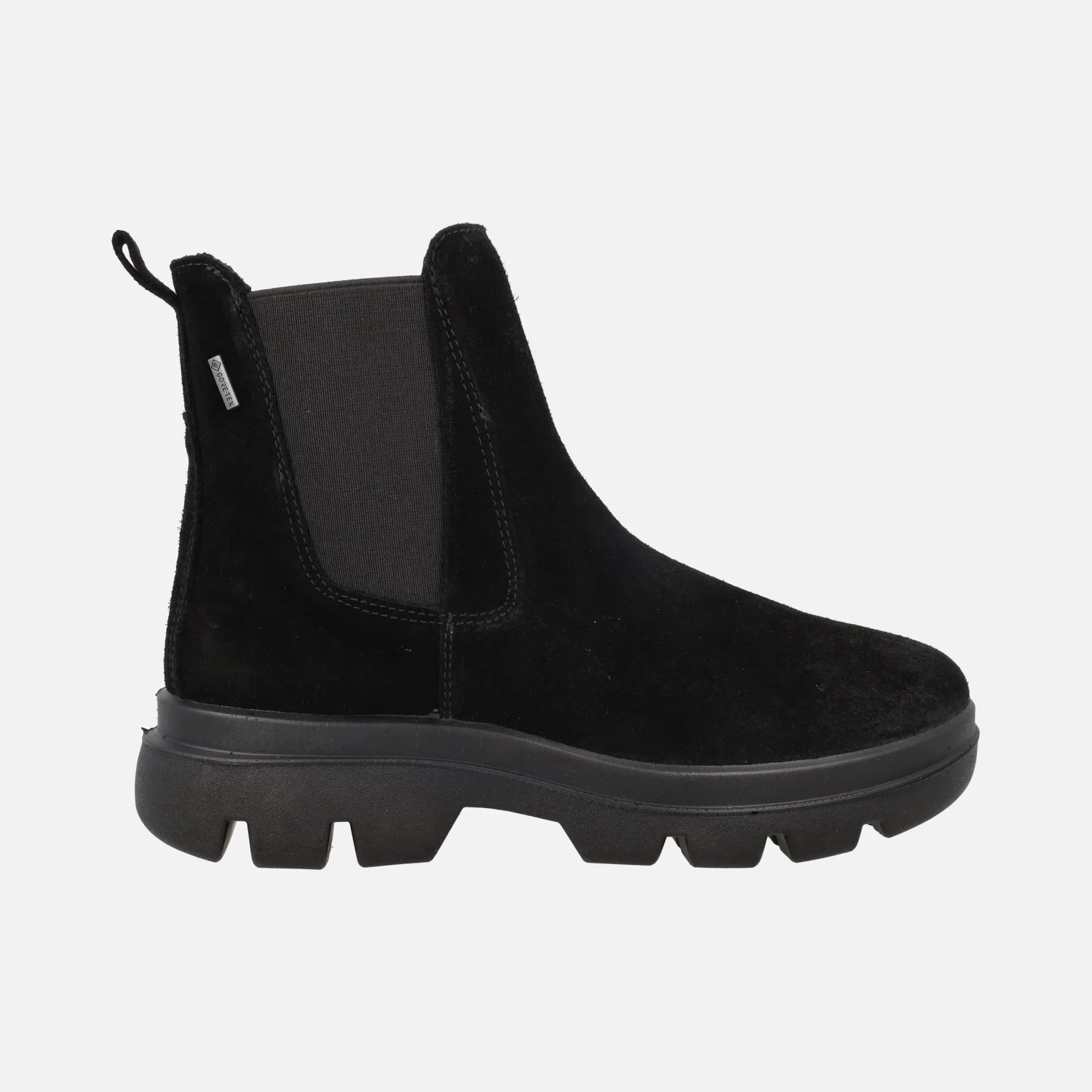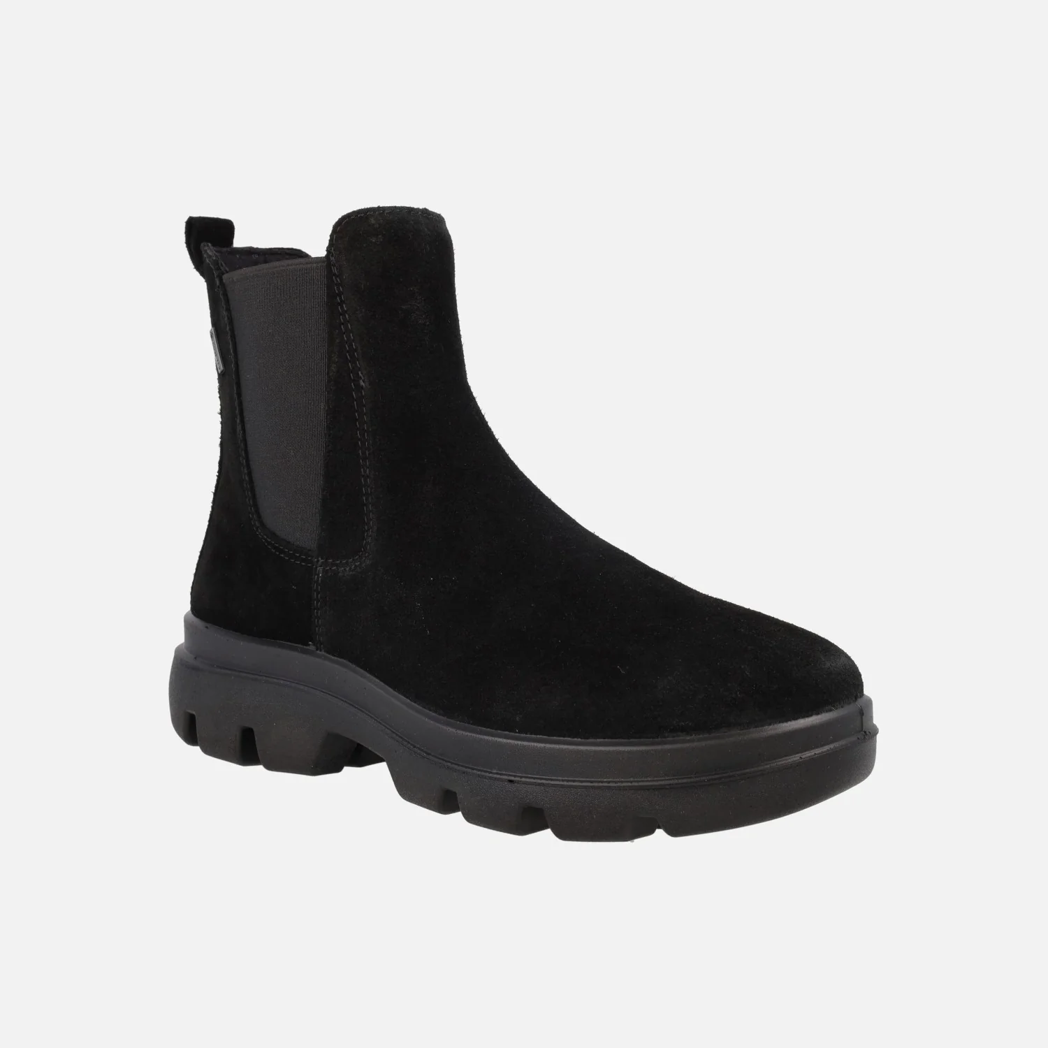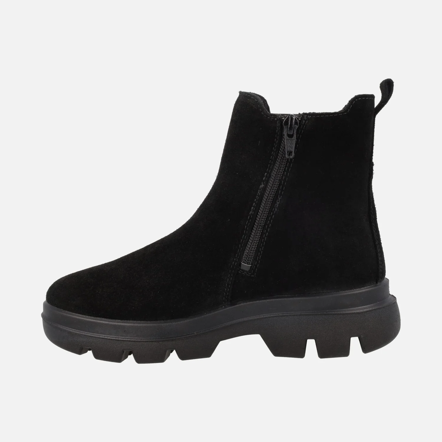 Botines para mujer estilo chelsea de la marca Legero, modelo 2-000329 Schwarz. Botines elaborados en serraje color negro, con elástico en el lado exterior y cierre de cremallera en el lado interior. Forro textil, con plantillas extraíbles. Membrana interior de Gore tex, impermeable. Piso sintético con 4,5 cm de altura trasera (3,5 cm parte delantera). Caña de 13 cm de altura.