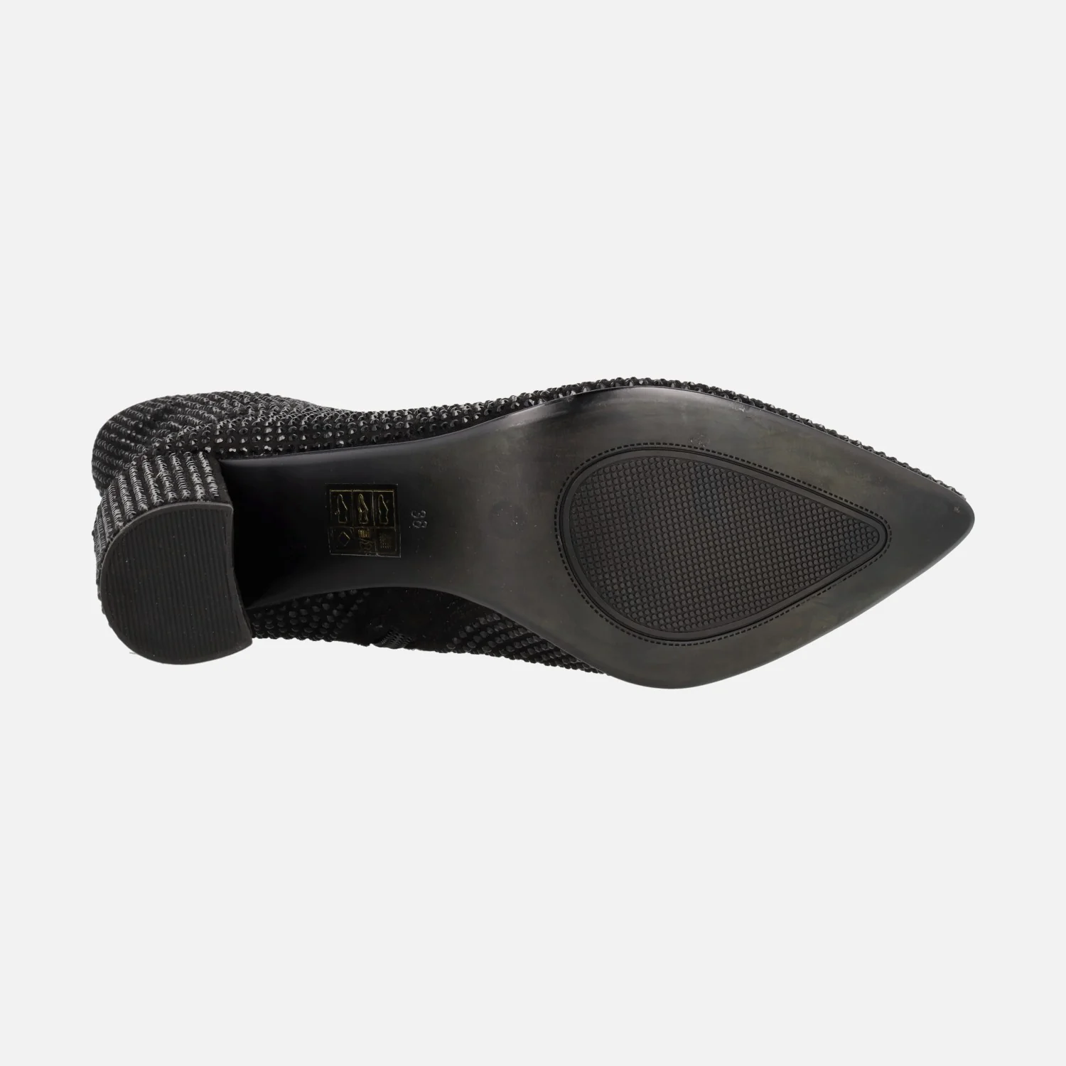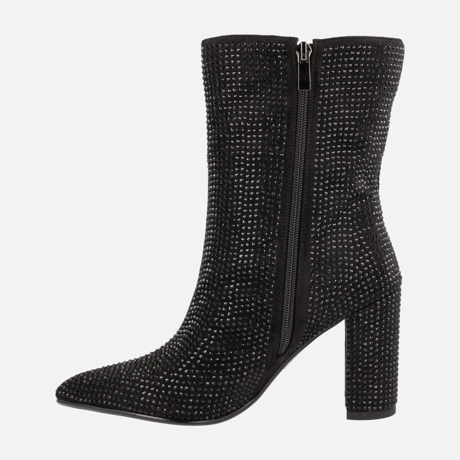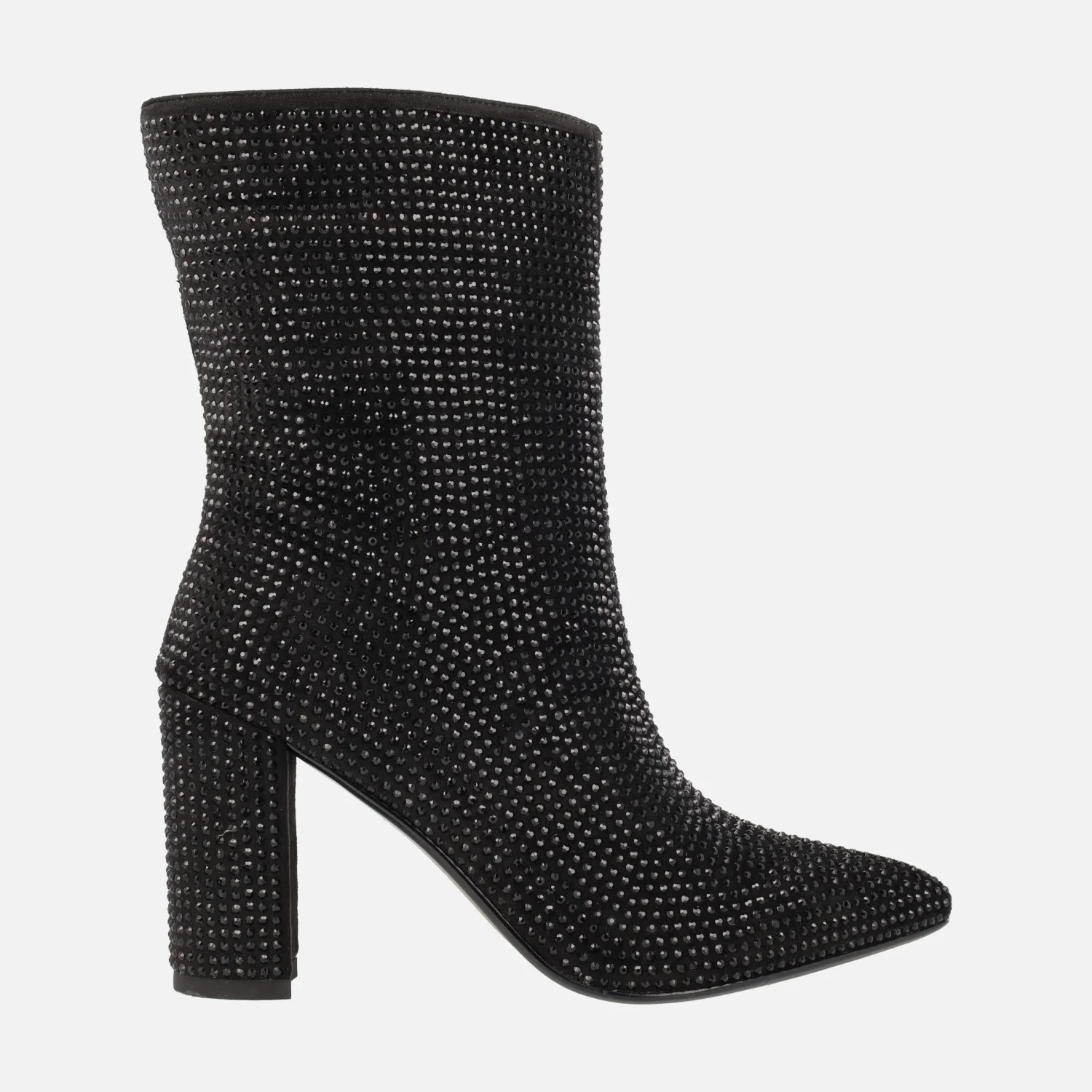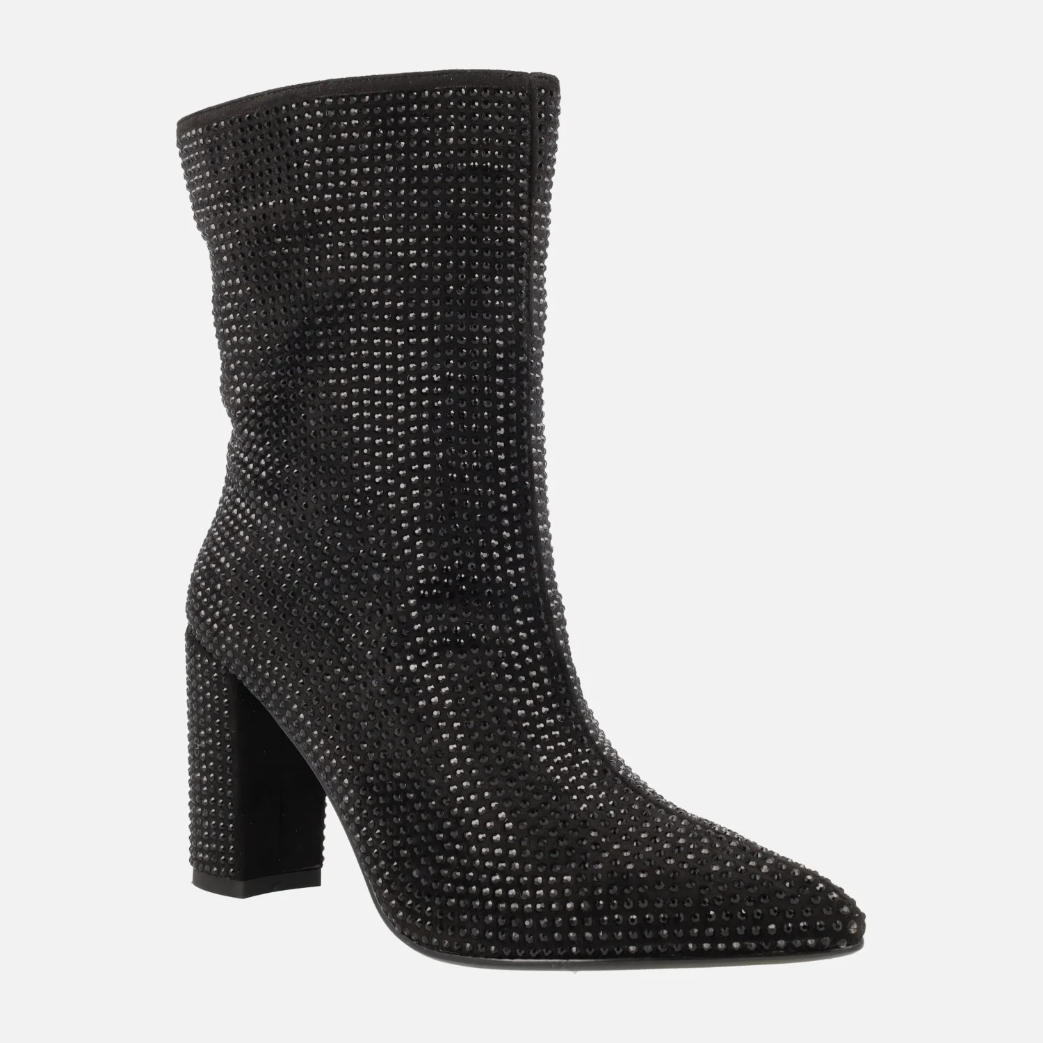 Botines negros para mujer de la marca Bives modelo Handre VB2317 Negro. Botines de tacón alto, elaborados en tejido negro cubierto de strass. Cierre de cremallera en el lado interior. Tacones altos, de 8 cms de altura. Caña de 20 cms. Interior mixto, con forro textil y plantillas de piel.