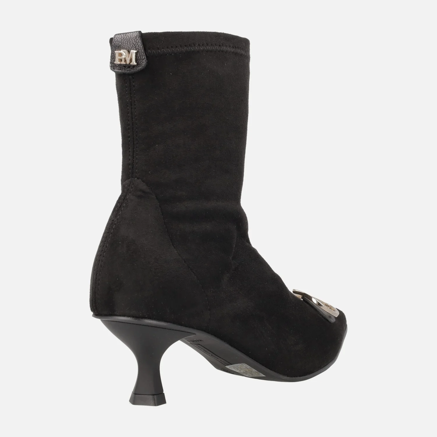 Botines estilo calcetín para mujer de la marca Pedro Miralles, modelo 28361 en ante strech negro. Botines de horma ligeramente afilada, elaborados en tejido elástico efecto ante, con adorno metálico dorado con «M» de Pedro Miralles en la parte delantera. Interior en tejido y sintéticos. Tratamiento water repellent para una ligera resistencia a la lluvia. Suela sintética, con tacones de 5 cms de altura. Caña de 18 cms de altura.