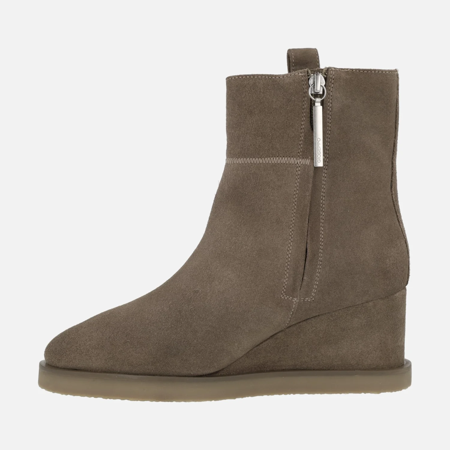 Botines para mujer Gioseppo Doland 70789-P Taupe. Botines de cuña, elaborados en piel serraje color taupe, con cremallera en el lateral interior. Detalle de tirador en la parte de fuera. Cuña media, forrada de serraje, con una altura aproximada de 6,5 cms. Caña de 15 cms. Piso de goma.