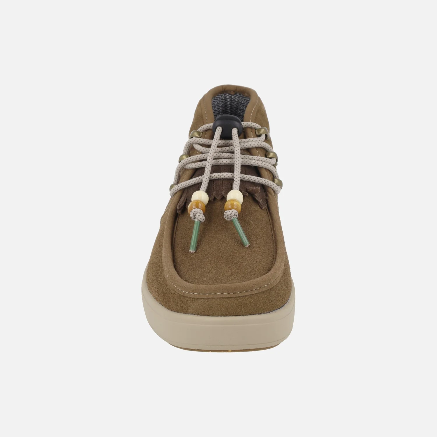Nuevas botas para mujer Natural world Rainer 8461-734 en serraje camel. Botas elaboradas en serraje hidrofugado con cierre de cordones elásticos ajustables con detalle de cuentas decorativas. Copete de flecos. Interior textil, con plantillas extraíbles. Tecnología NATURAL DRY para una ligera resistencia a la lluvia, además de ser un buen aislante térmico. Piso de EVA y goma, de 3 cm de altura trasera (2,5 cm parte delantera). Caña de 10 cm.