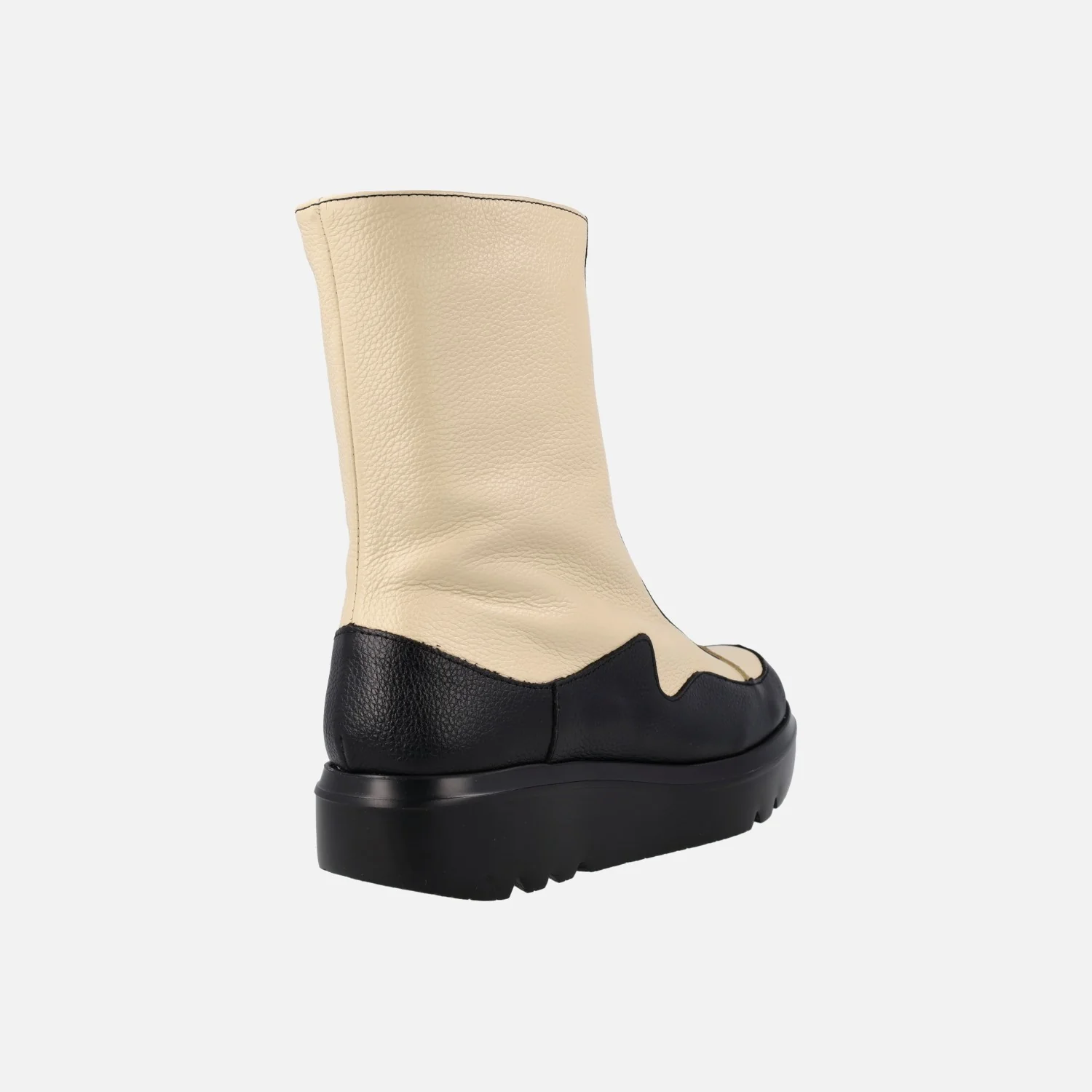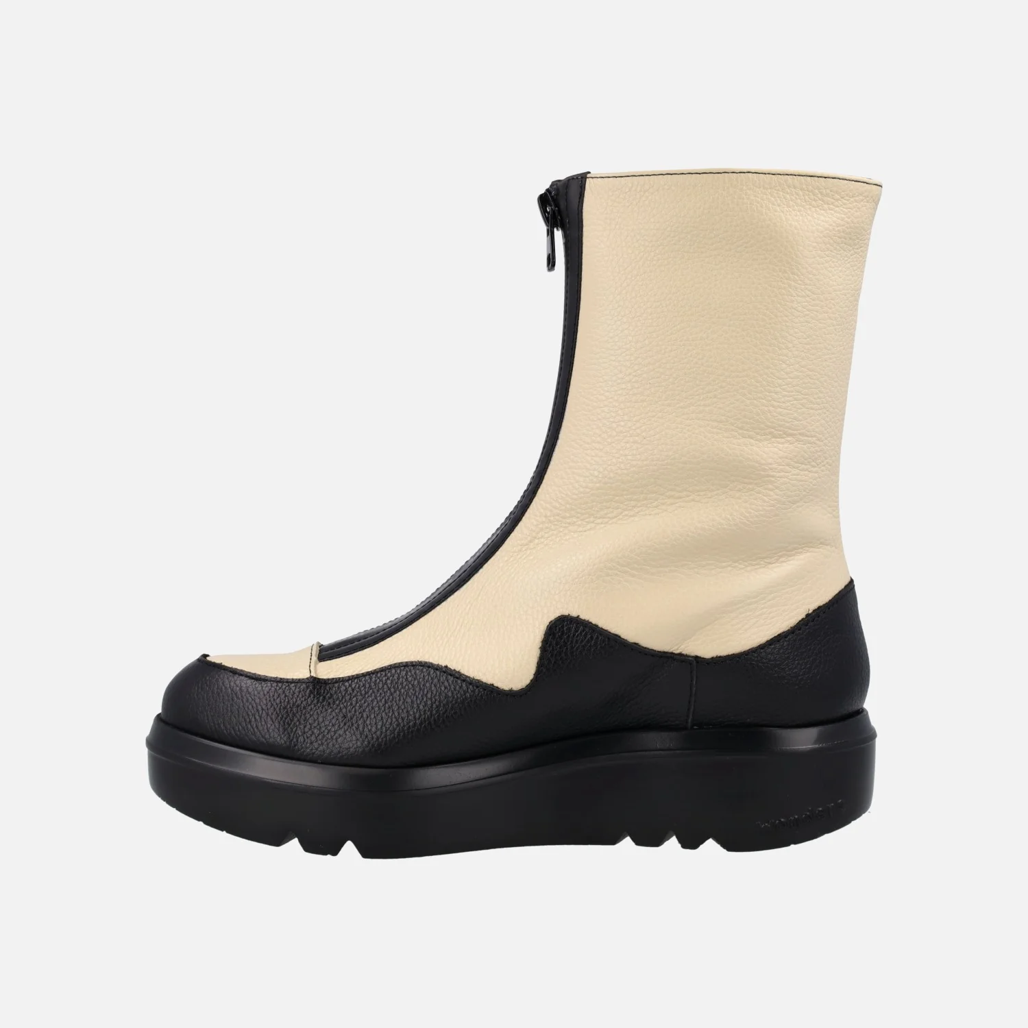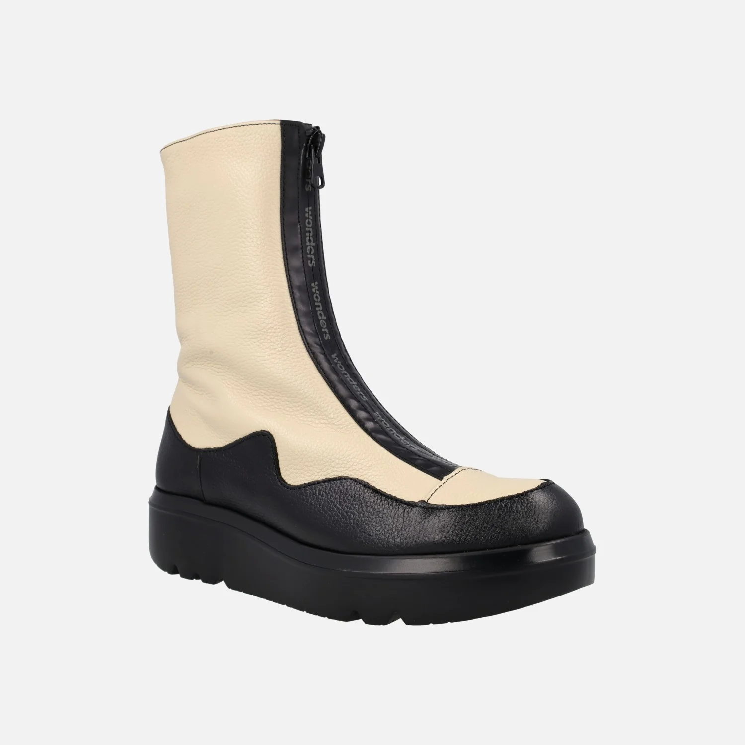 Botines para mujer de la marca Wonders modelo A-2822 negro/cream. Botines con detalle de cremallera central, elaborados en combinado de piel negra y beige. Interior mixto piel/textil. Plantillas extraíbles Memory gel. Caña de 18 cms de altura. Piso de goma EVA Extralight, con 4 cms de altura en la parte trasera. Made in Spain.