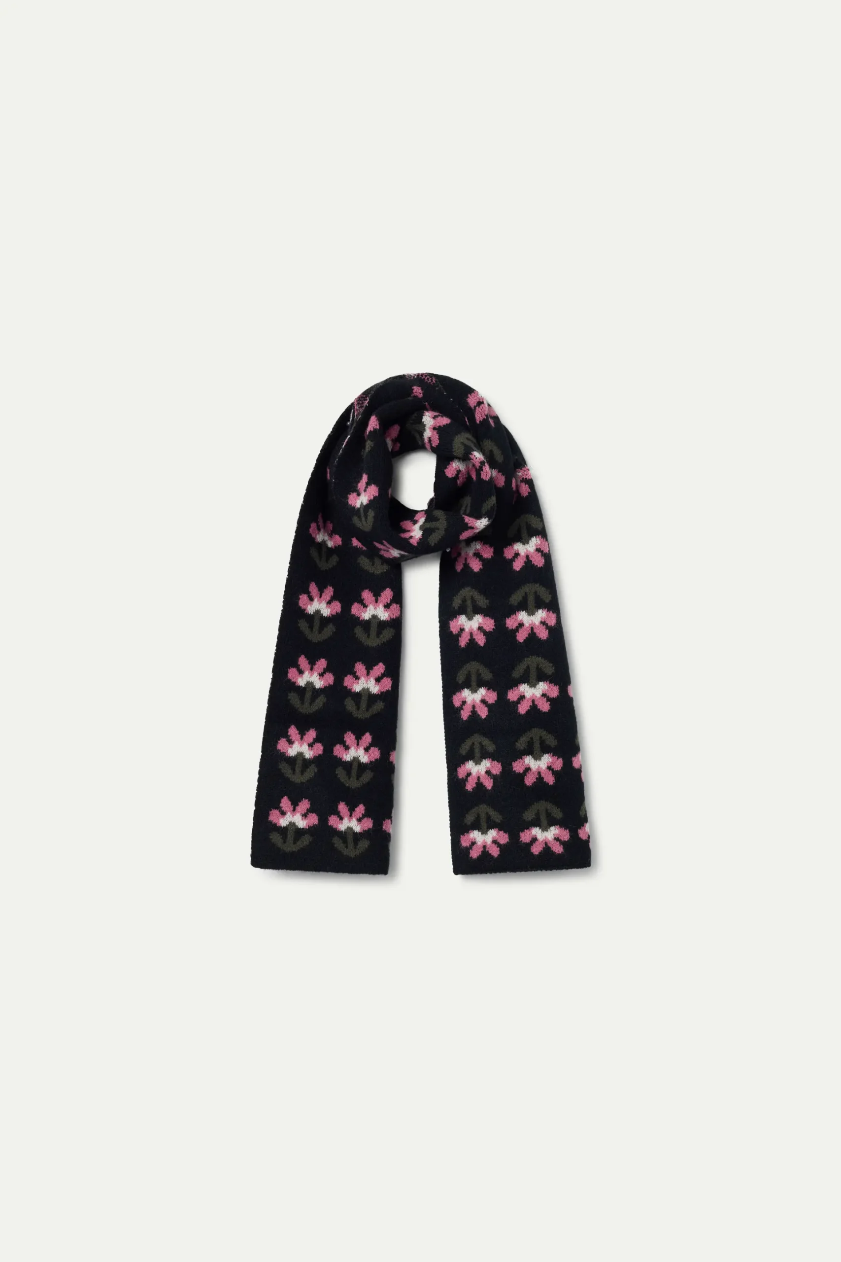 Bufanda de niña con estampado floral Baboushka en tonos rosa sobre fondo negro.