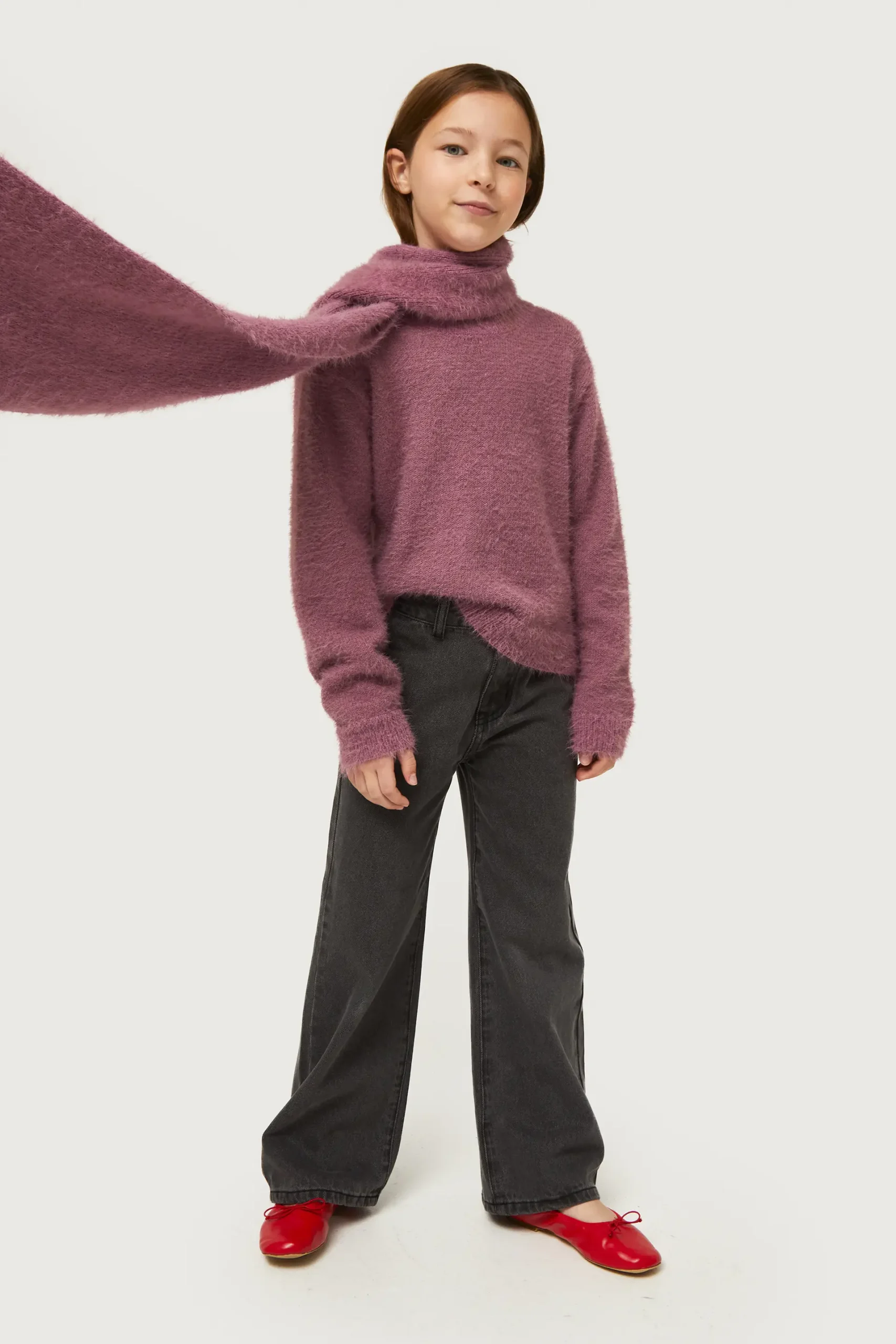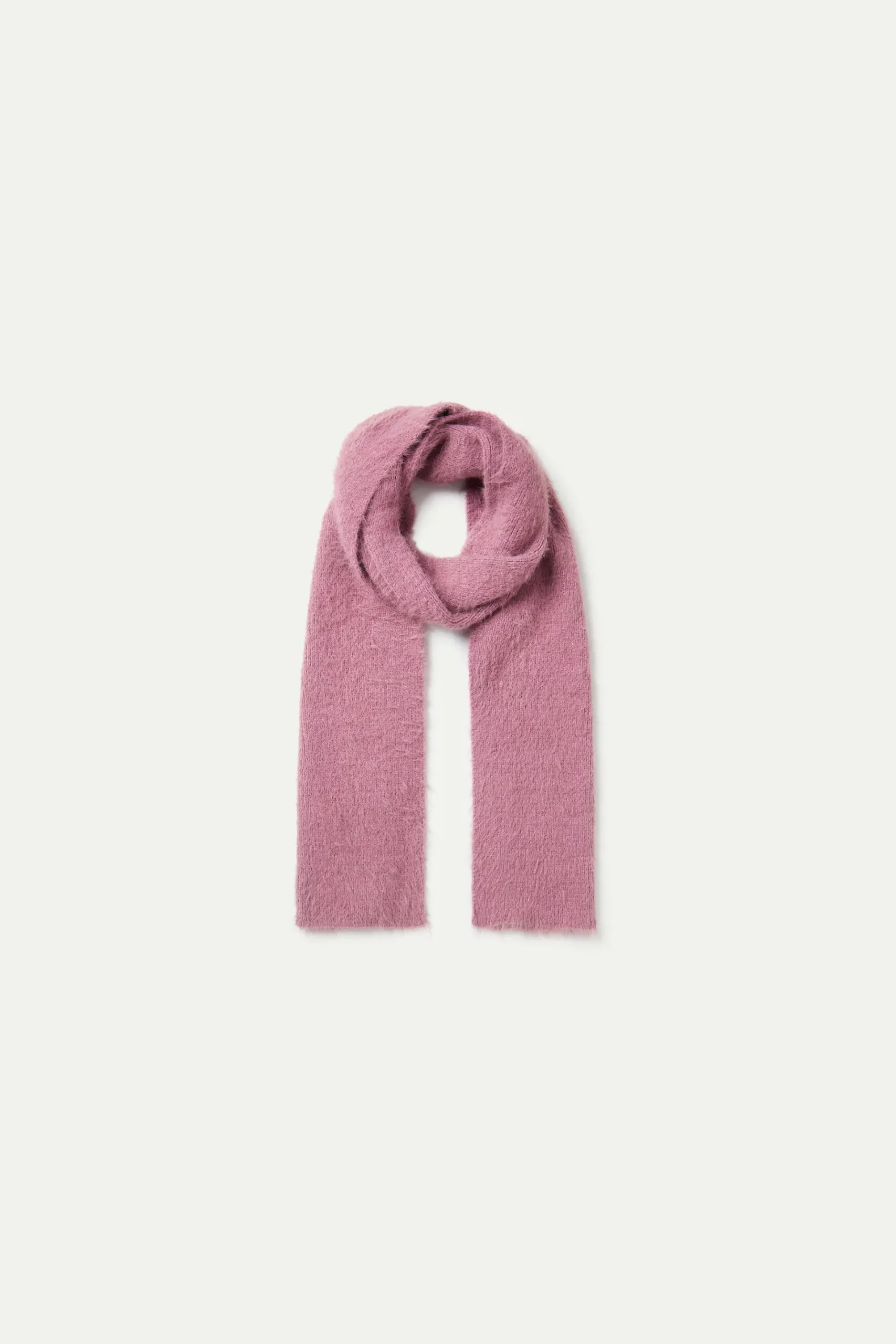 Bufanda de niña en punto efecto pelo de color rosa. La modelo mide 140 cm y lleva la talla 8.