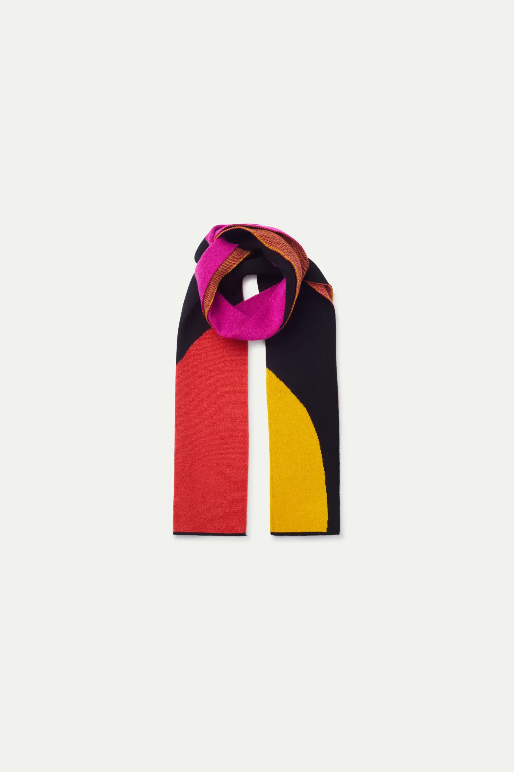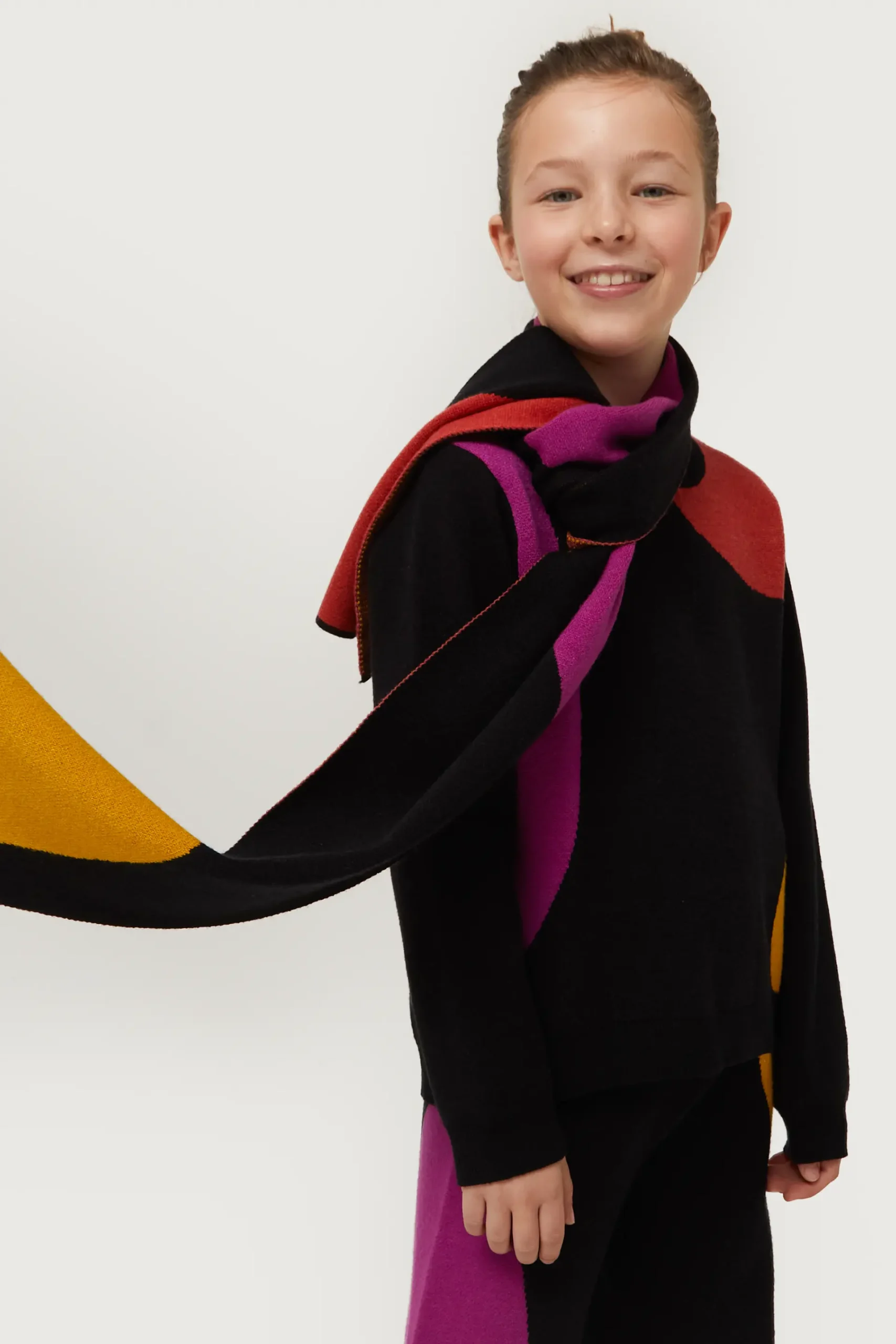 Bufanda de niña en punto jacquard de color negro con estampado de círculos multicolor. La modelo mide 130 cm y lleva la talla 8.