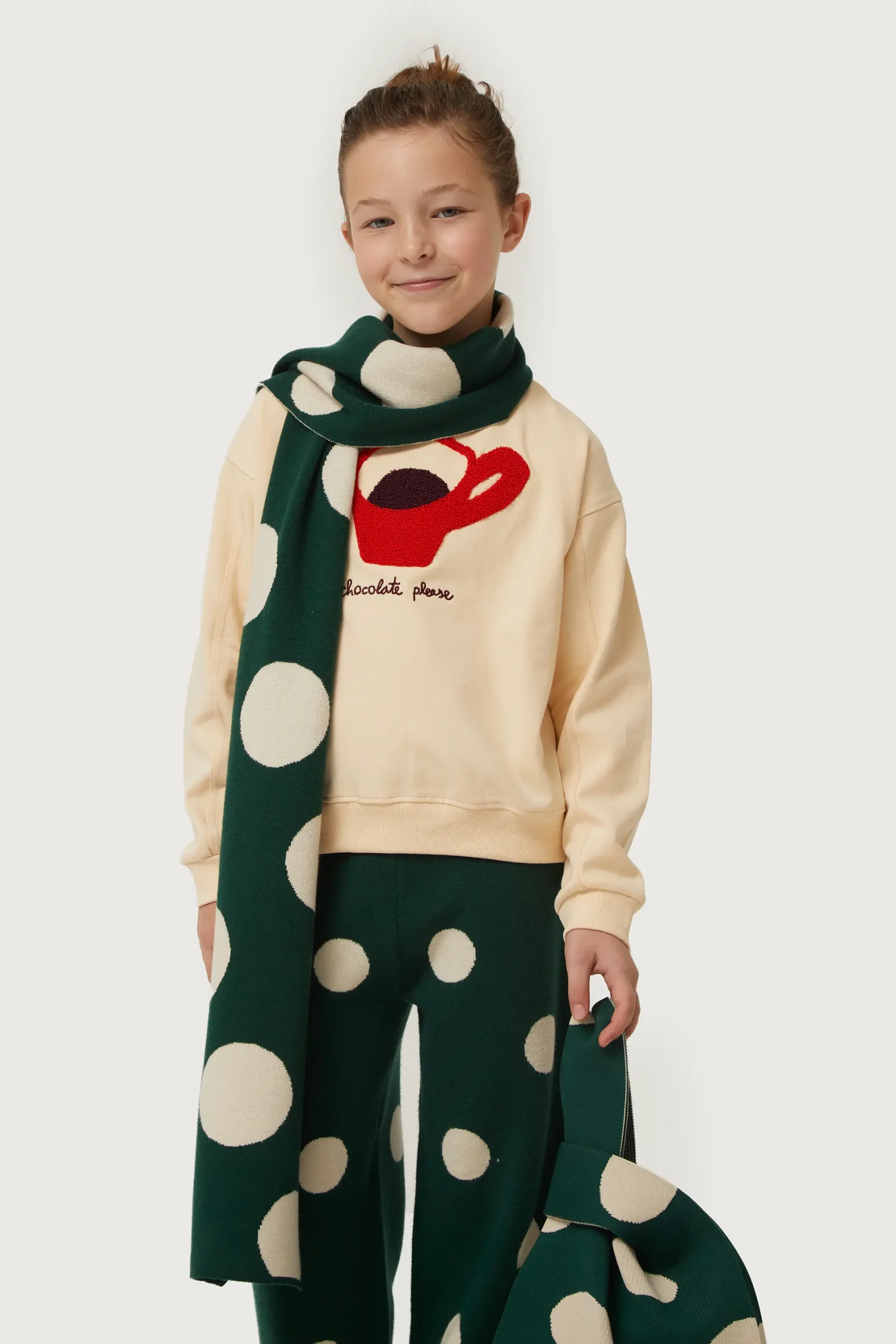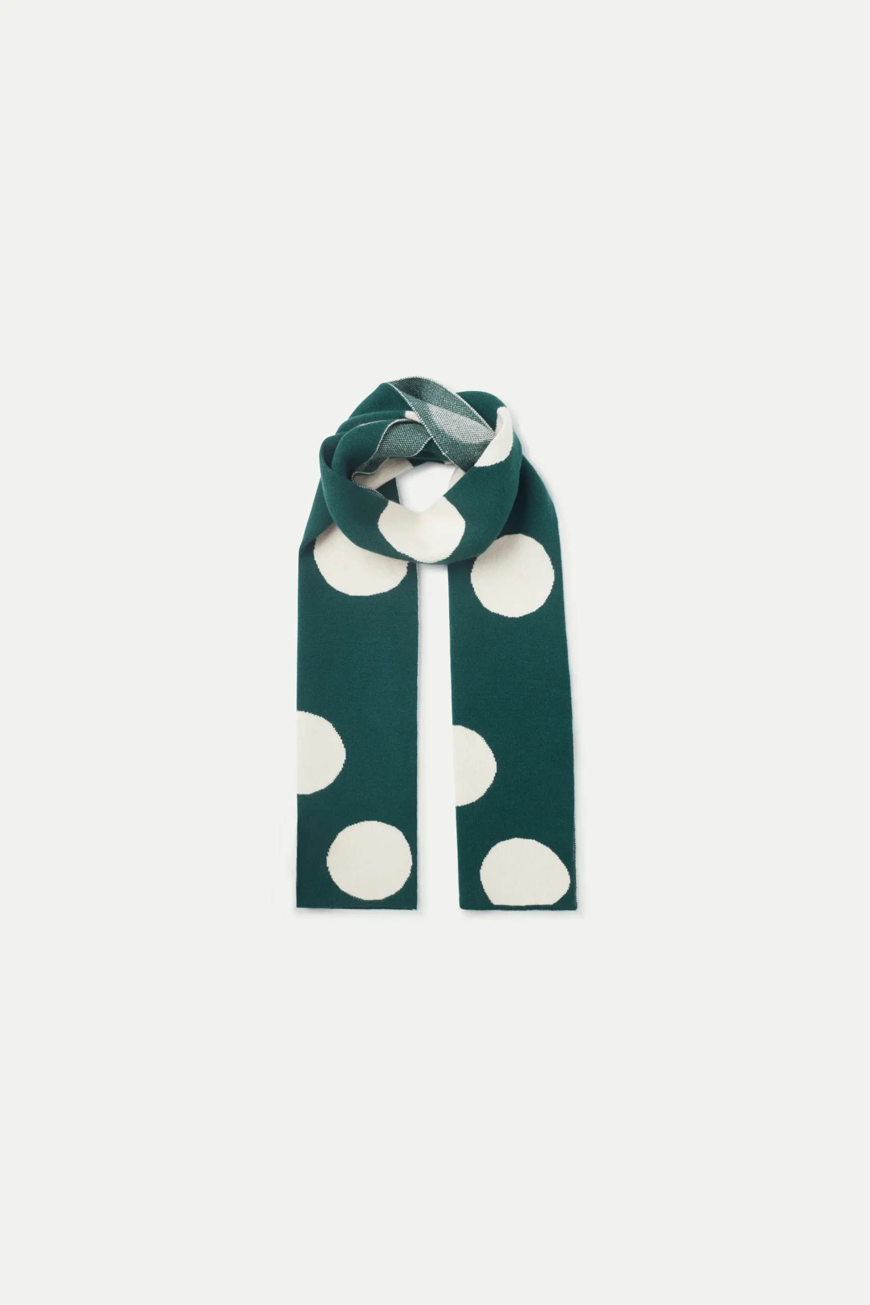 Bufanda de niña en punto jacquard de color verde con estampado de lunares blancos. La modelo mide 140 cm y lleva la talla 8.