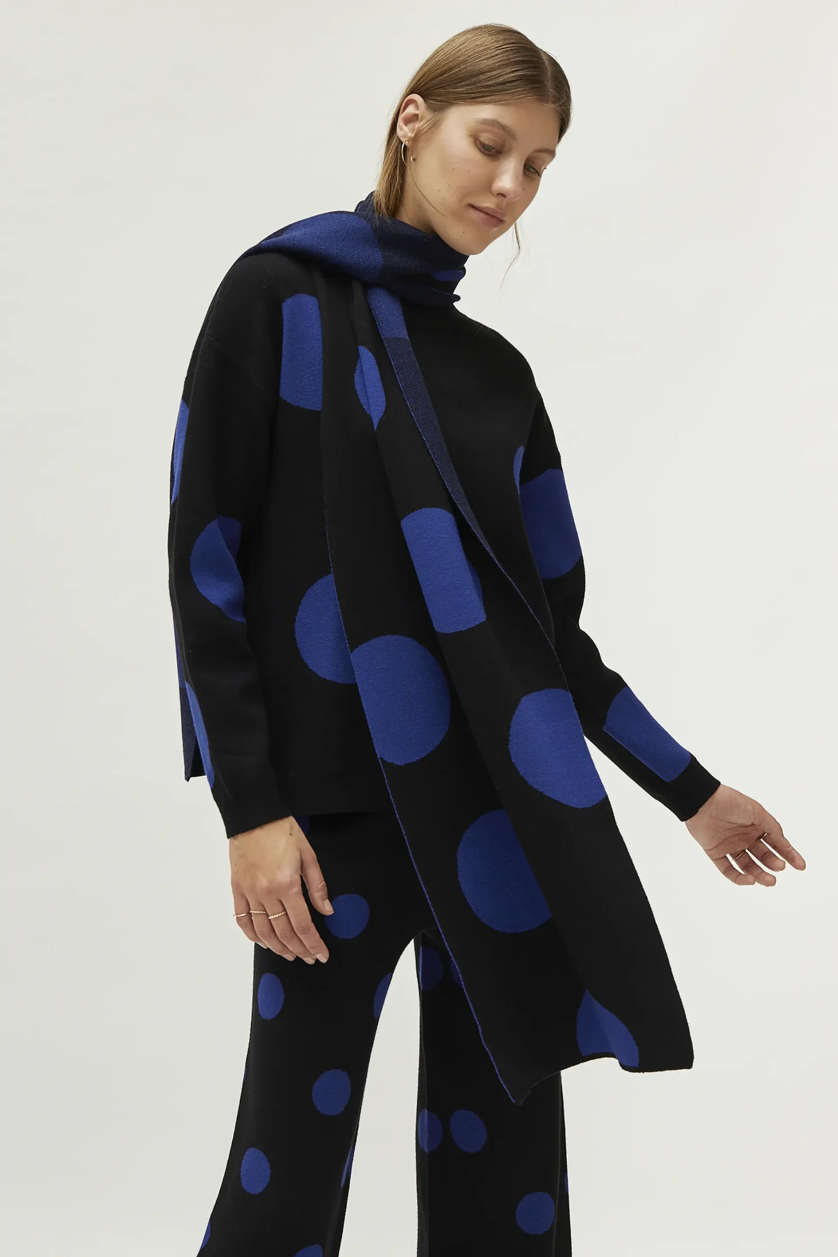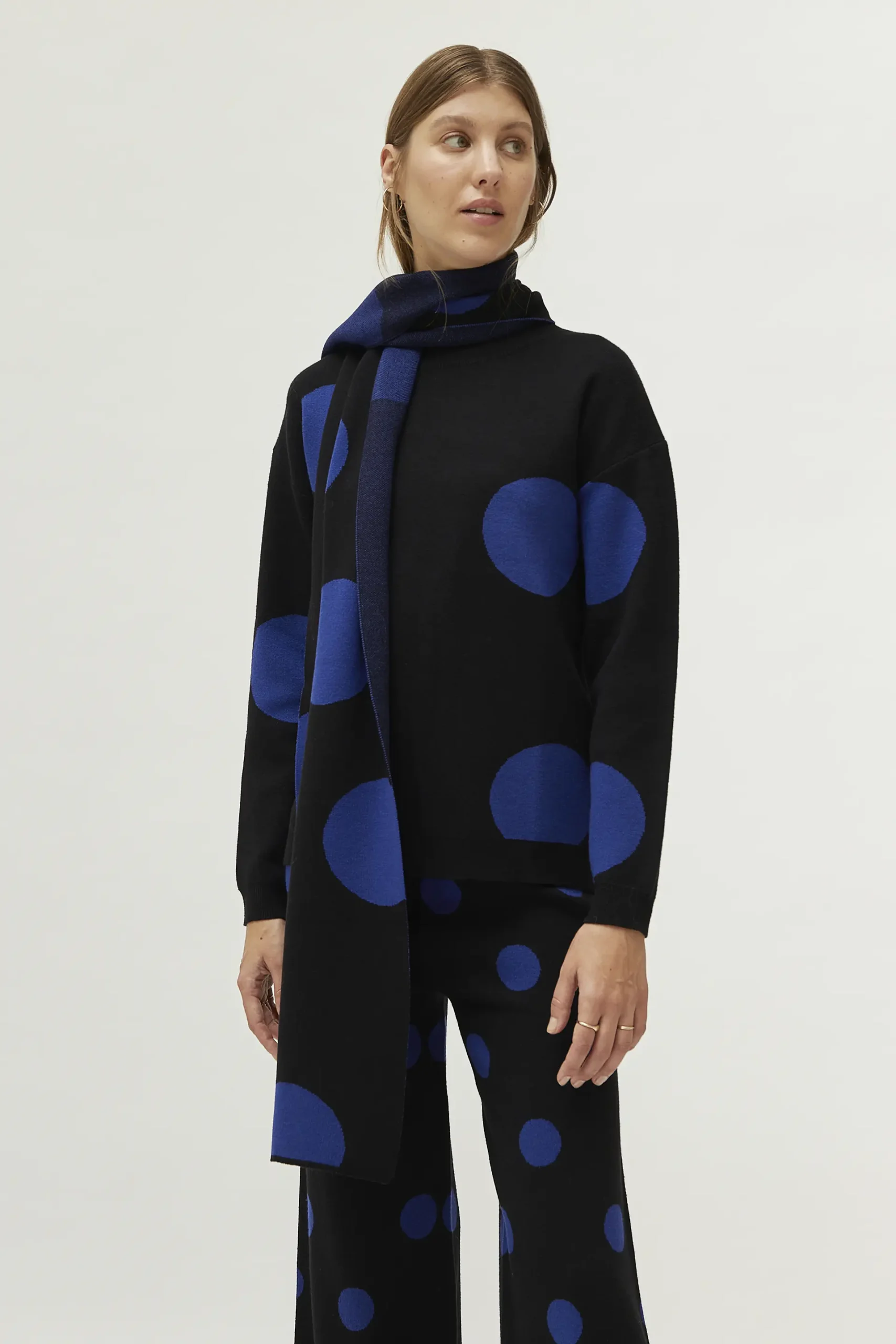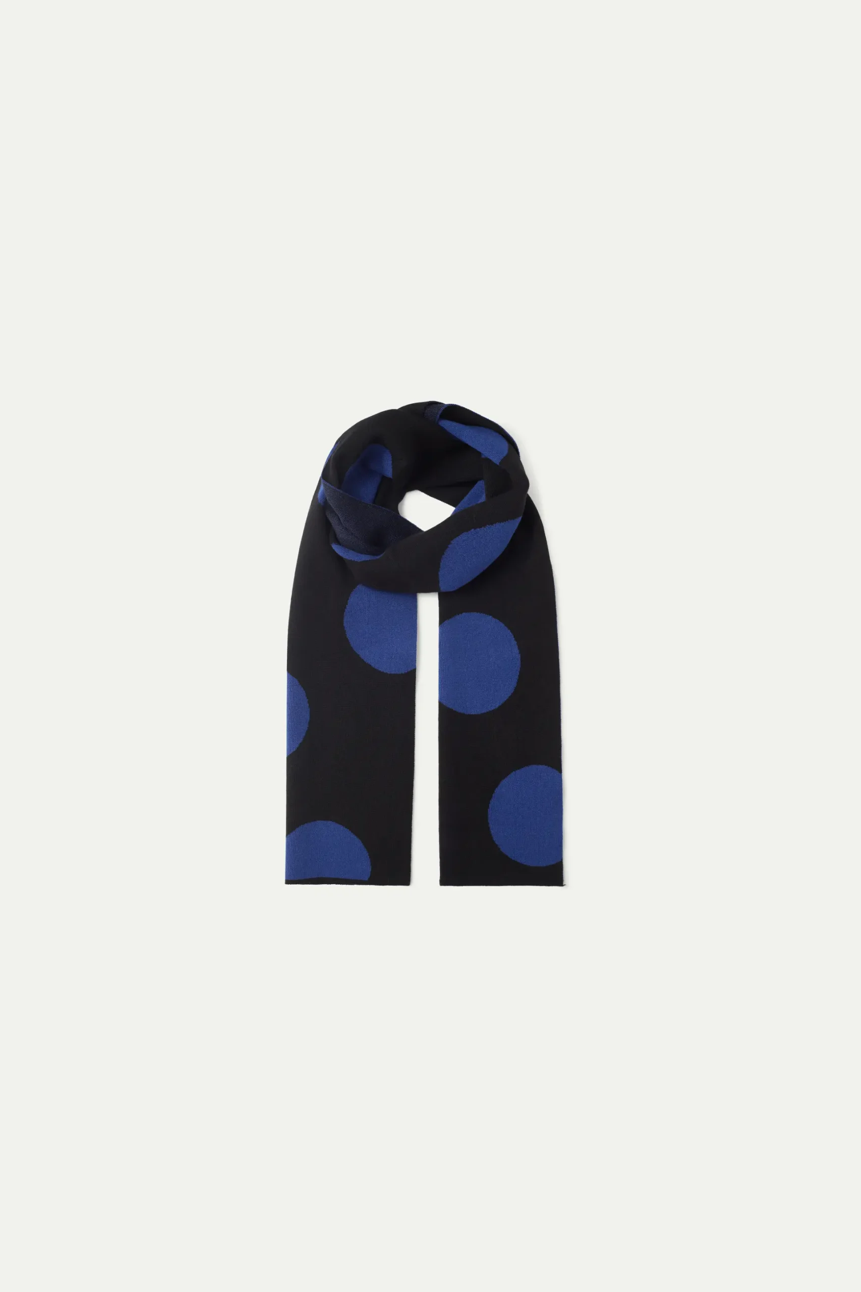Bufanda de punto jacquard de color negro con estampado de lunares azules.