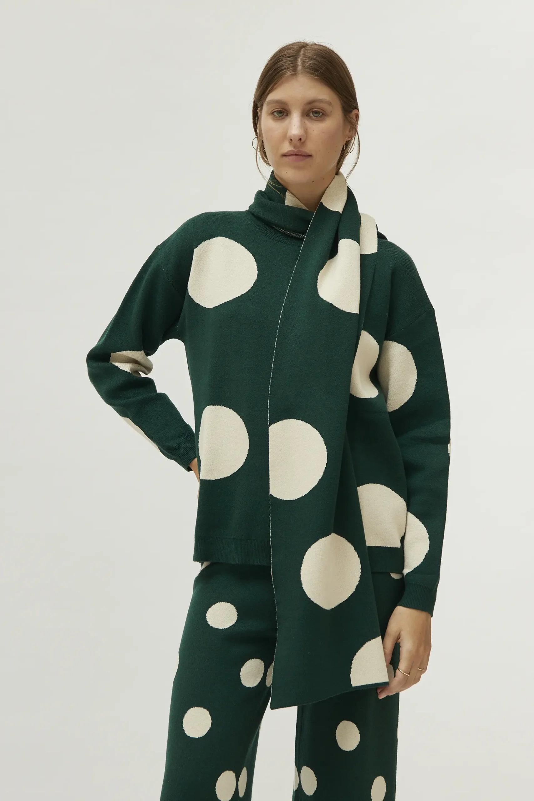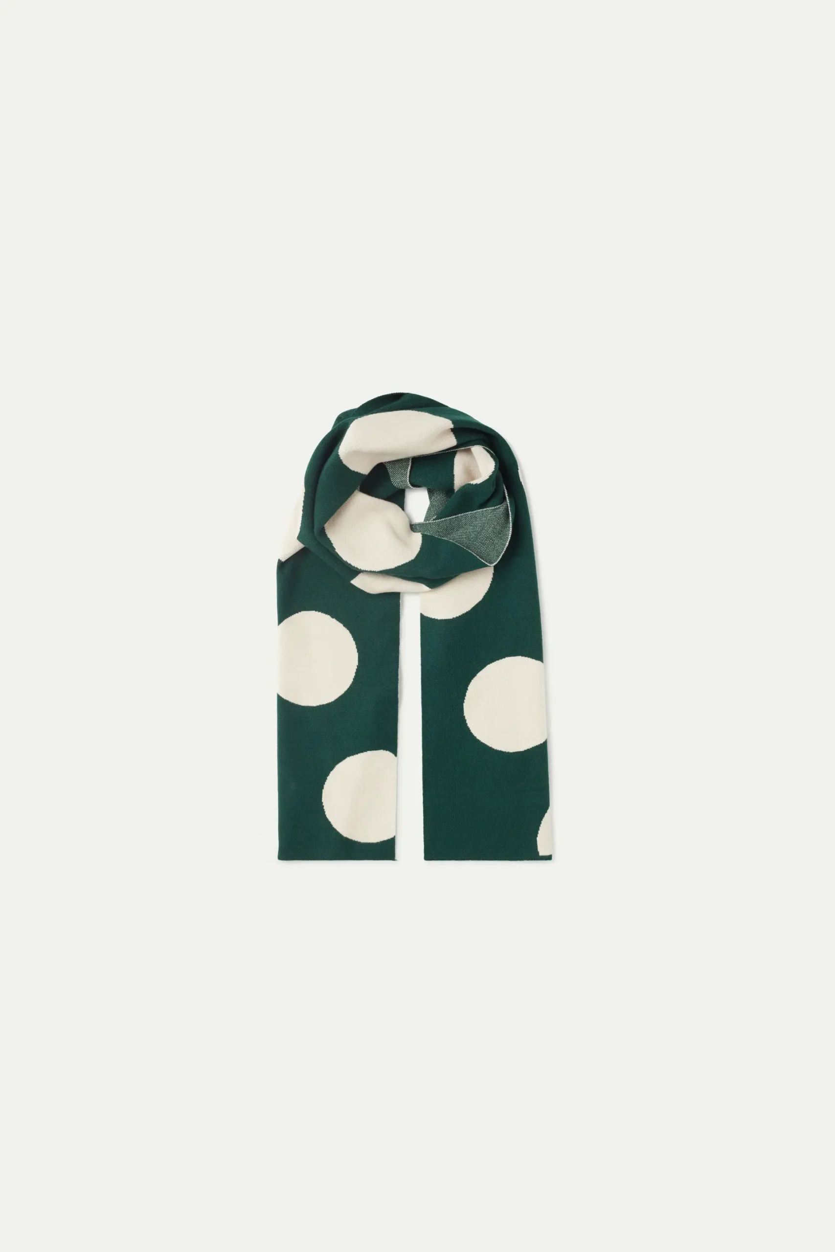 Bufanda de punto jacquard de color verde con estampado de lunares blancos.