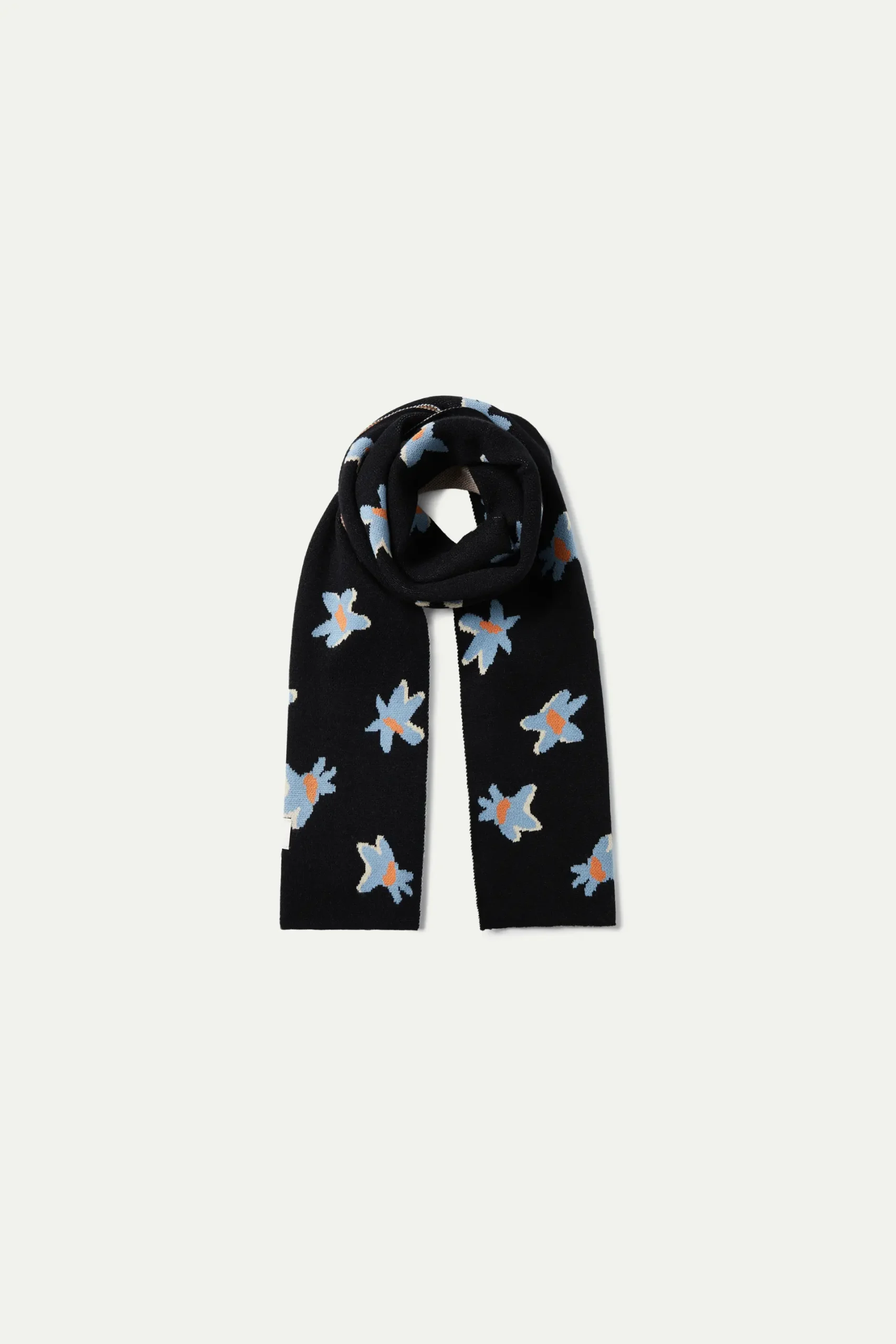 Bufanda larga de punto jacquard de color negro con estampado de flores azules y amarillas.