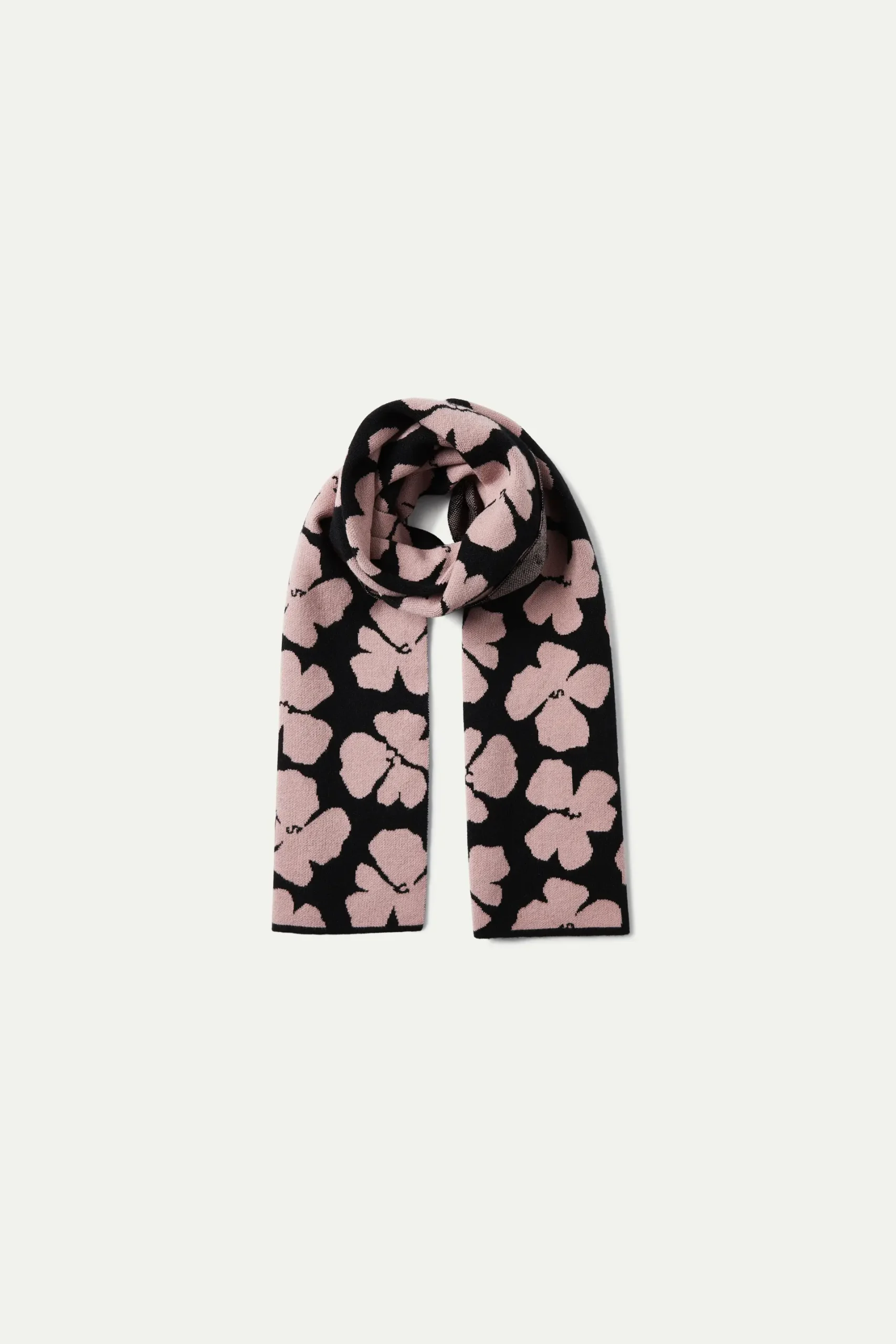 Bufanda larga de punto jacquard de color negro con estampado de flores rosas.