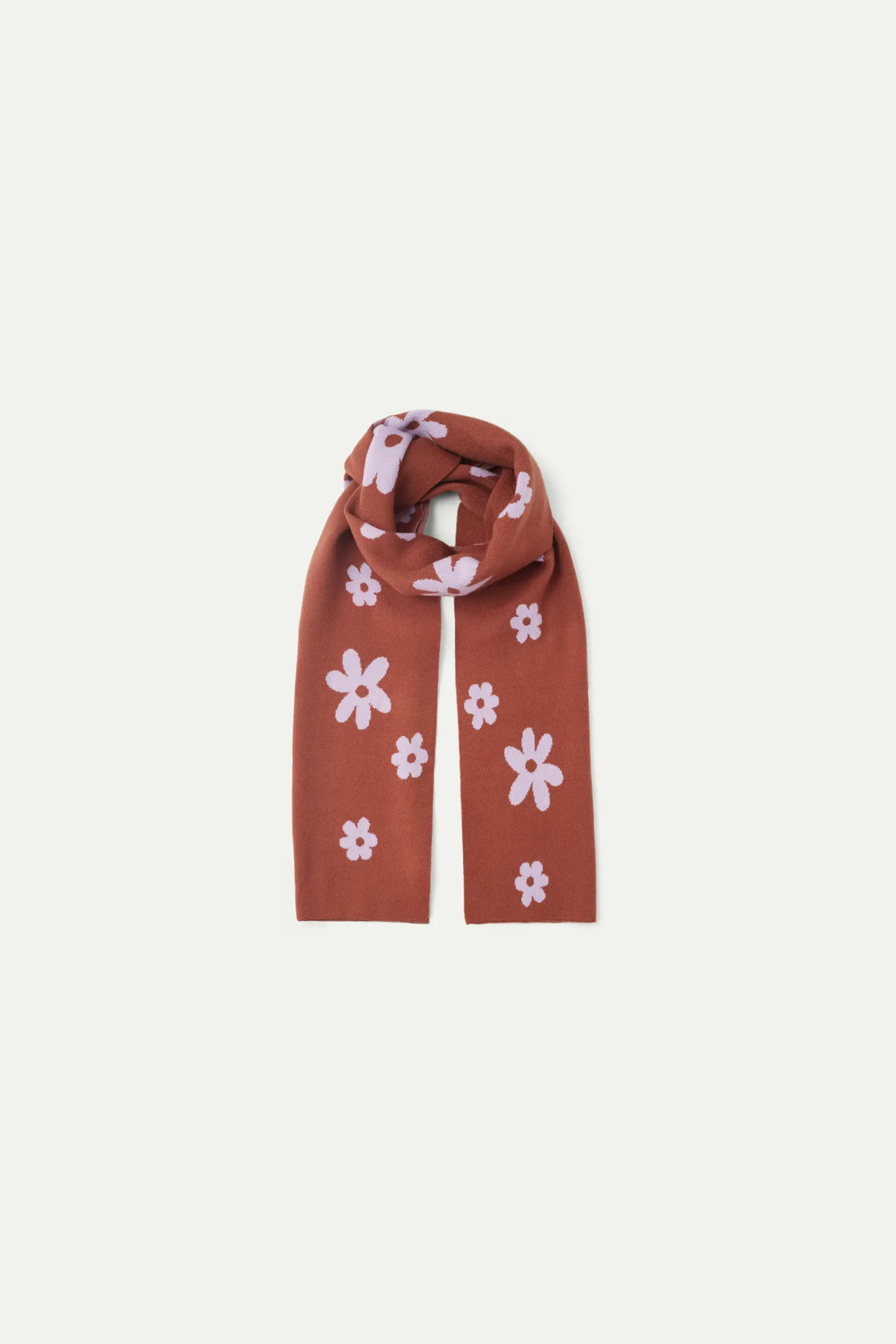 Bufanda larga de punto jacquard de color marrón con estampado de flores lilas.