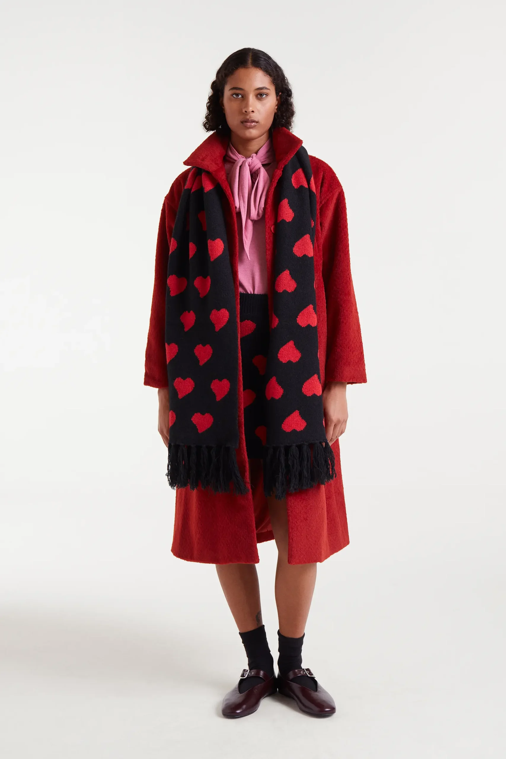 Bufanda larga de punto jacquard con estampado Heart Attack Small. Detalles con flecos. Su medidas son 43cm x 200 cm. Talla única.