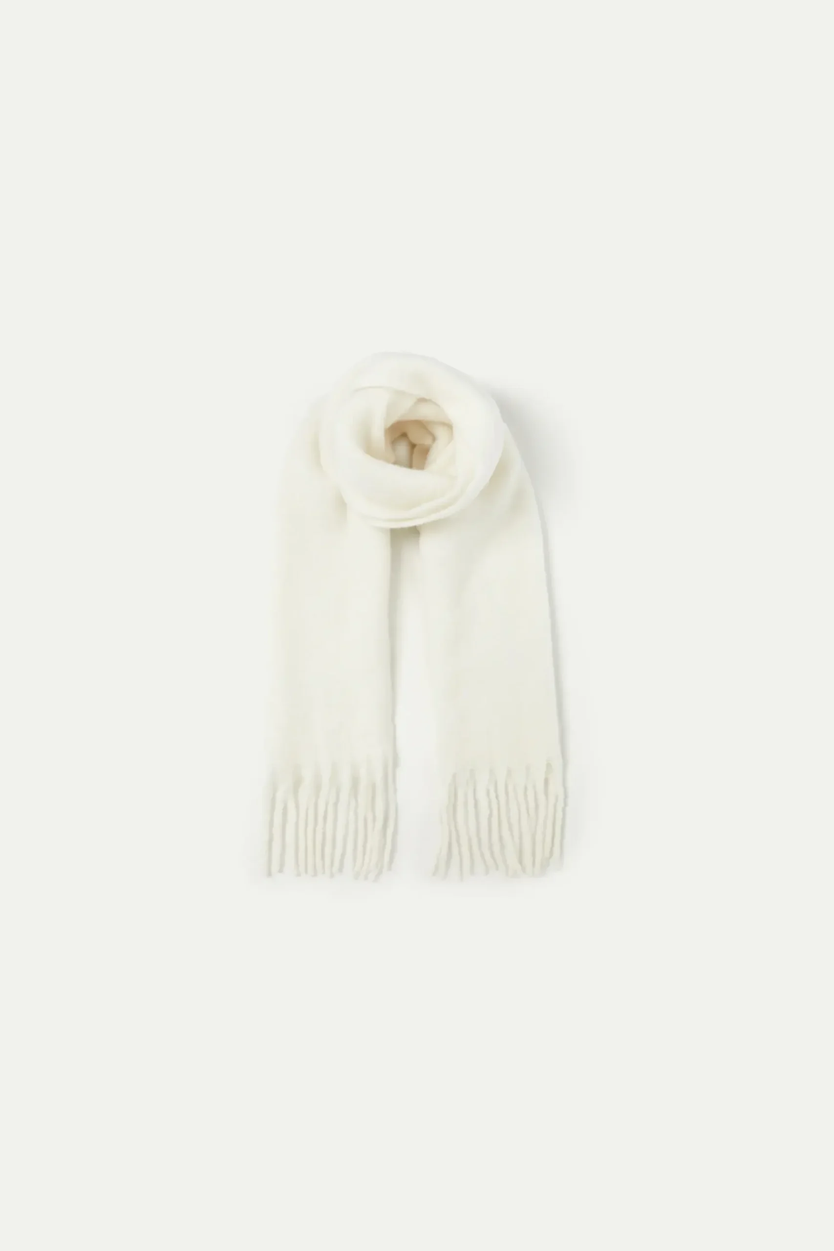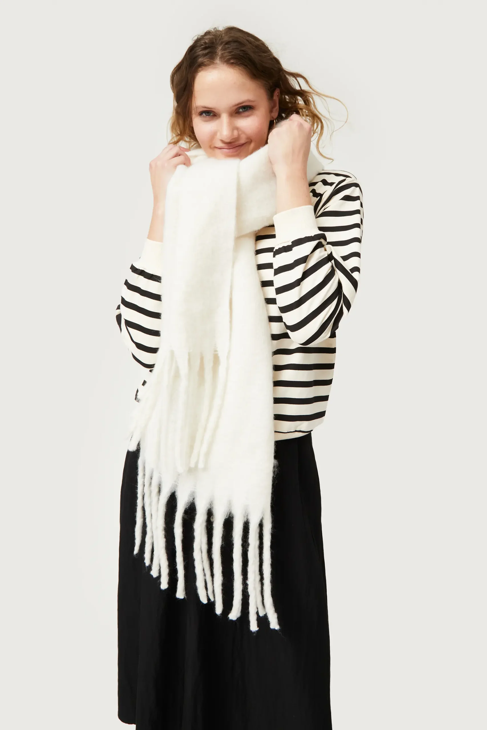 Bufanda larga de punto suave de color blanco roto. Con flecos en los extremos.