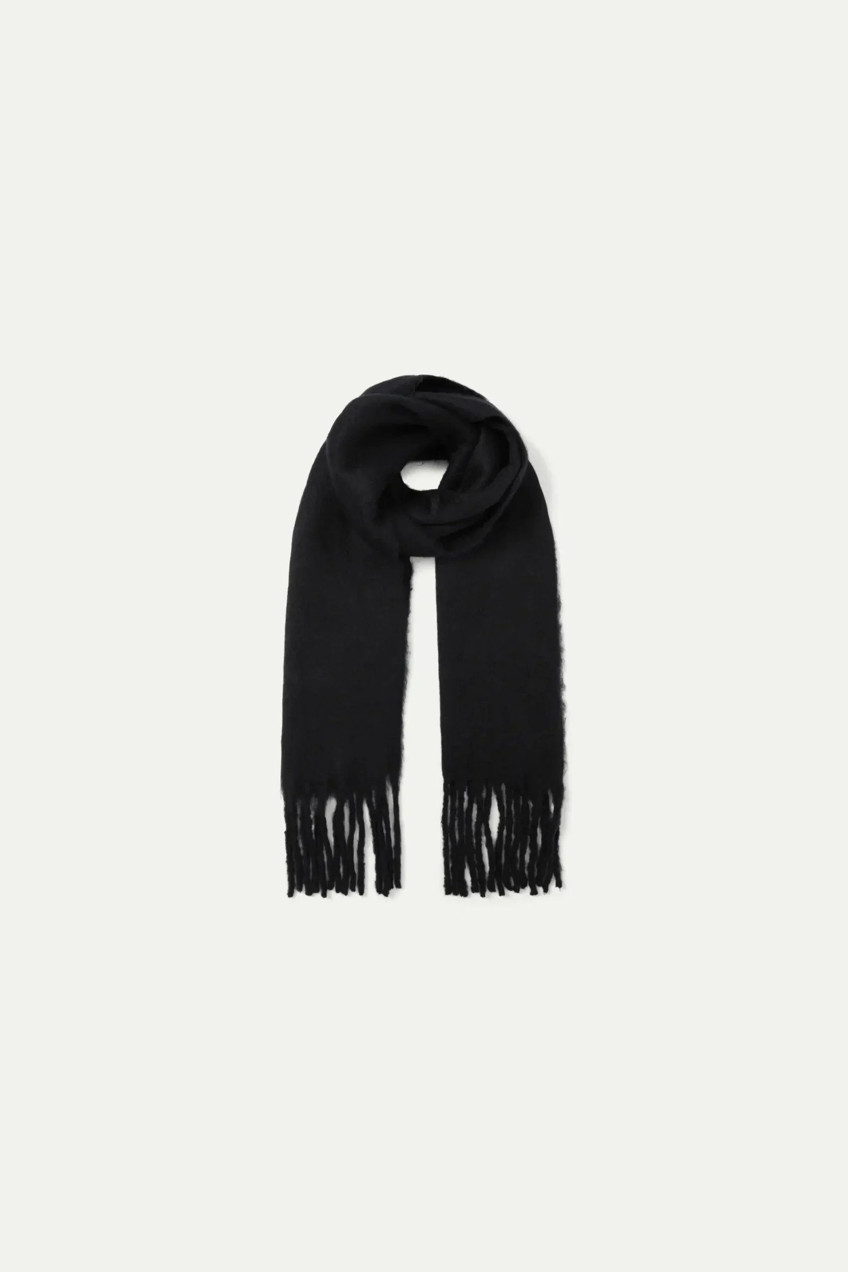 Bufanda larga de punto suave de color negro. Con flecos en los extremos.