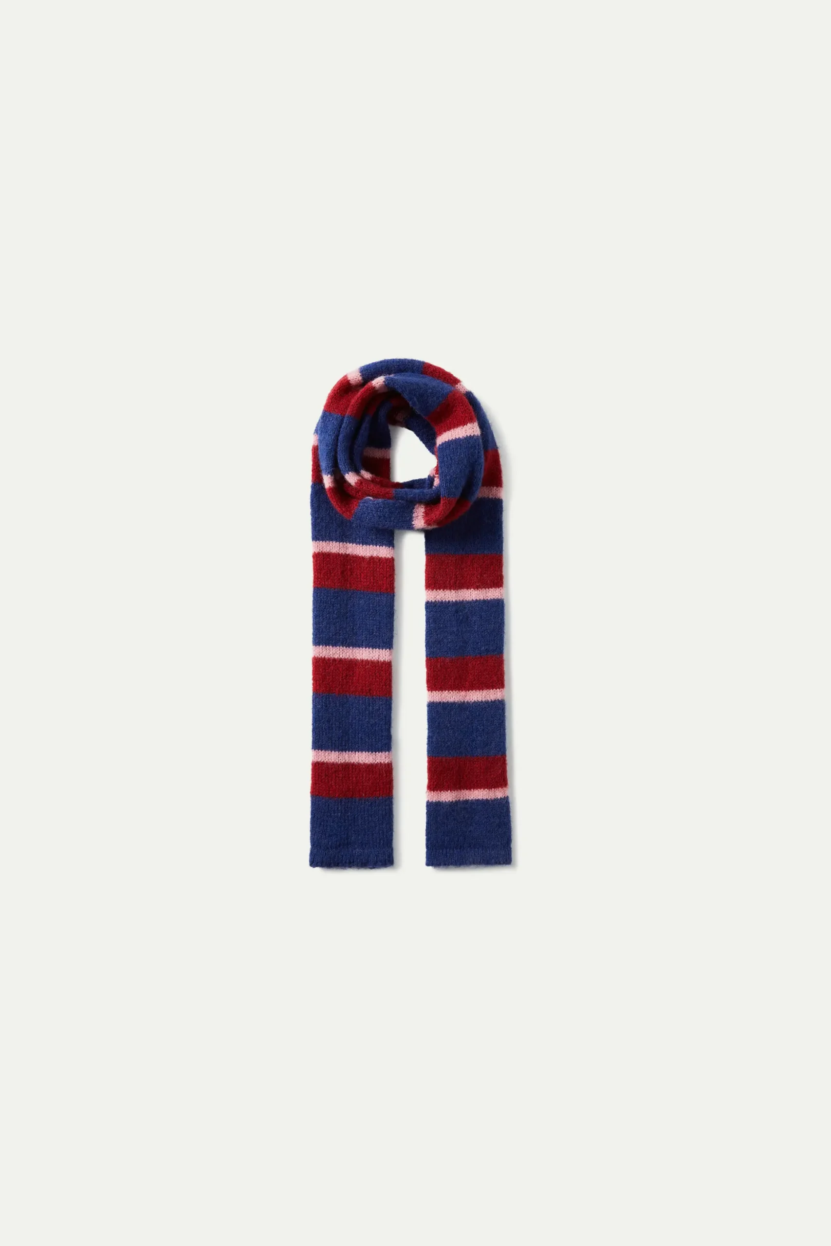 Bufanda larga de punto con estampado de rayas azules, rojas y blancas.