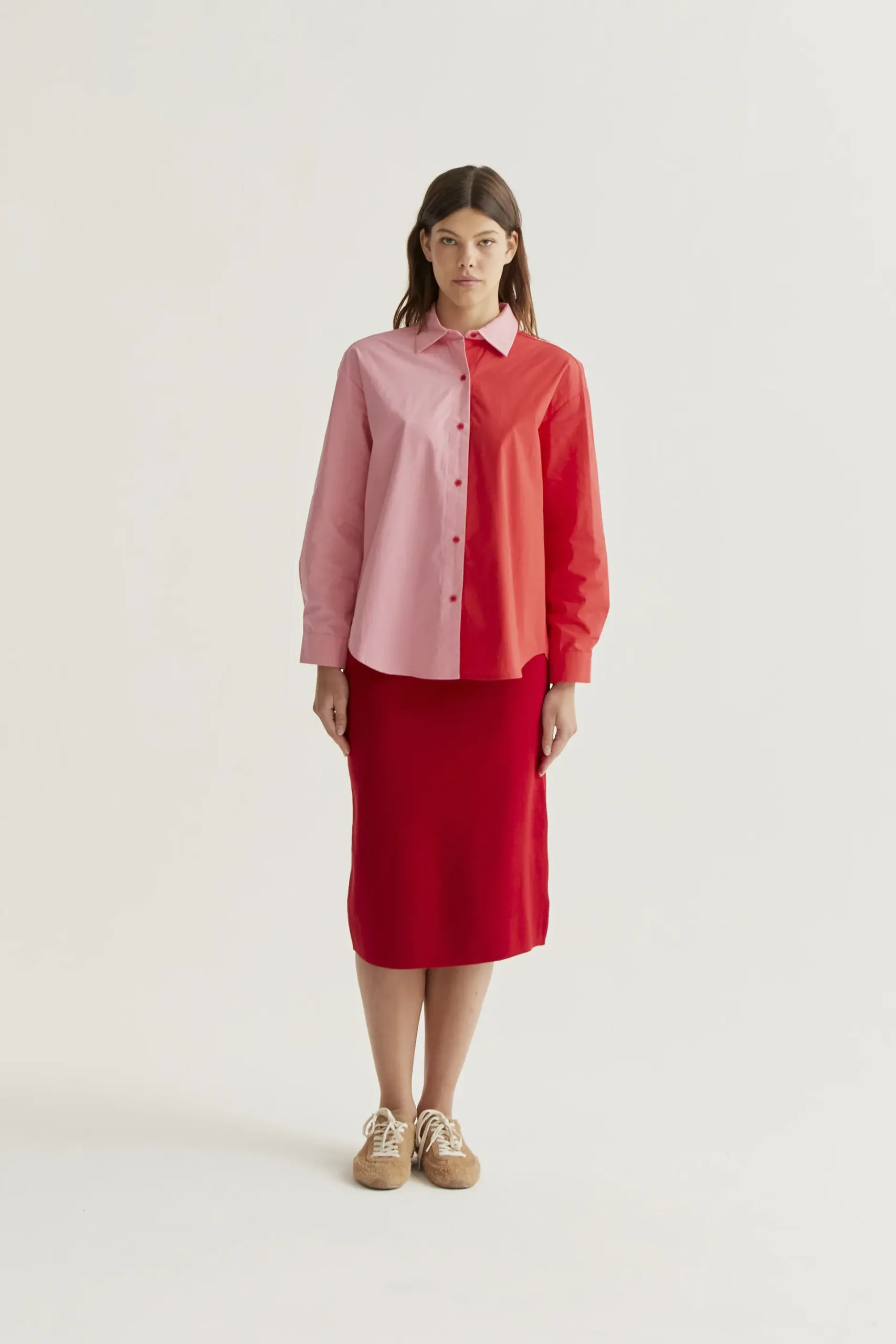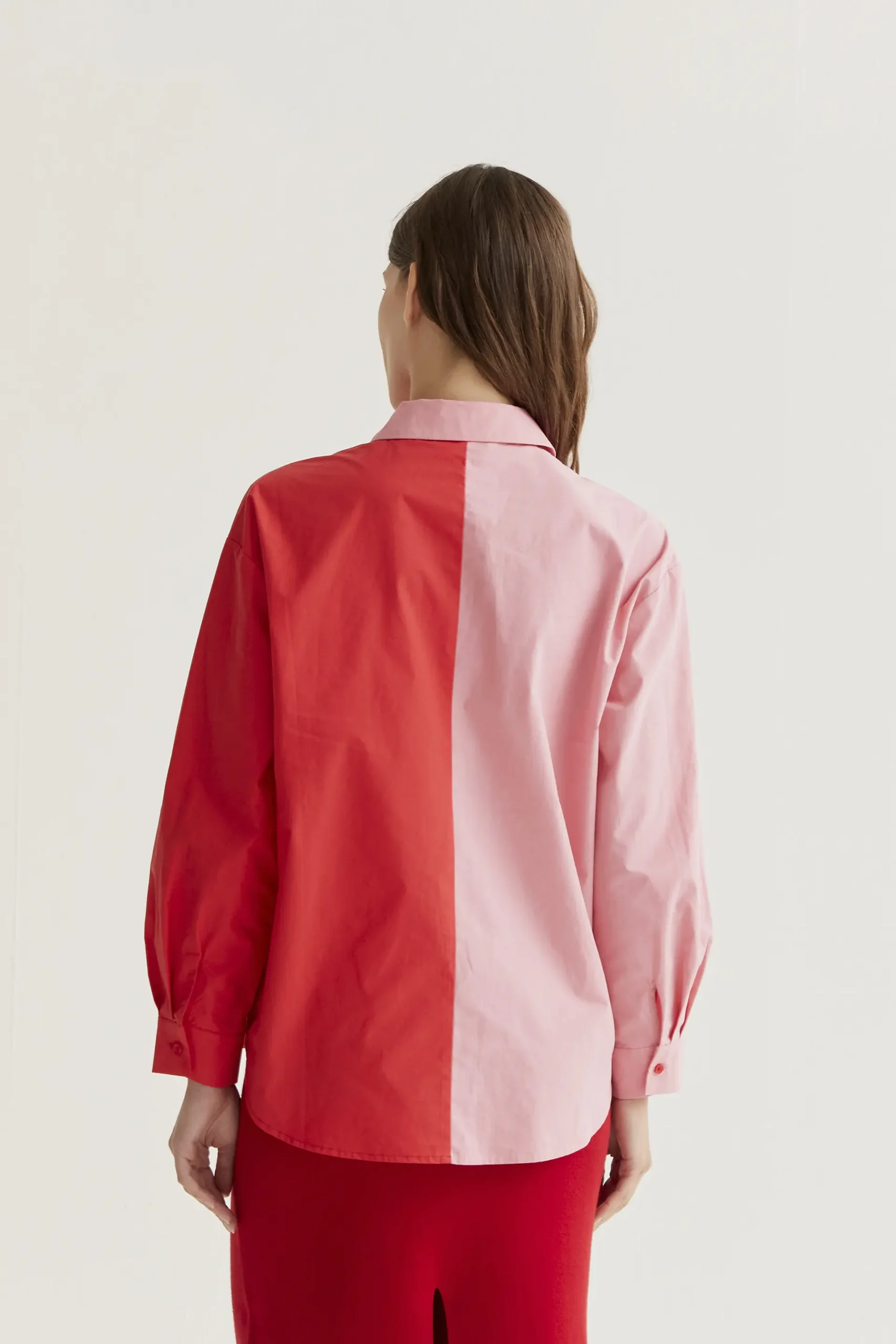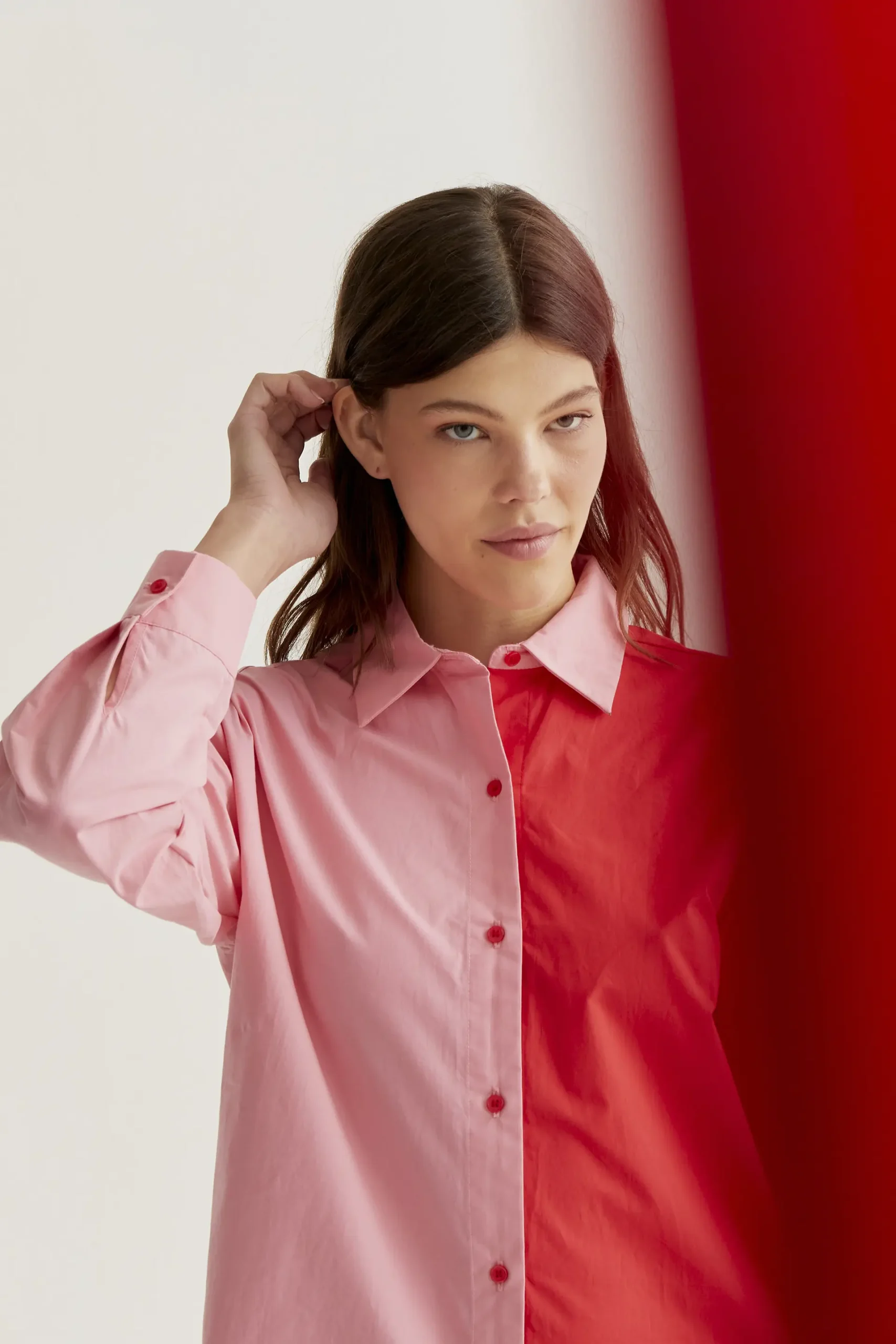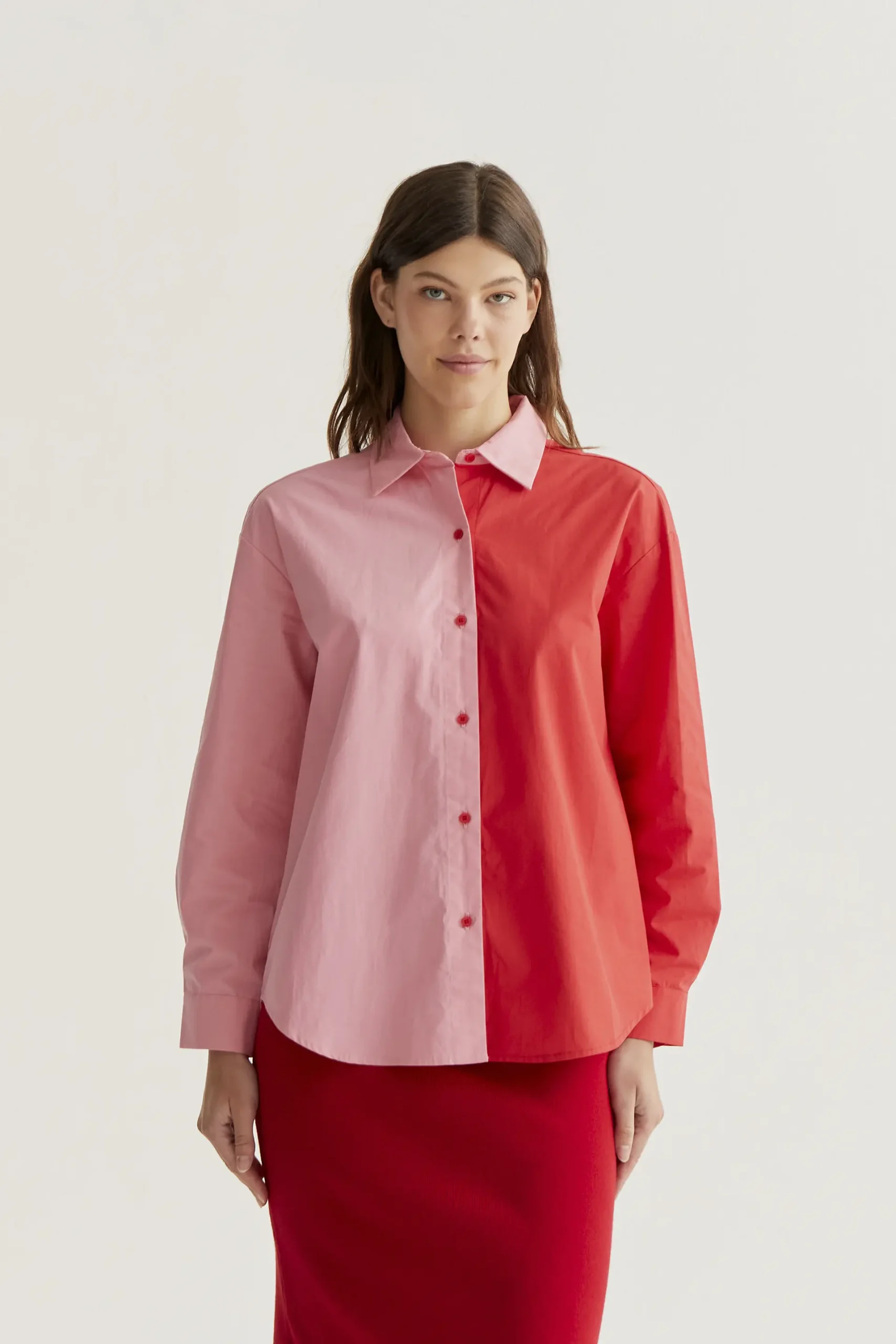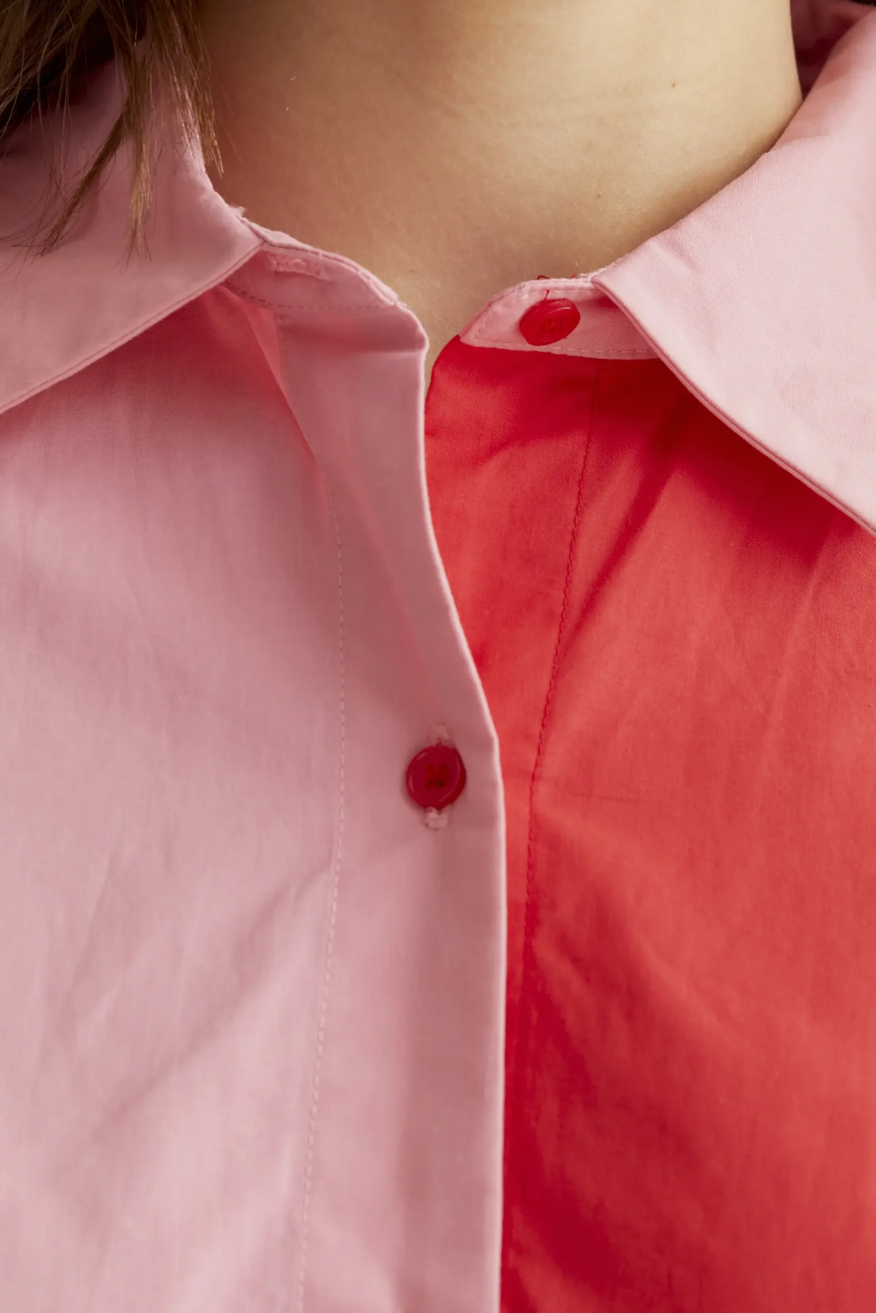 Camisa con tejido 100% algodón de color bicolor rosa y rojo. Cuello solapa y manga larga terminada en puño con botón. Cierre frontal con botones de color rojo. Hombro ligeramente caído. La modelo mide 177 cm y lleva la talla S.