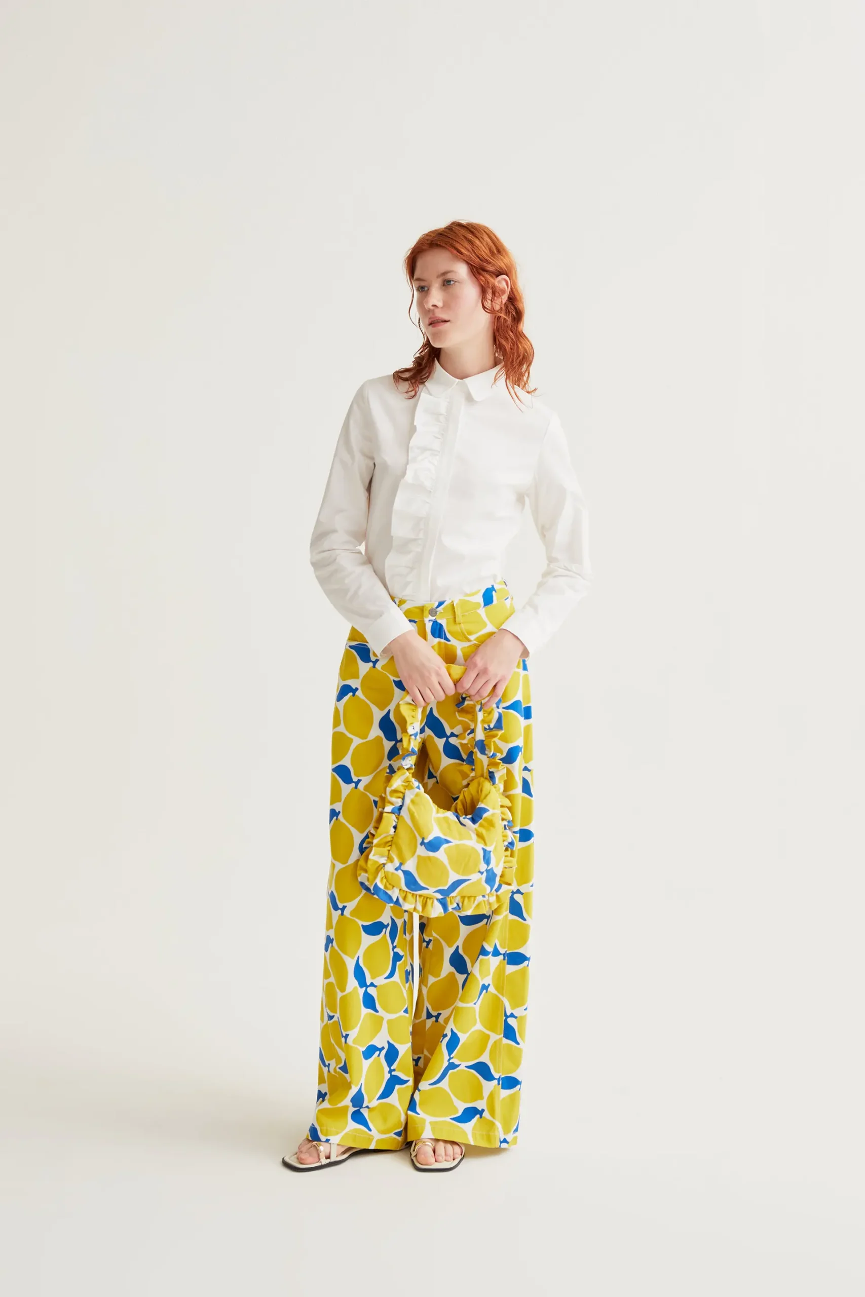 Camisa de tejido 100% algodón de color blanco. Cuello con solapa y manga larga terminada en puño con botón. Cierre frontal con botones ocultos. Detalle decorativo de volante. La modelo mide 175 cm y lleva la talla S.