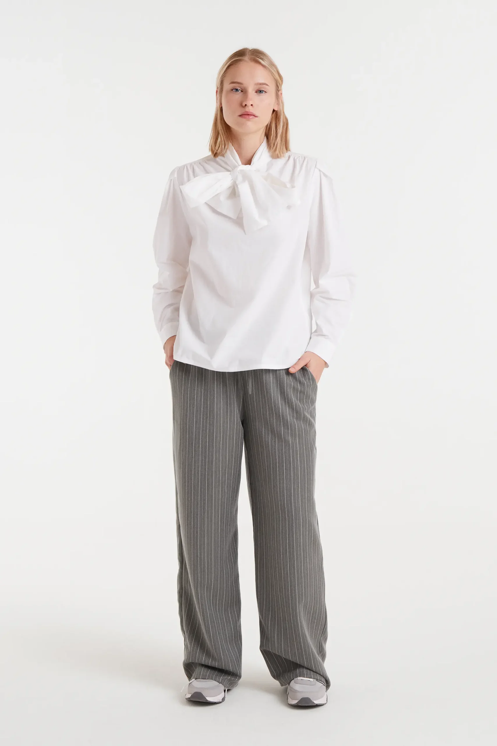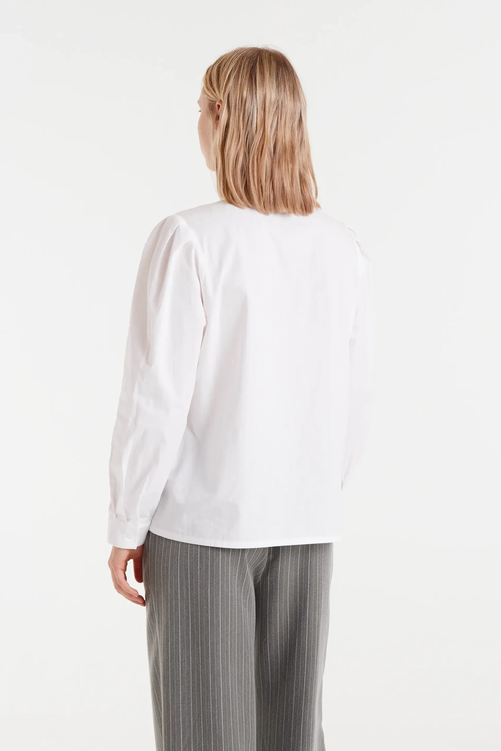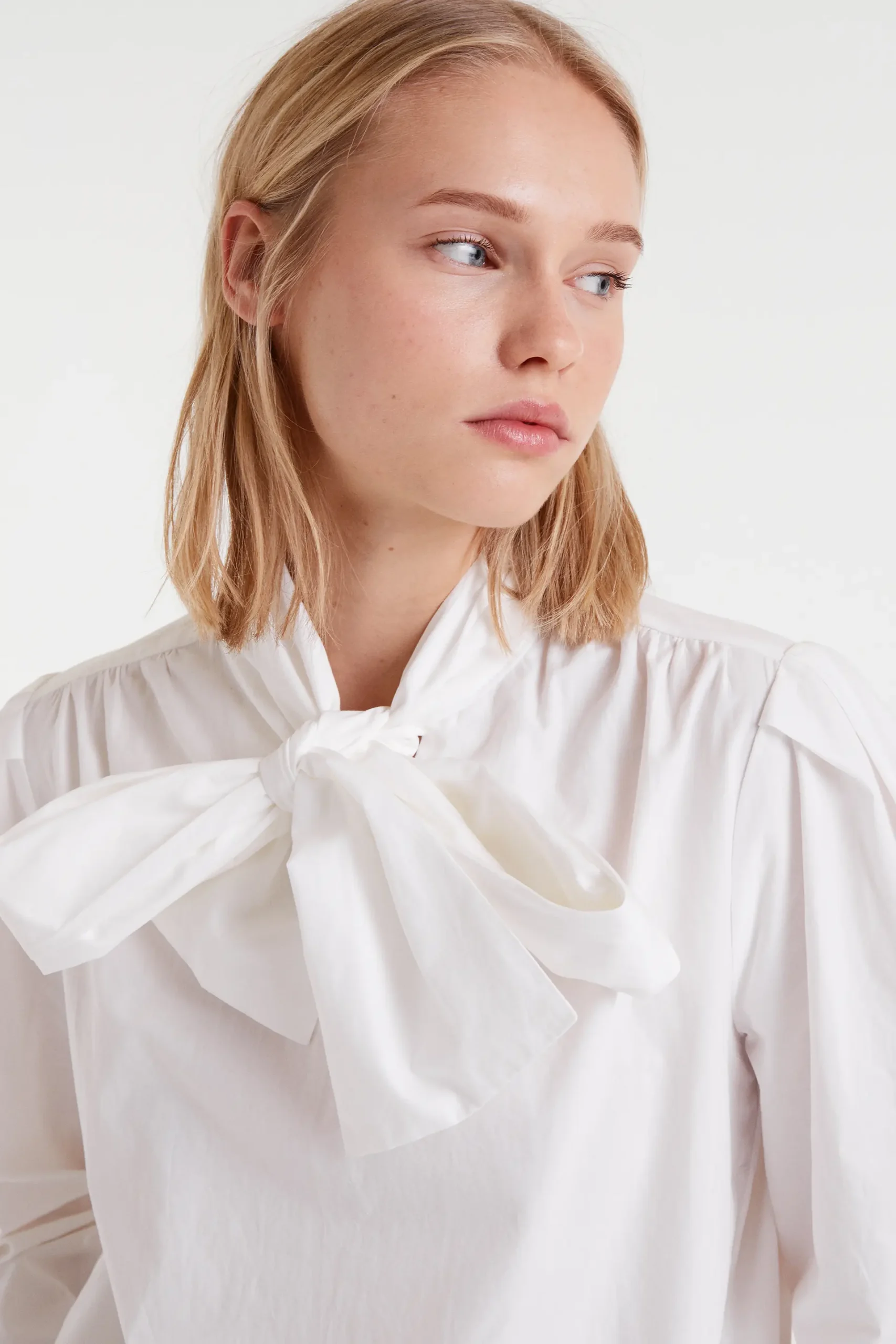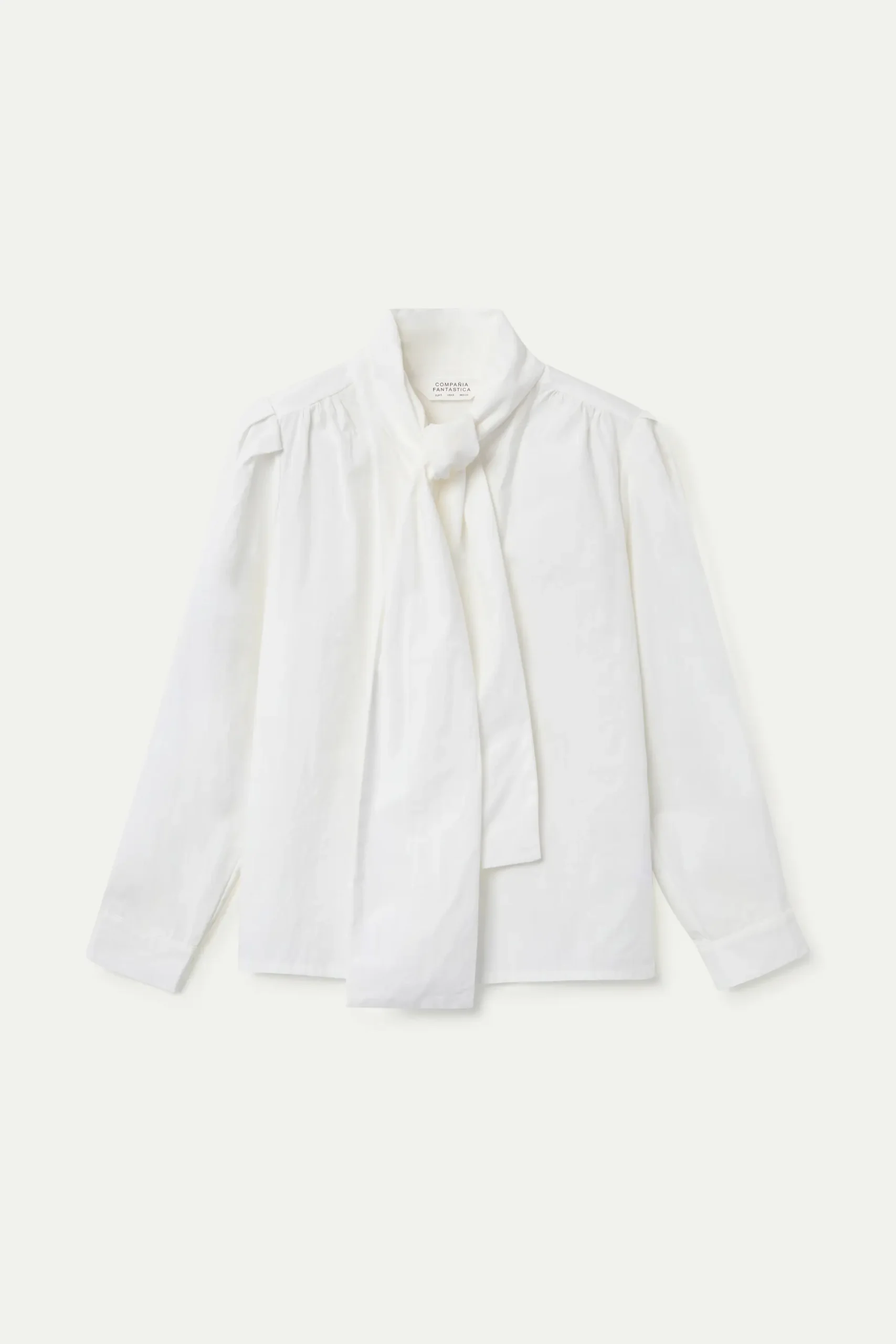 Camisa con tejido 100% algodón de color blanco. Con cuello lazado grande y manga larga terminada en puño con botón. La modelo mide 179 cm y lleva la talla S.